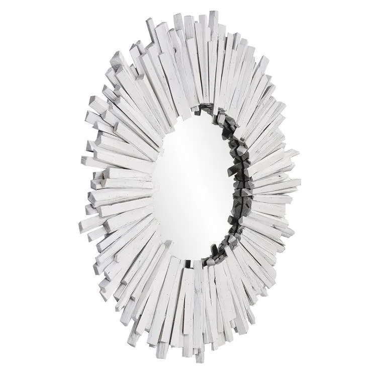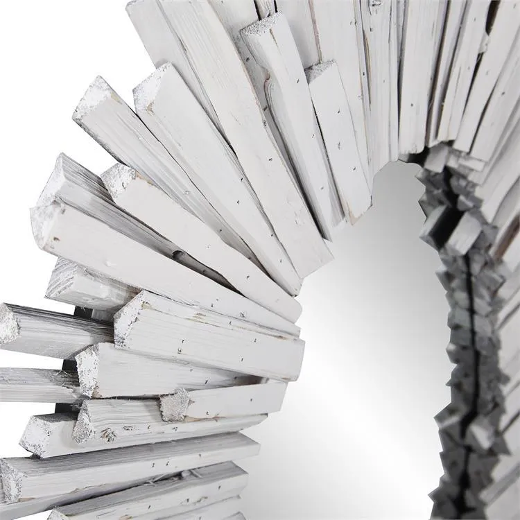 Inspired by coastal driftwood designs, our Durango Mirror features layers of wood pieces hand applied onto an oval frame surrounding quality clear mirrors. The varying lengths of wood slats are finished with a weathered white wash. "D" rings are affixed to the back of the mirror so it is ready to hang right out of the box. Also available in a round shape These whitewashed mirrors look totally at home in a comfortable coastal interior to a simple rustic country cottage.