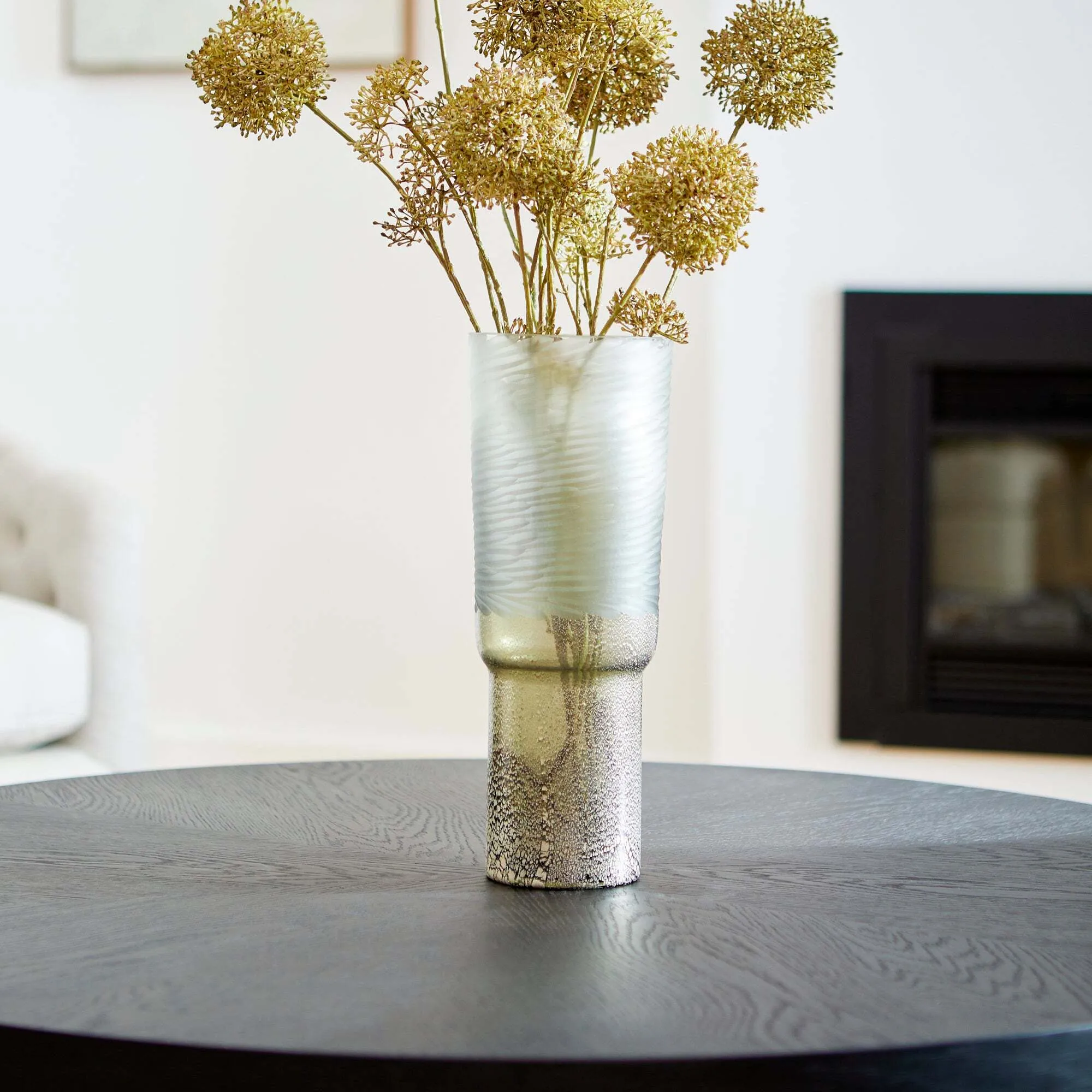 Variance in texture, tone, and size are what make the Canyonland vase standout from the rest. This reverse tulip-silhouette sports a gradient clear to gilded silver surface finish. Transitional versatility offers this vessel a place in any contemporary setting. Adorn your living room, entryway, or commercial lobby display with multiple Canyonland vases (available in three sizes) and top with a floral bouquet for an added natural touch.