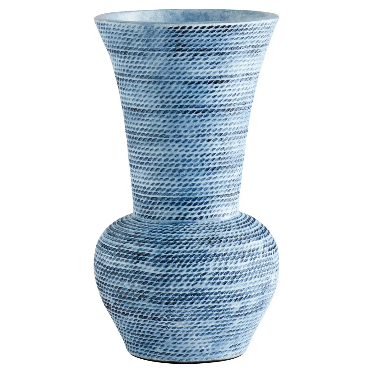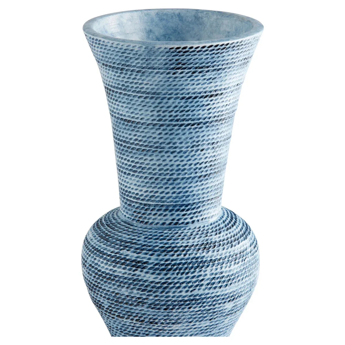 The jute-textured Hopewell collection of earthenware vases pays homage to the ancient tradition of cord-marked pottery. Handmade and rope-embossed, the Hopewells capture the identifiable pattern of rope through a blue glaze applied, accentuating the groove. Patterns of richly hued indentions cover a classic begonia-shaped body with a long neck and dramatically fluted rim. Enhance a covered patio, dining area or entryway with the Hopewell collection. Available in two sizes. Not water-tight.