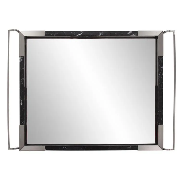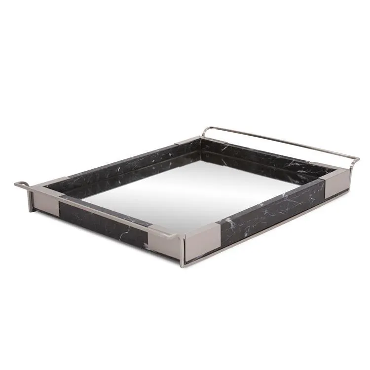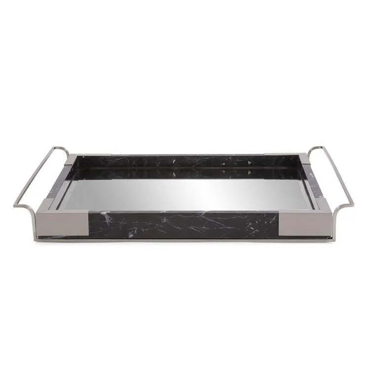 Simple, fluid lines of stainless steel combined with black marble was inspired by the timeless Art Deco era. Classic and contemporary converse to offer us this updated style for any decor. This Art Deco Marble Tray features a body of black marble trimmed in brushed stainless steel. What is truly striking is the mirrored surface of the tray.