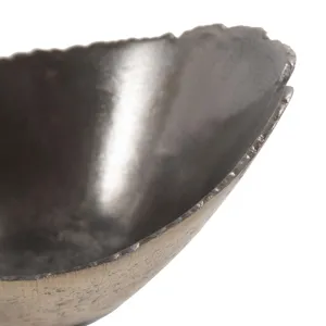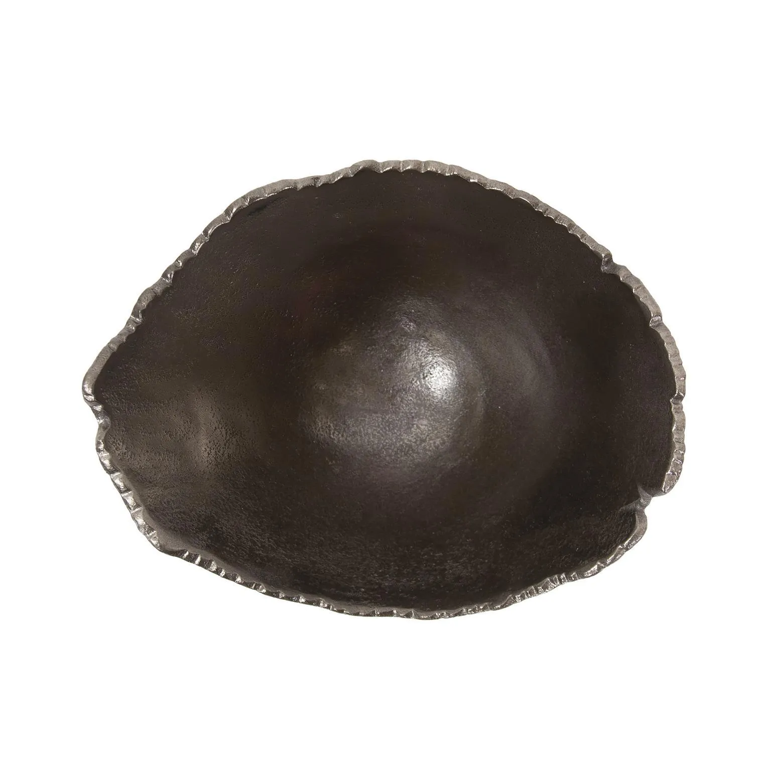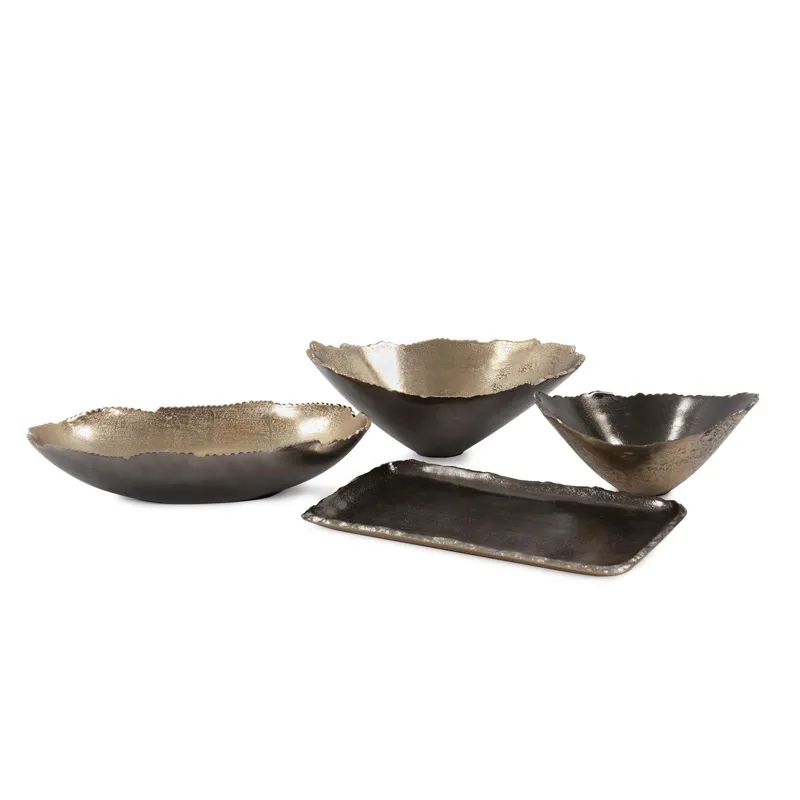 The Baniff collection features a unique cast aluminum design with a jagged edge and the combination of two colors and finishes. Whether used individually or in a collection, these pieces will compliment any decor from traditional to modern. The rich rustic textured gold outer finish is contrasted beautifully to the inner sleek sophisticated bronze. The deep sloped sides of this oval bowl makes it a treasured resting place for seasonal fruit or your favorite little bobbles.