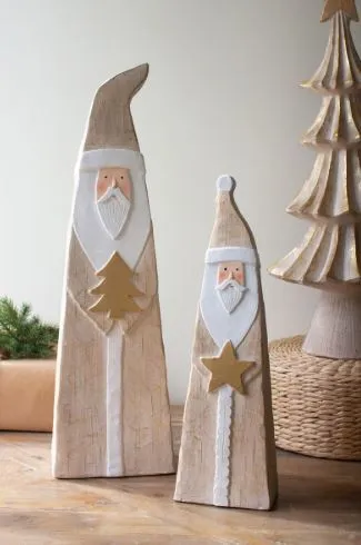 These painted resin Santas are perfect for the nativity. In creamy shades of white and tan, these Santas hold a Christmas tree and star. Gift the set or keep these neutral Santas for your mantle display.