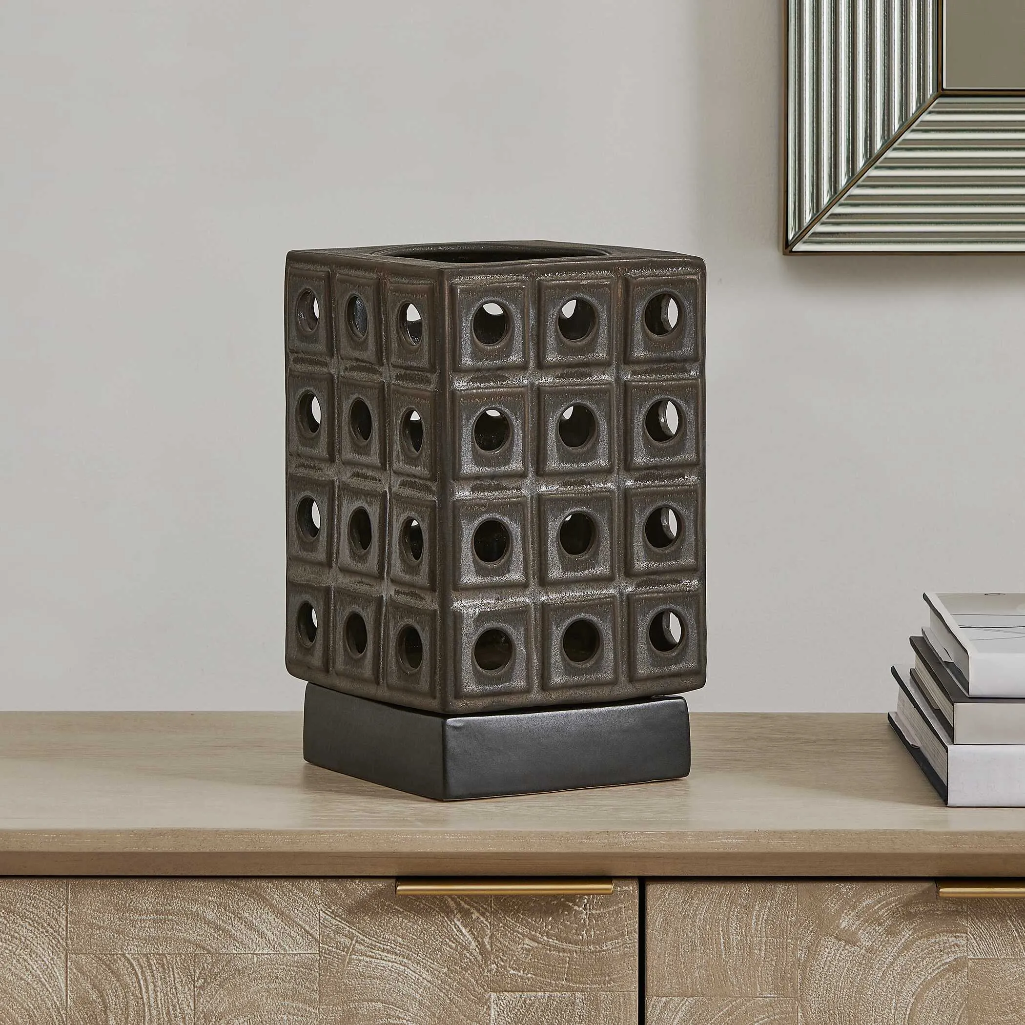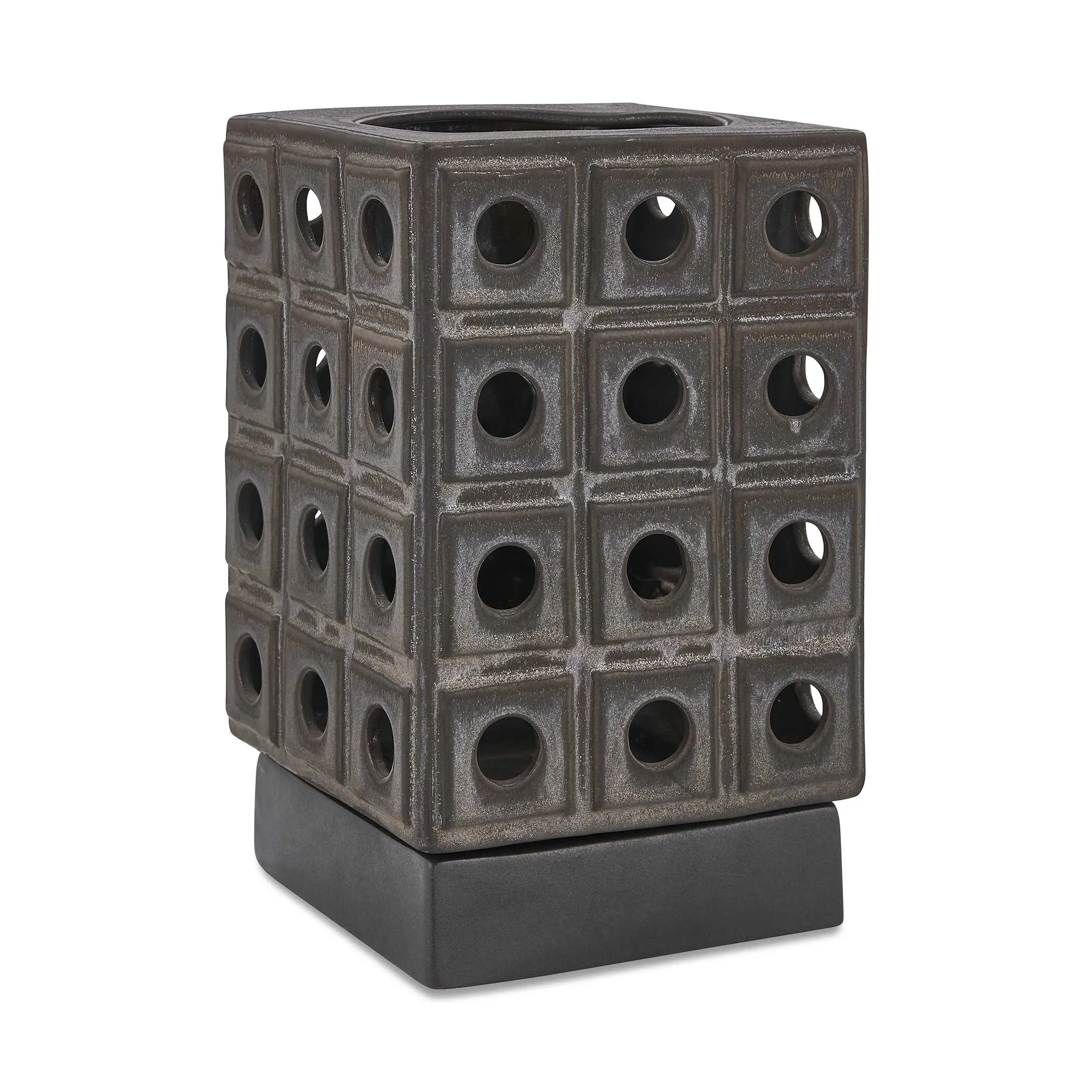This Sculptural Earthenware Candle Holder Features A Unique Design With A Modern, Architectural Design, Finished With A Distressed Brown Glaze, Revealing Rich, Dark Bronze Undertones For Added Depth. Safe For Outdoor Use, But Protection From Freezing Temperatures Is Recommended.