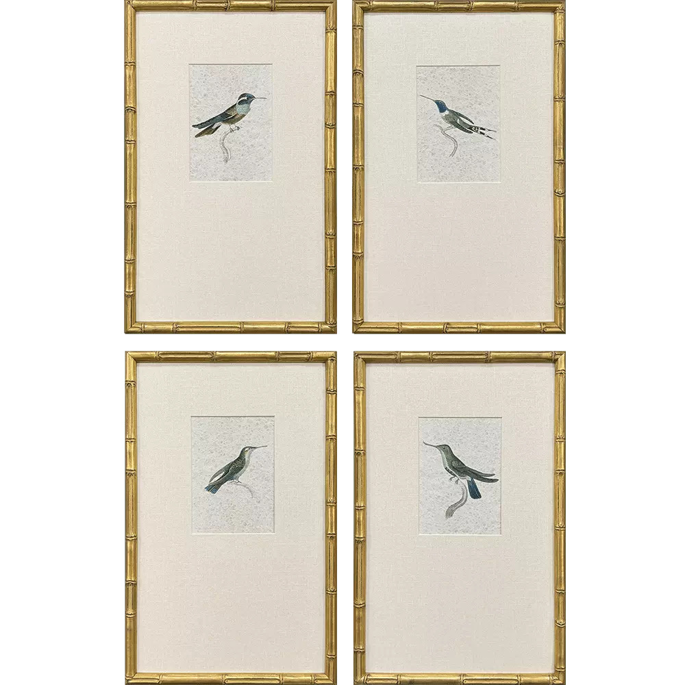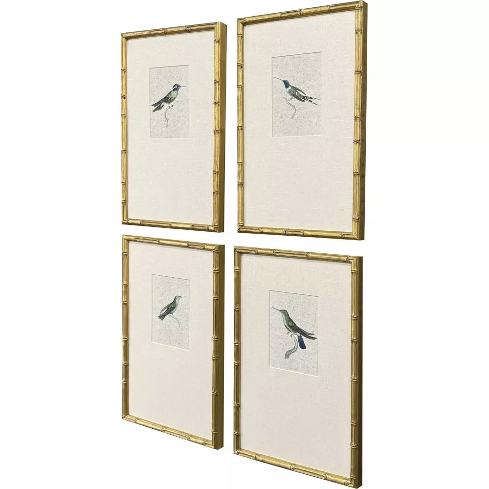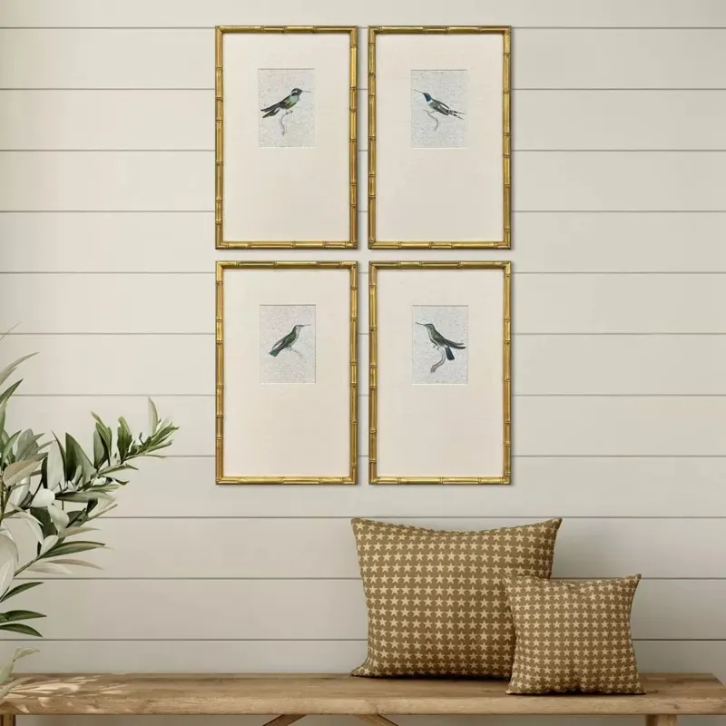 Vintage hummingbird imagery features offset premium matting. Framed in an antique gold finish wood with bamboo pattern embossing.