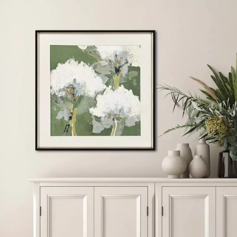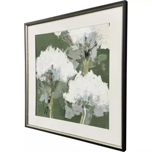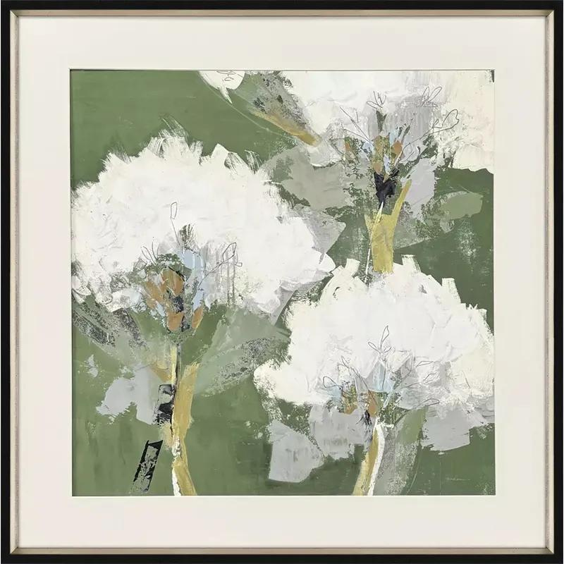 A profusion of large white floral blossoms is matted in light buff. Framed in a black painted wood with distressed silver leaf inner slope.
