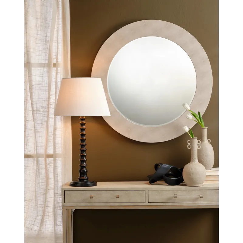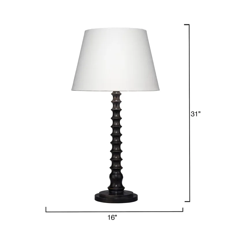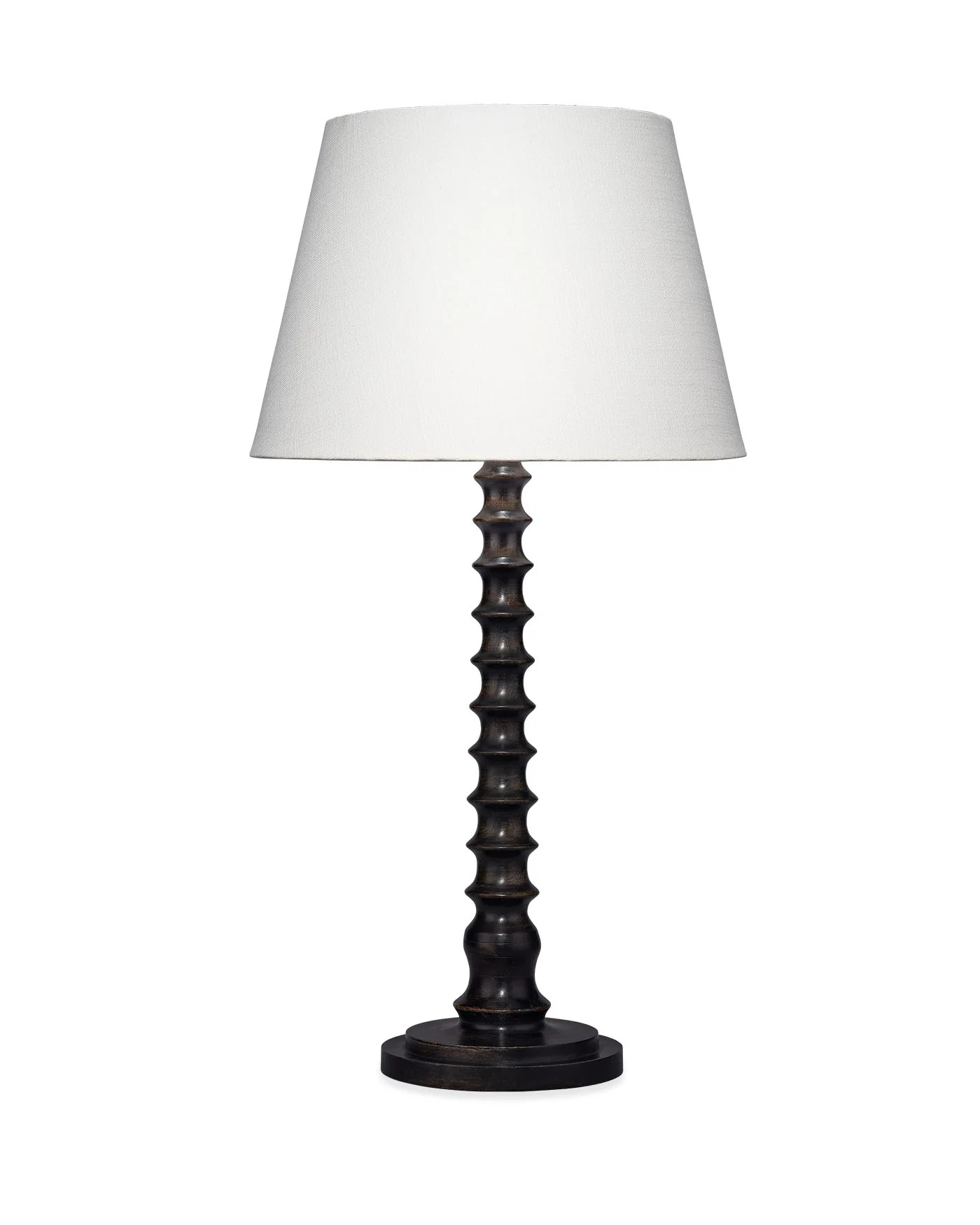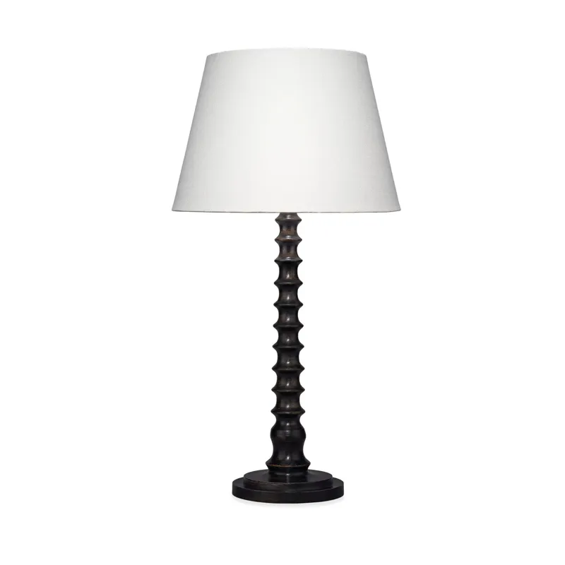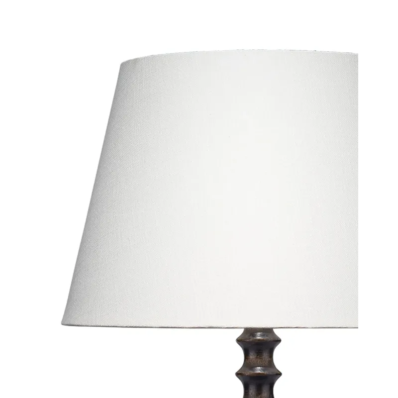 With its bold neutral palette, this quietly luxurious look is ideal for today’s interiors. The table lamp features a dramatically turned mango wood base in a stained black finish, and it is Topped with a tapered white linen slub shade. The easy, classic vibe is accentuated with quality, coordinating metal hardware.