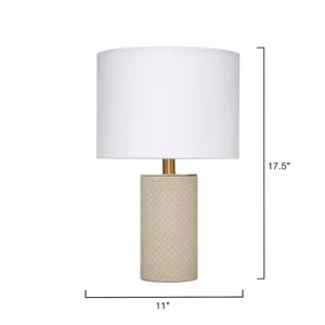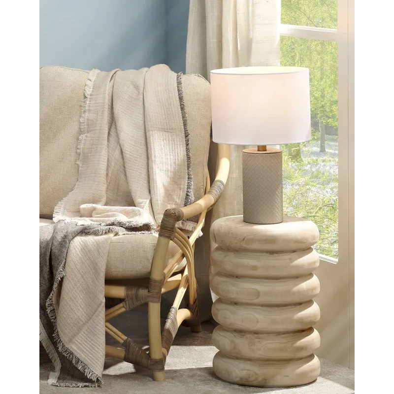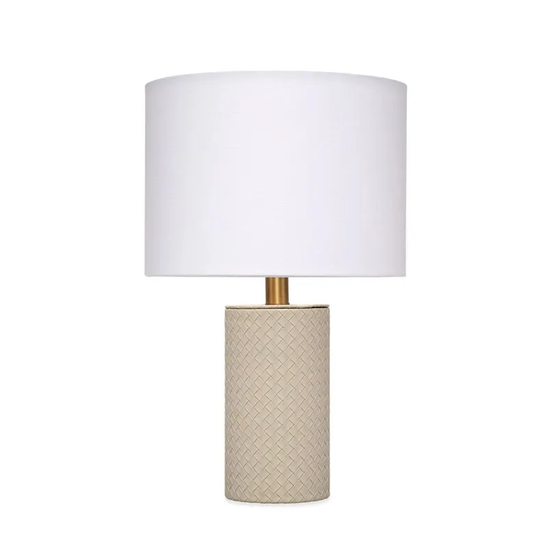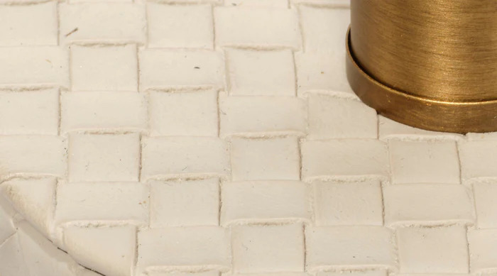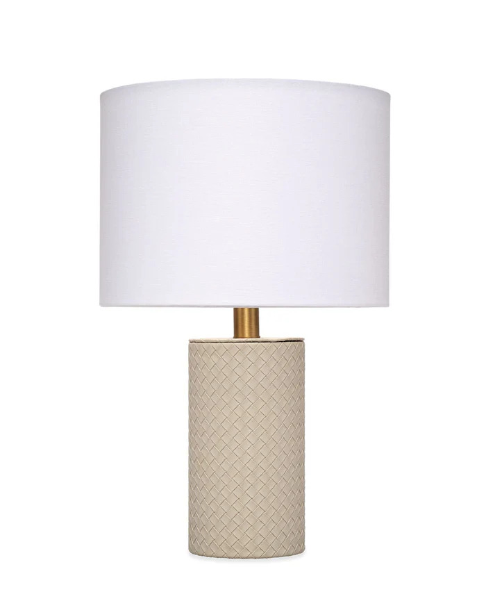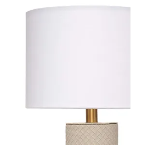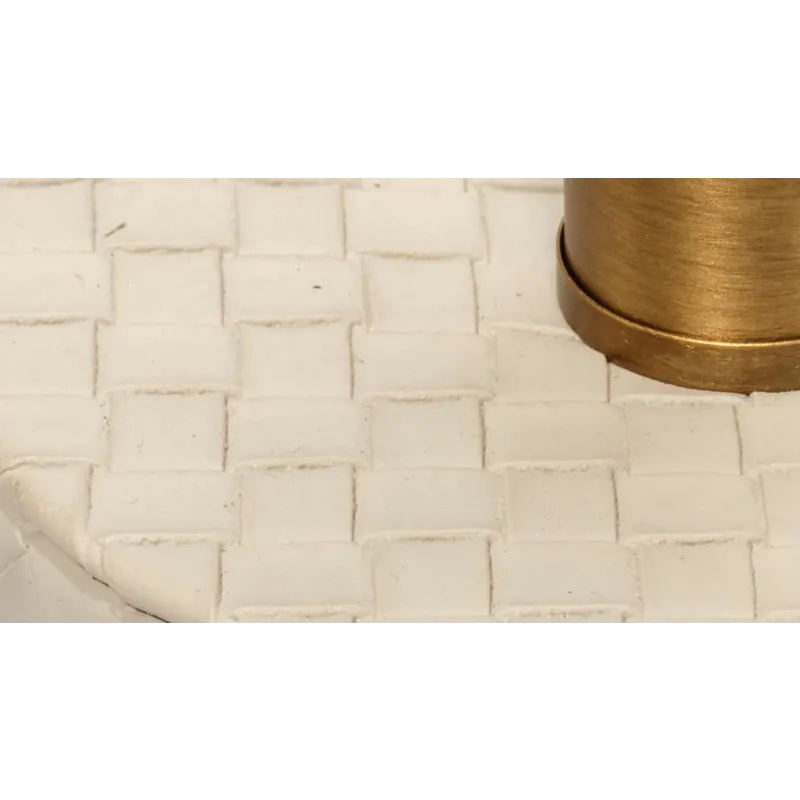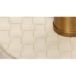Expertly woven from top-quality cream leather, the body of this sophisticated table lamp is expertly woven for a luxurious finish. The rich leather harmonizes beautifully with a clean white linen drum shade, while the burnished antique brass neck adds a touch of elegance. Inspired by Italian fashion, these lamps are the perfect accent for any urban loft.
