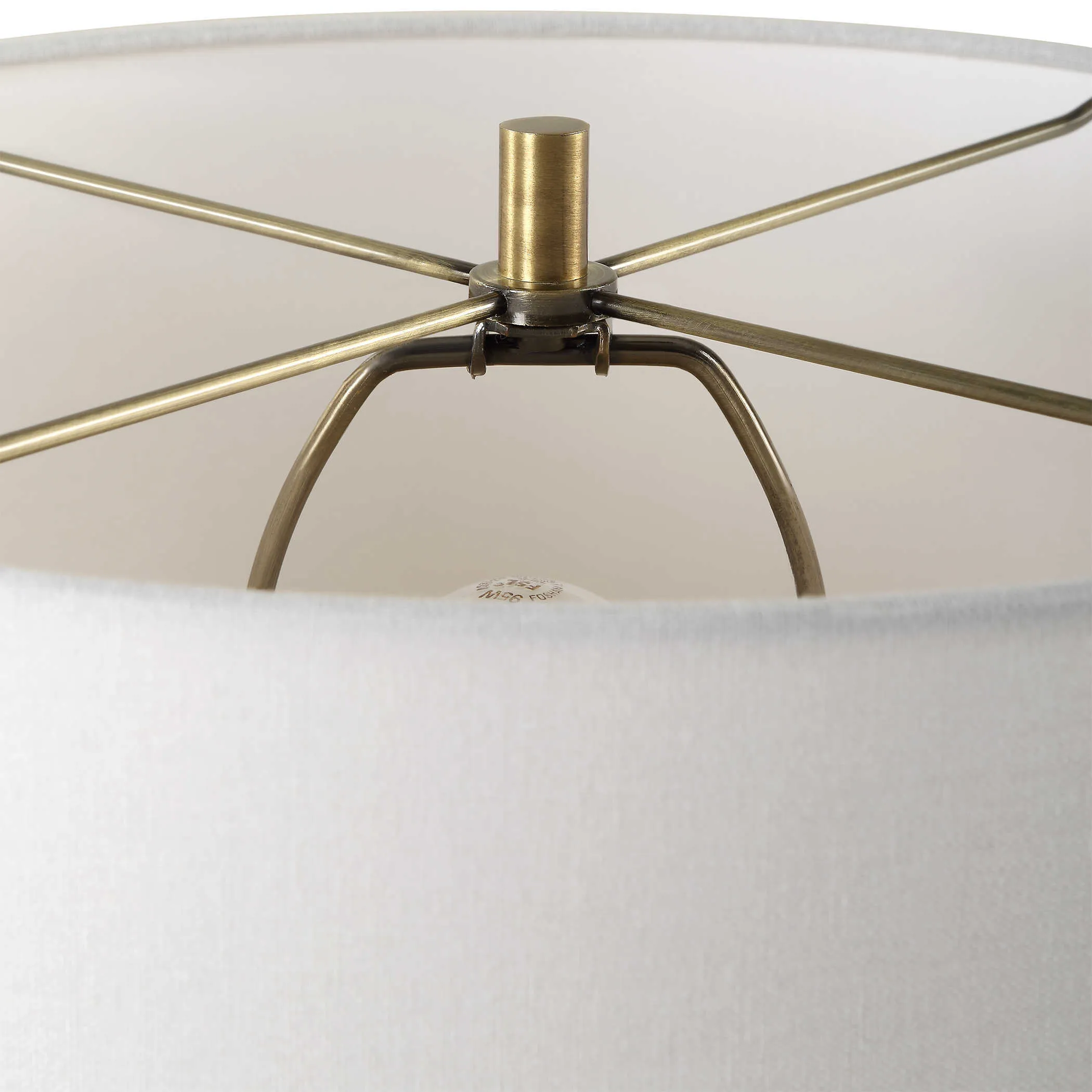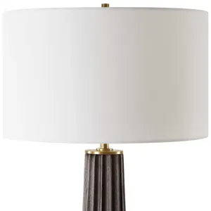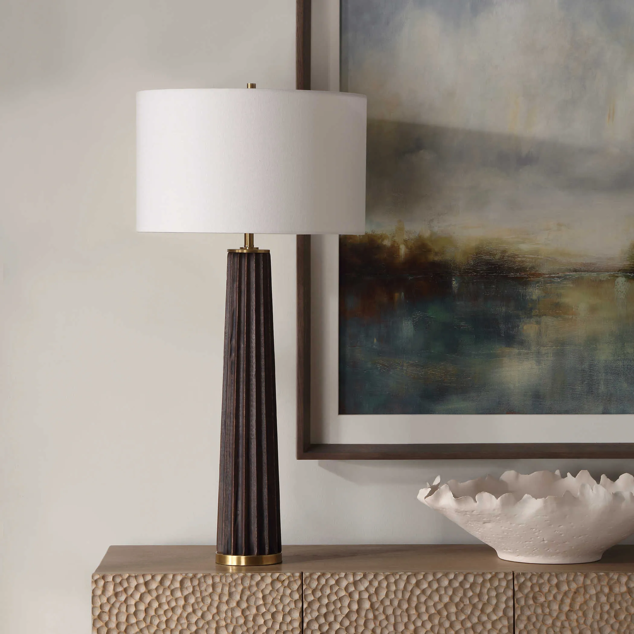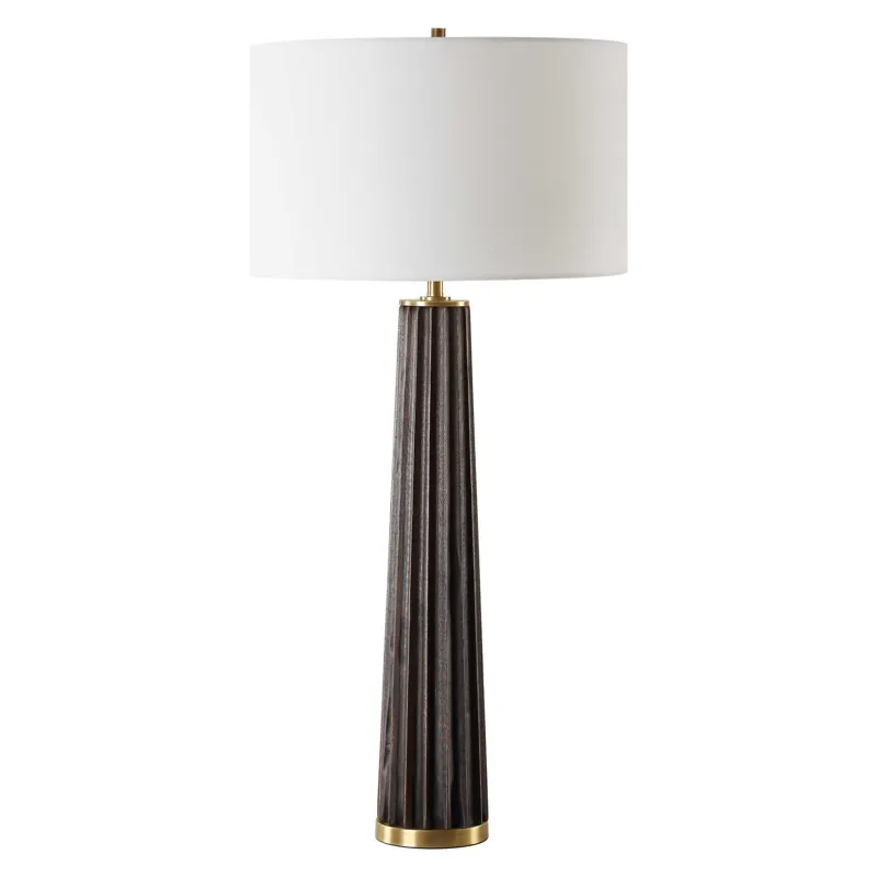 Bringing the warmth of nature indoors with its dark stain oak wood base, elegantly adorned with scalloped edges. Accented with plated antique brass finishes, this lamp infuses any space with a touch of rustic charm and a dash of sophistication. The round hardback drum shade is a white linen fabric.