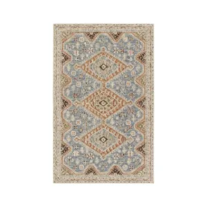 The hand-tufted Cardamom collection boasts vivid jewel tones and uniquely distressed Turkish motifs, crafted to emulate traditional sun-faded, vintage designs. The Jensine rug showcases an open, vine motif in a mix of subdued hues of blue, green, beige, and light brown. Inspired by the artistic imperfection of dye-lot changes in perfectly aged wool textiles, the looped pile of this rug features tonal colorway depth and textural dimension.