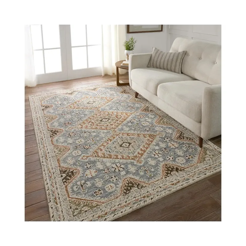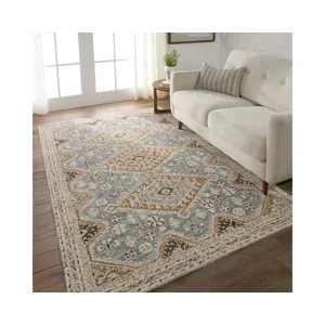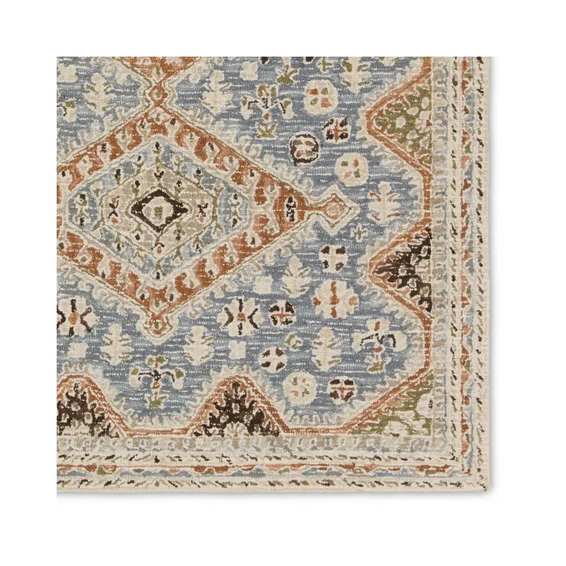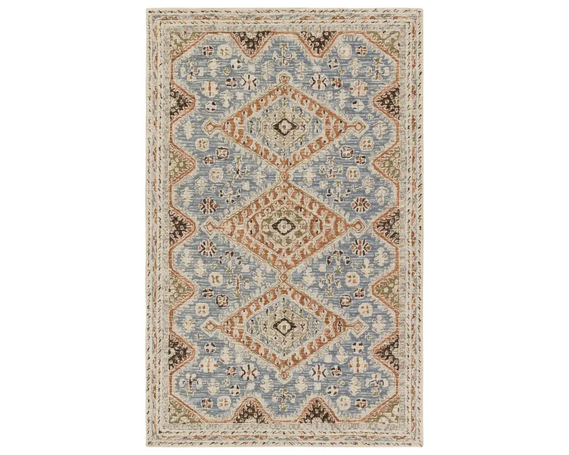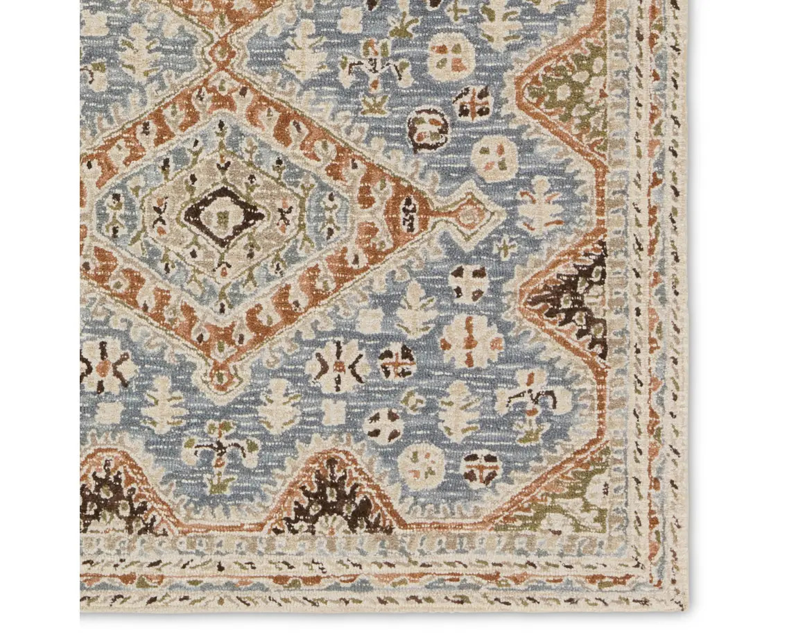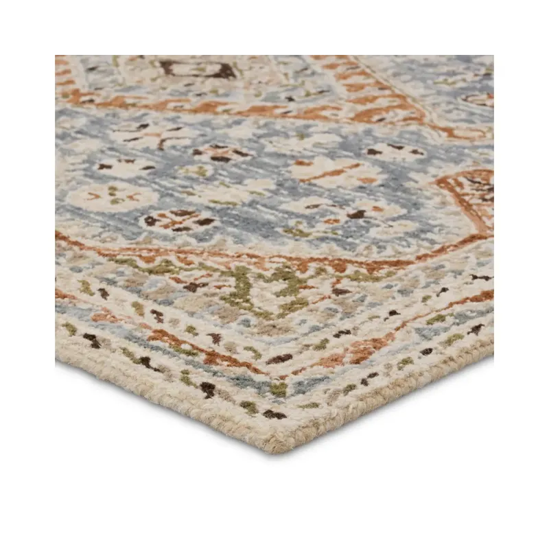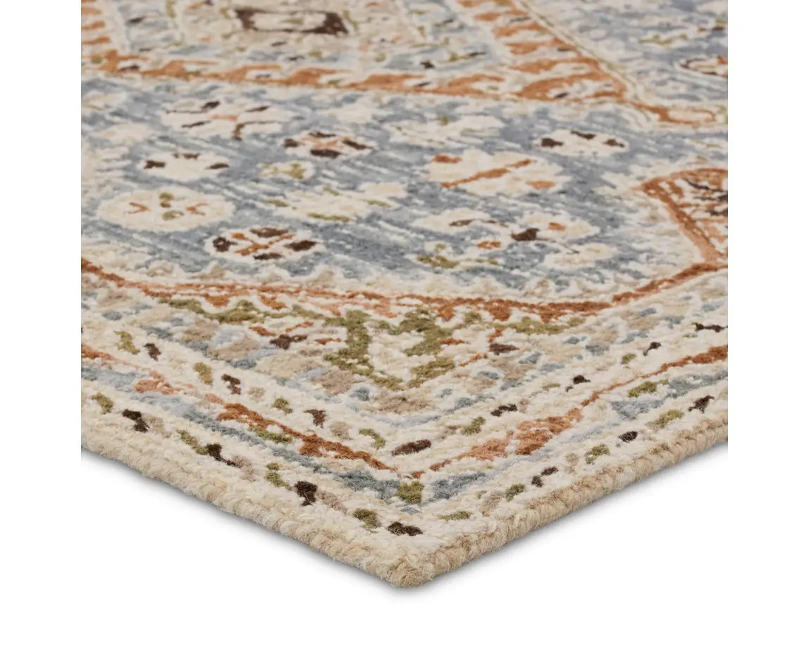 The hand-tufted Cardamom collection boasts vivid jewel tones and uniquely distressed Turkish motifs, crafted to emulate traditional sun-faded, vintage designs. The Zascha rug showcases a triple medallion pattern in a verdant palette of blue, brown, slate, olive, ivory, and taupe. Inspired by the artistic imperfection of dye-lot changes in perfectly aged wool textiles, the looped pile of this rug features tonal colorway depth and textural dimension.