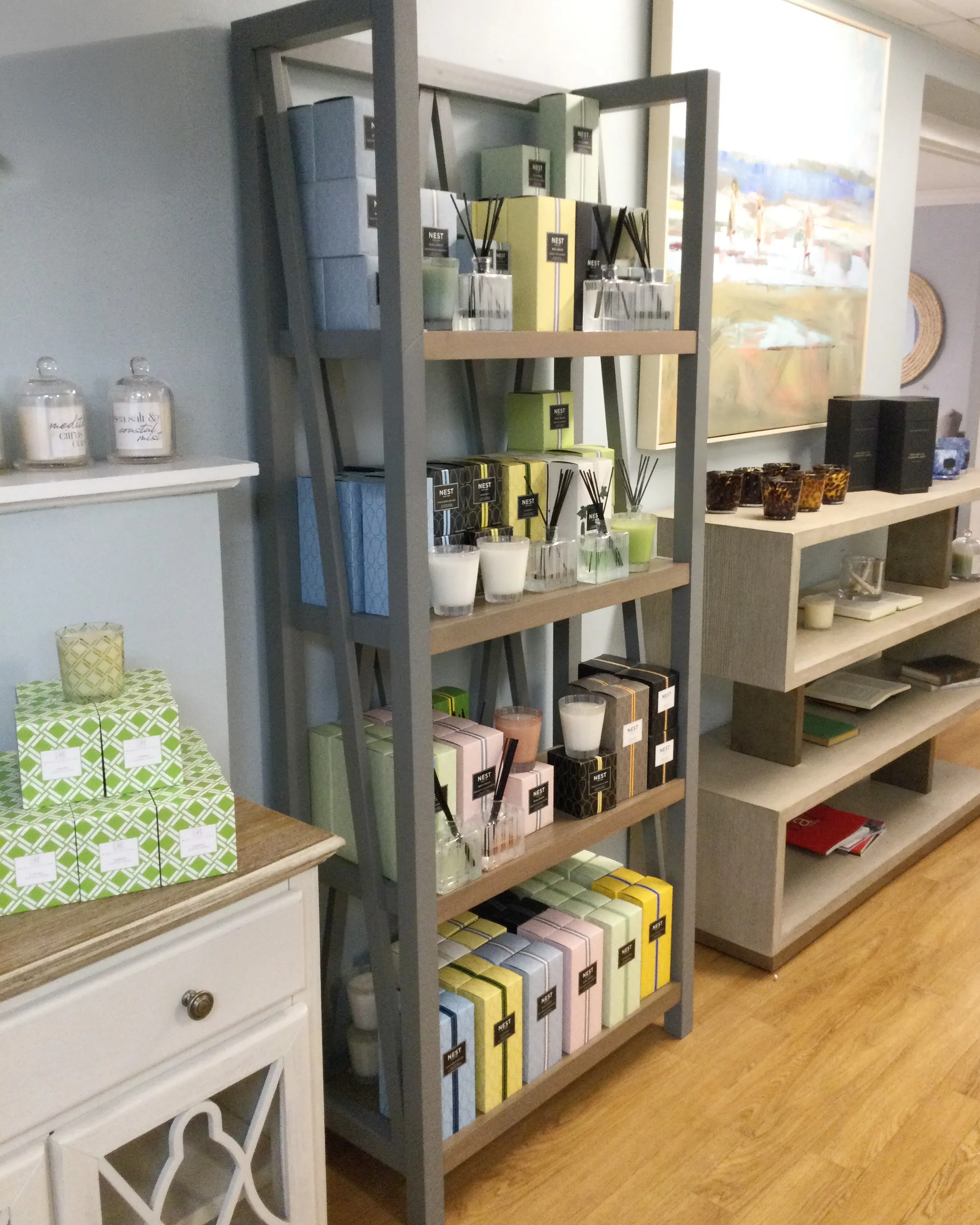 - Custom Painted Finish with contrasting Weathered Natural wood shelves