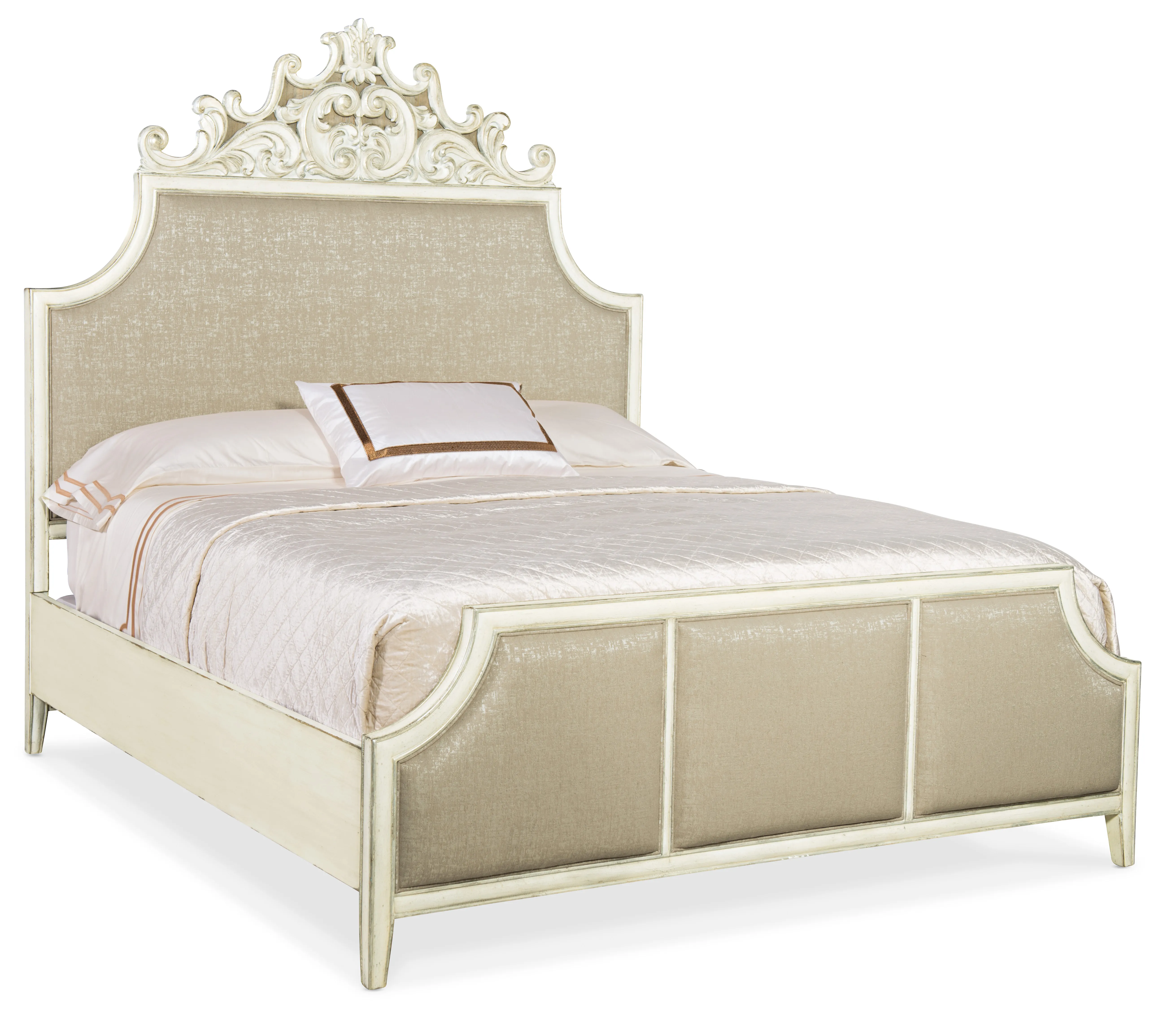 Timeless yet artfully modern, the breathtaking Anastasie King Bed is right out of a romance novel with historical reproduction bones, giving it a charming European cottage feel. The creamy white finish is accented with champagne and silver tipping for a subtle, serene sparkle. The decorative carving on the headboard is removable. The soft, coordinating performance fabric of the headboard and footboard is upholstered in Glitter Pearl.