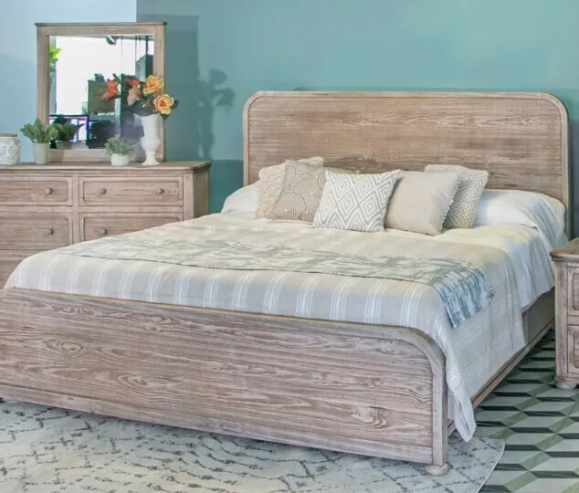 • Combining natural and timeless design elements creates a feeling of openness and warmth in your special place. This bedroom set features 100% solid pine, great durability, and value. • Solid wood tops are floated to allow for the wood’s natural movement • Wormholes effect on tops and hand brushed in the rest of every piece add character without affecting the integrity of the wood. • Multi-step hand-painted inspired by driftwood. • All-wood panels in the headboard & footboard. • Hand-turned legs offer stability and a sturdy look. • Wooden drawer knobs. • Mortise and tenon joinery on solid wood frames ensure stability and durability. • Solid wood drawers feature English dovetail joinery on drawer fronts. • Extension metal glides provide a durable and effortless glide. • Microfiber-lined top drawers on dresser and nightstand. • Available in Queen & Eastern King Sizes. • Stylish Platform bed frame includes 14 slats, leaving a 2” space between slats. • Box spring is NOT required.