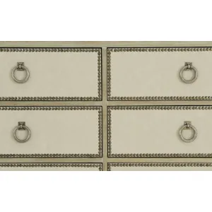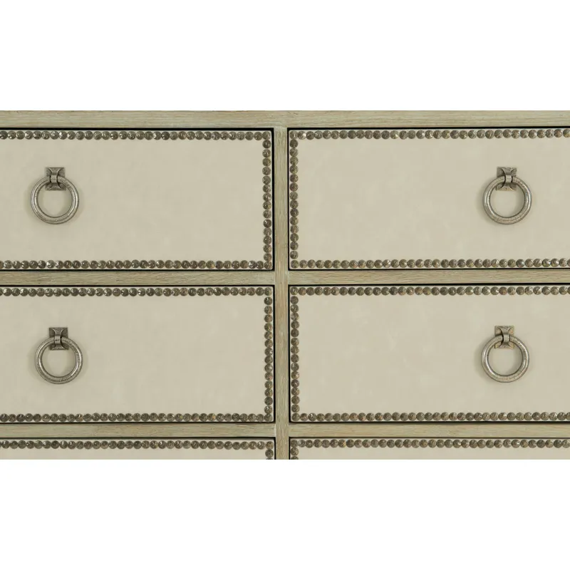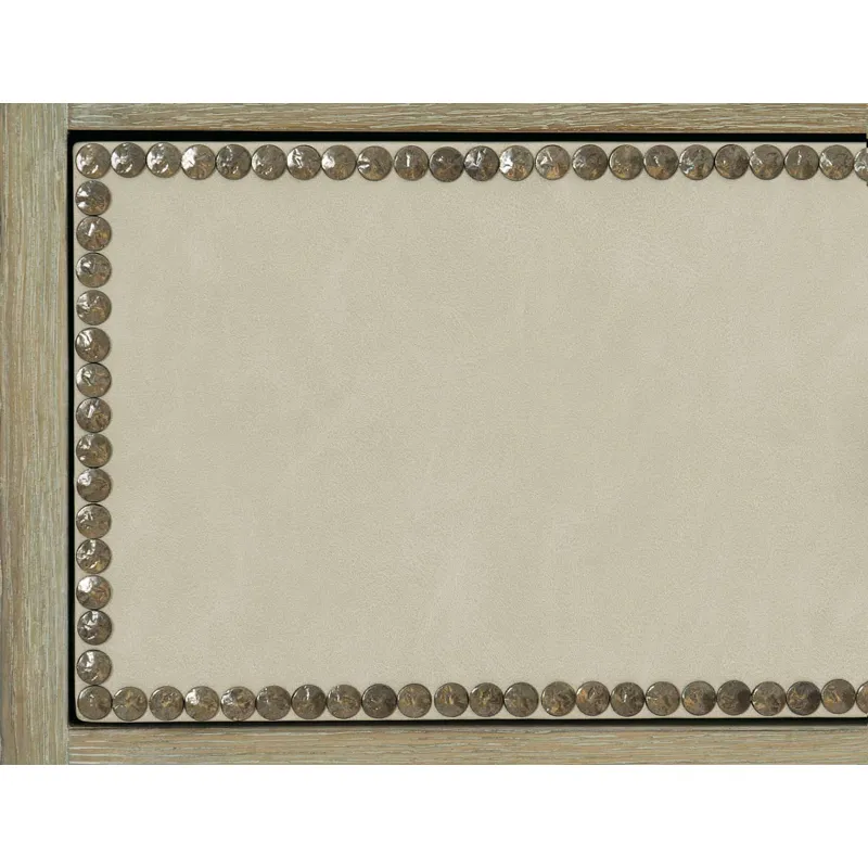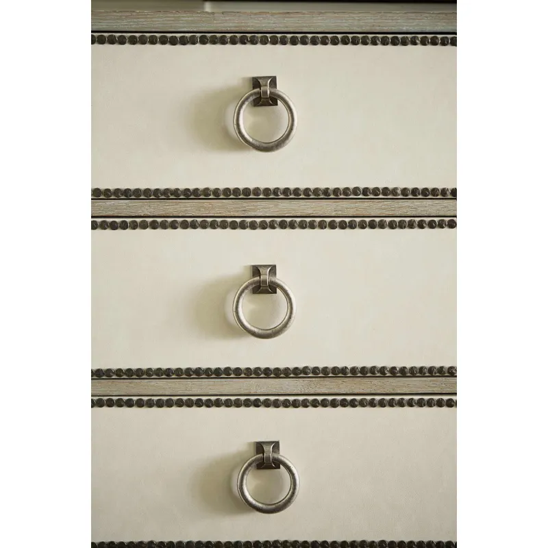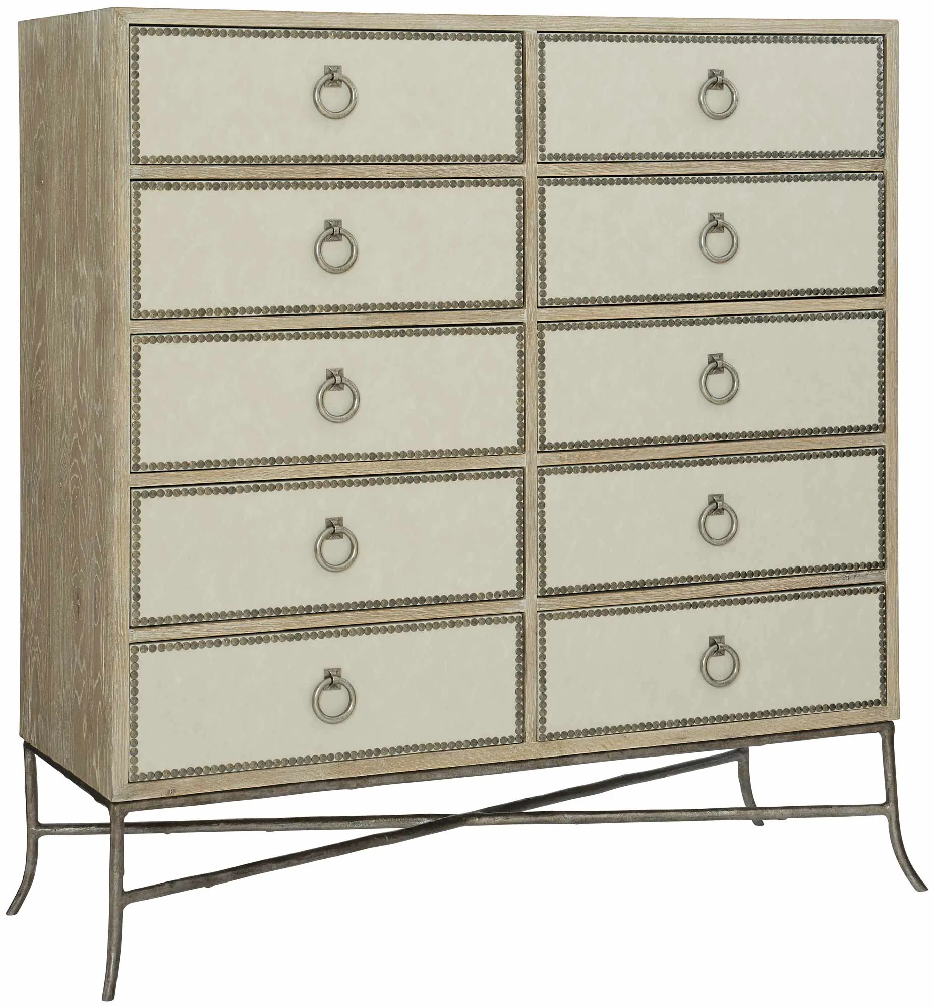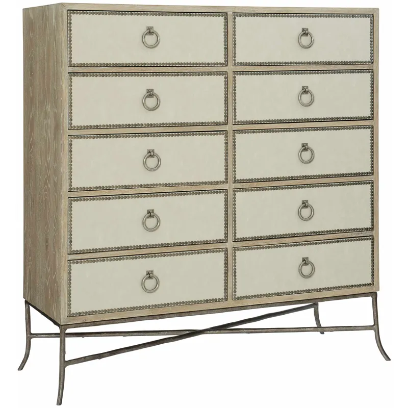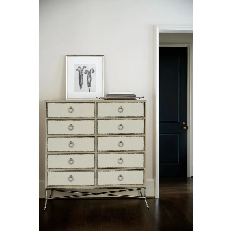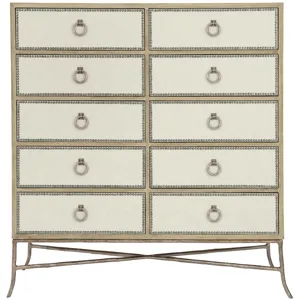 Ten drawers with performance fabric wrapped fronts with textured Black Nickel finish nail trim border