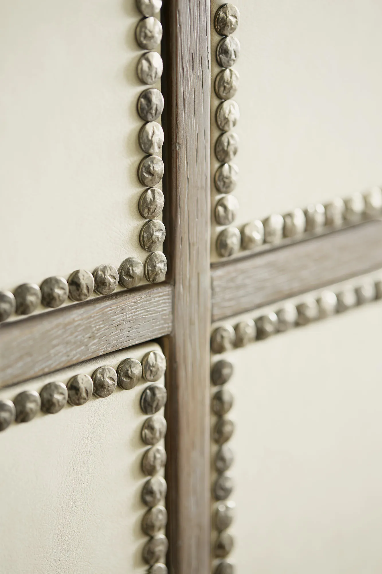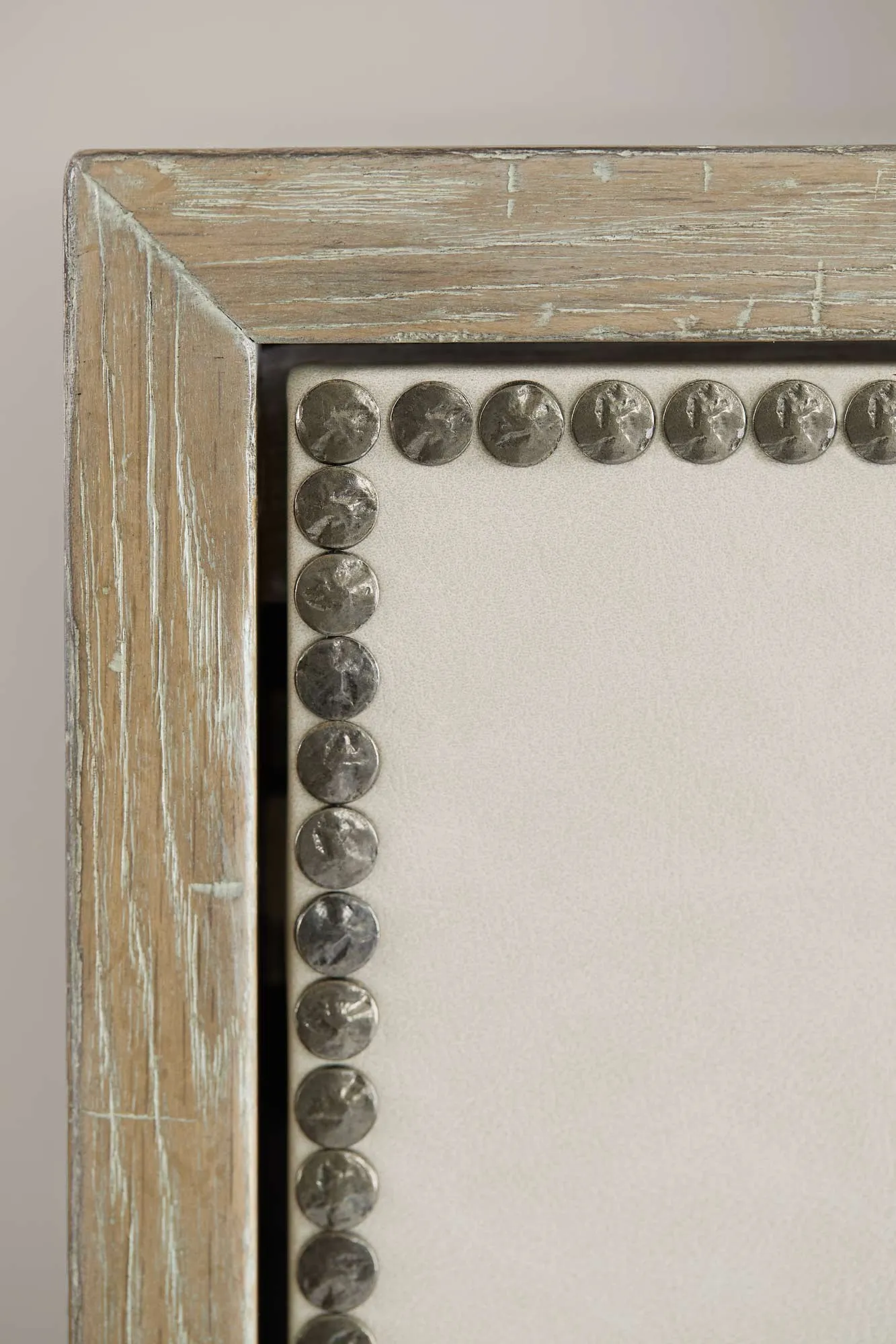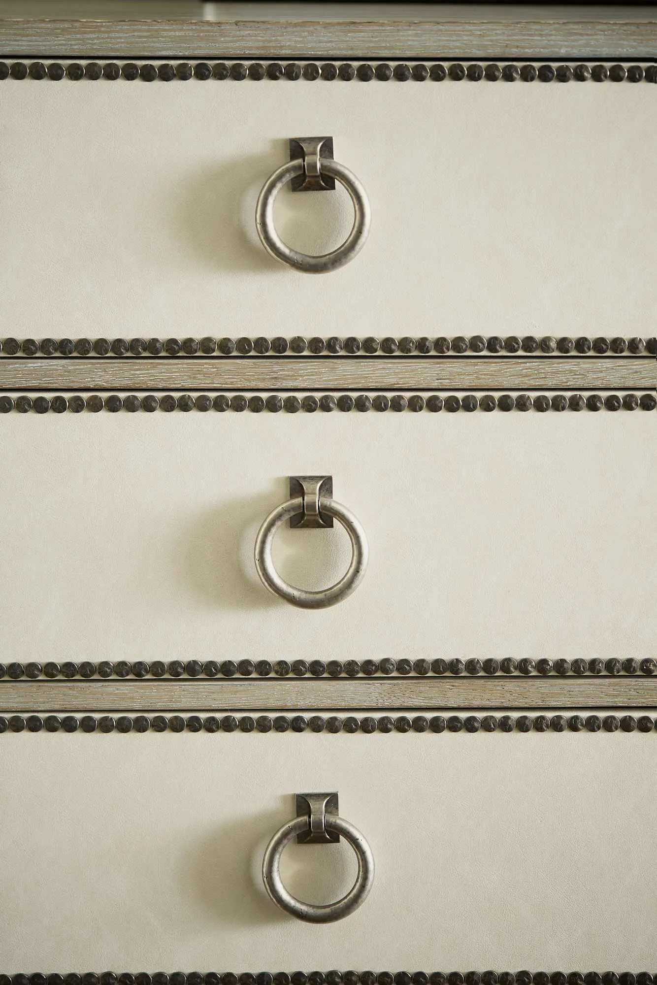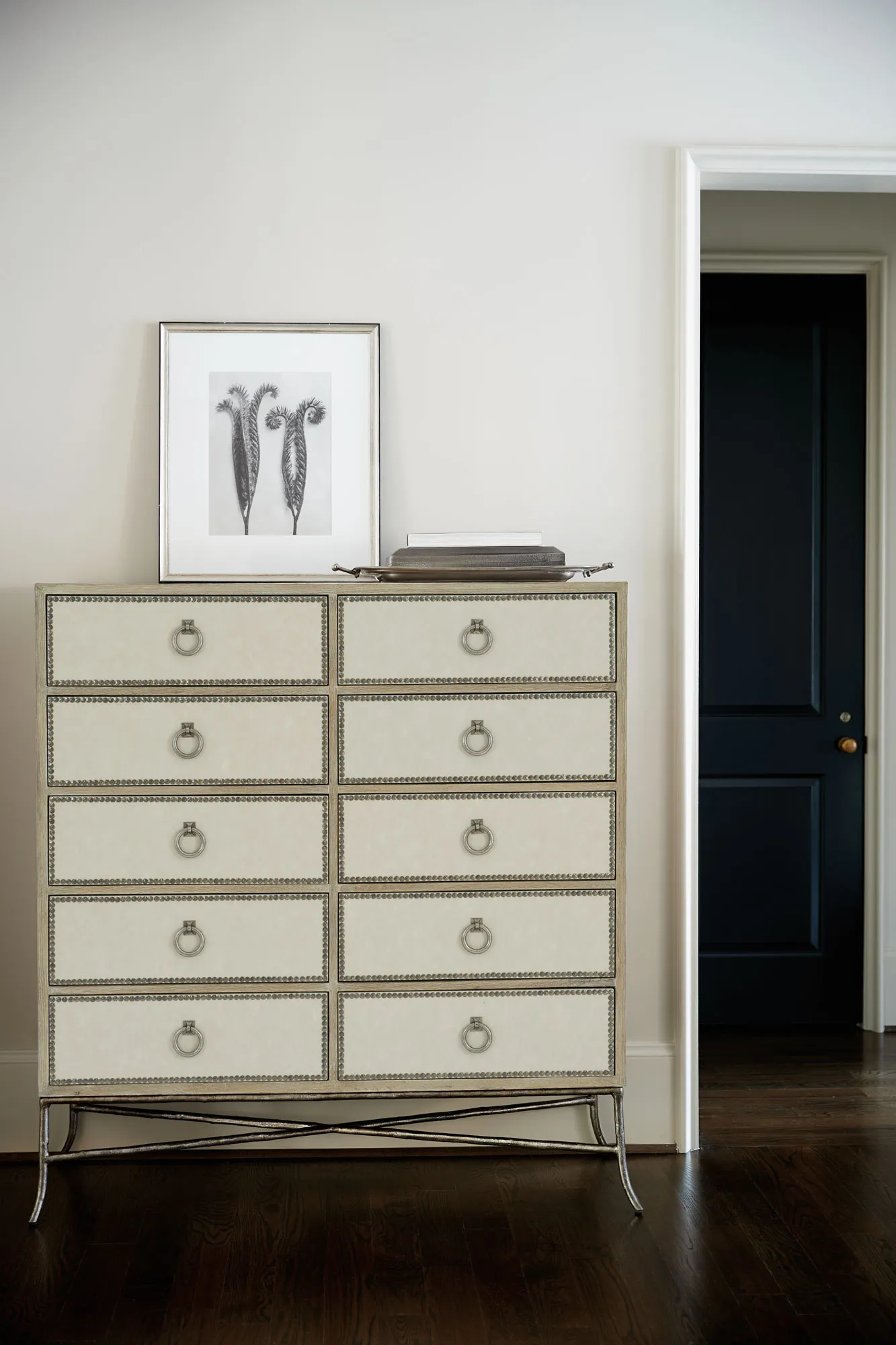 Ten drawers with performance fabric wrapped fronts with textured Black Nickel finish nail trim border