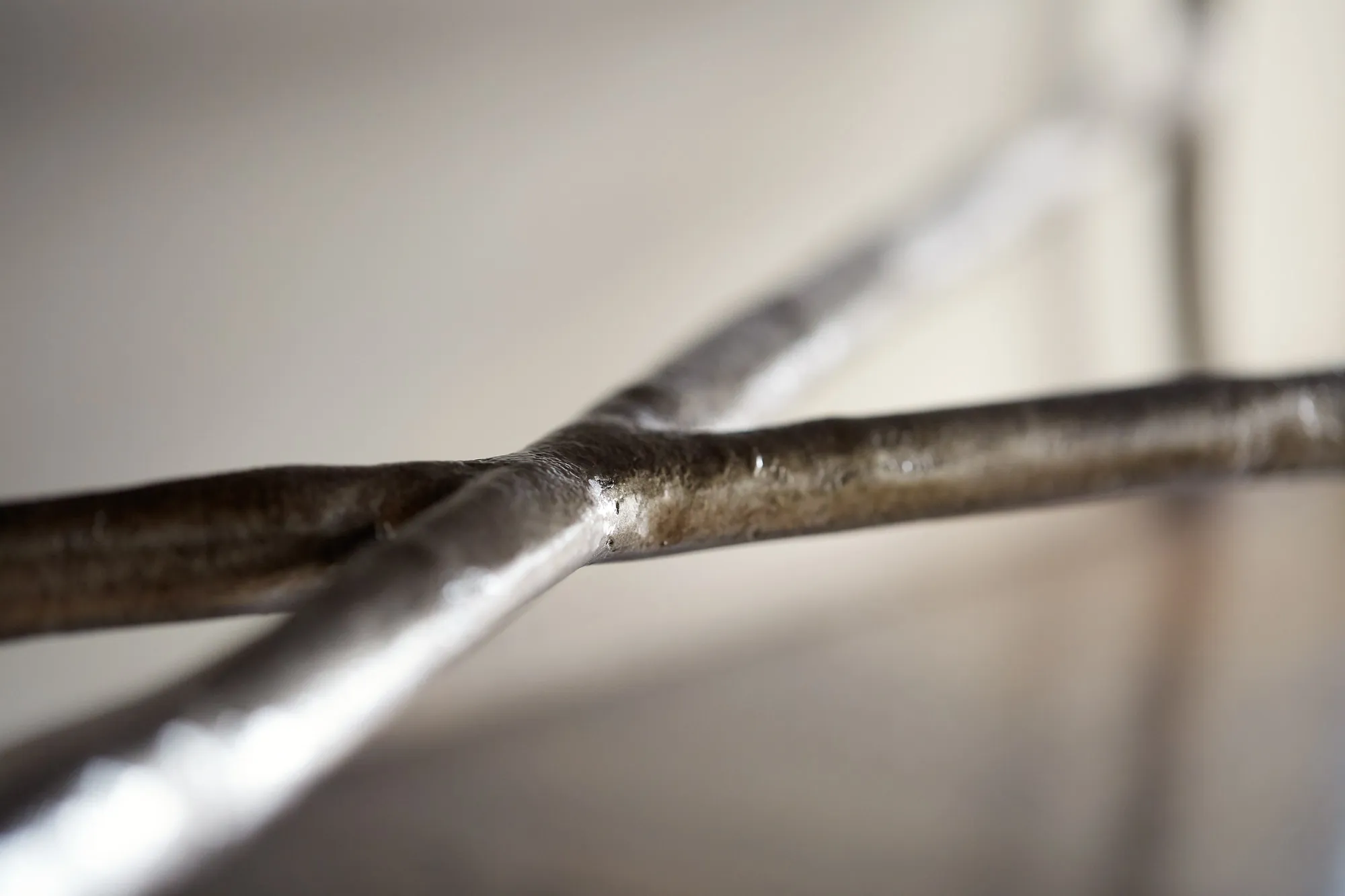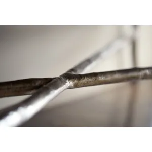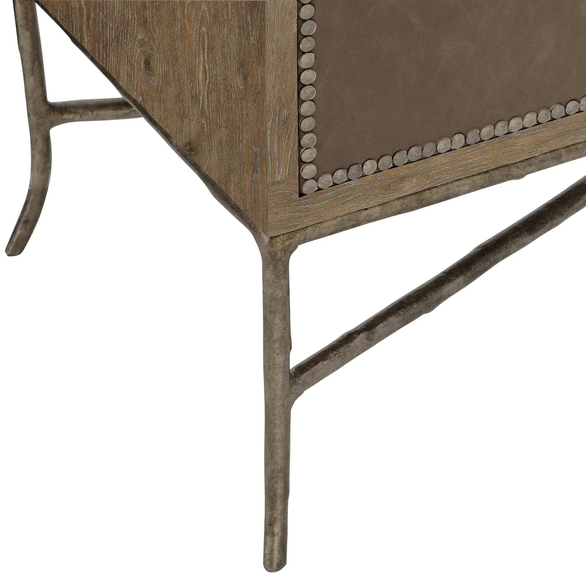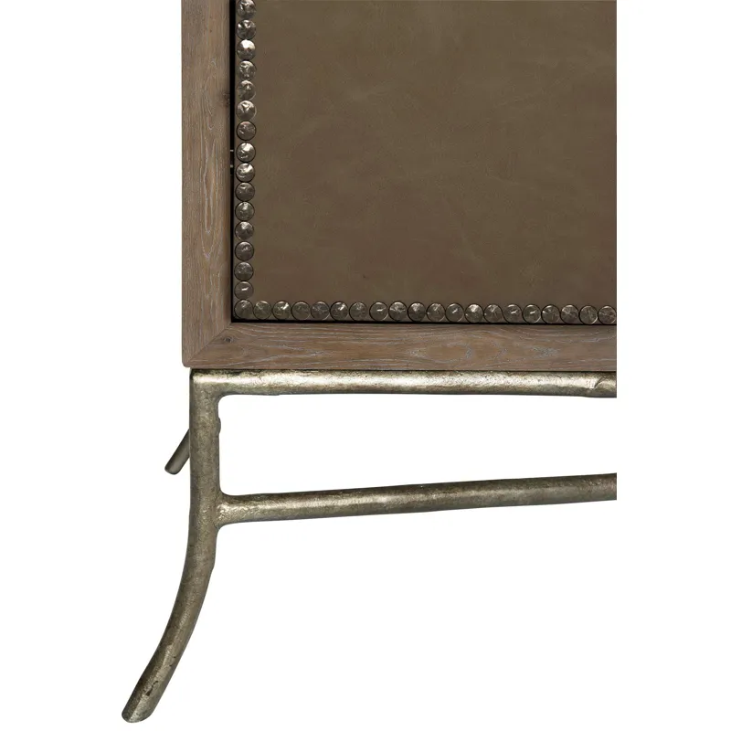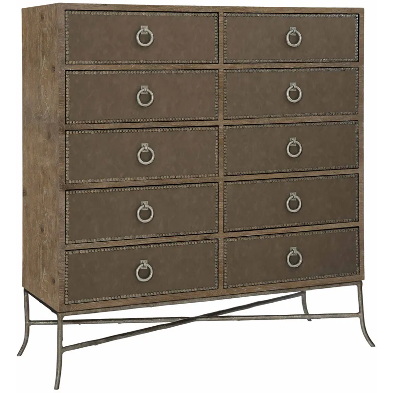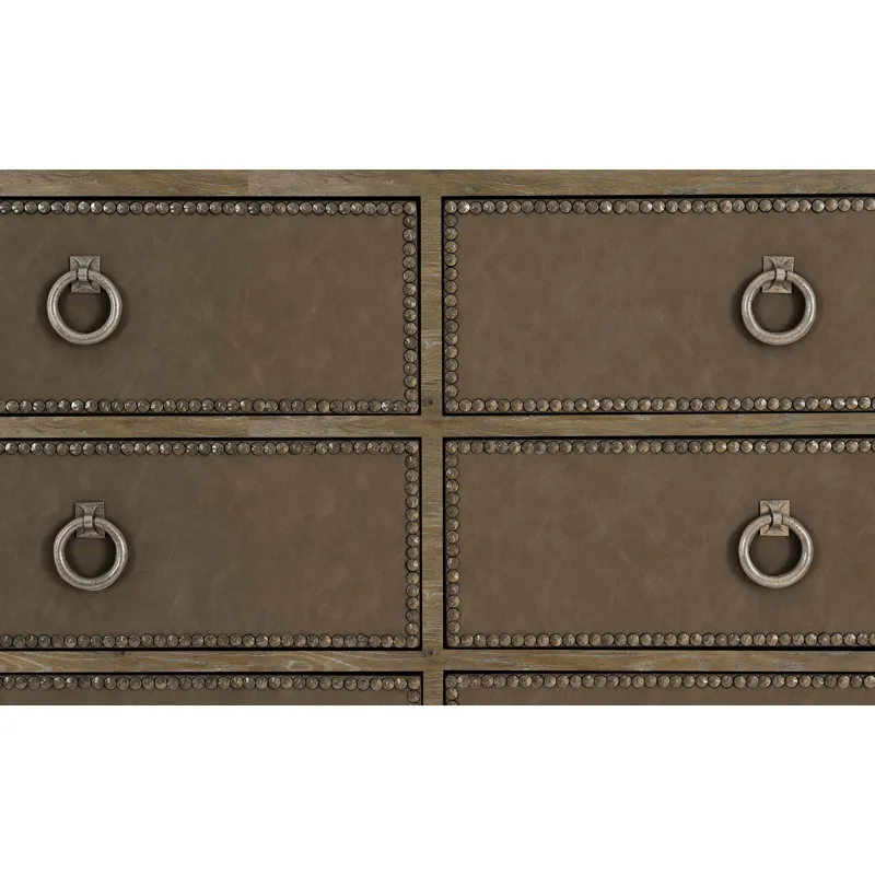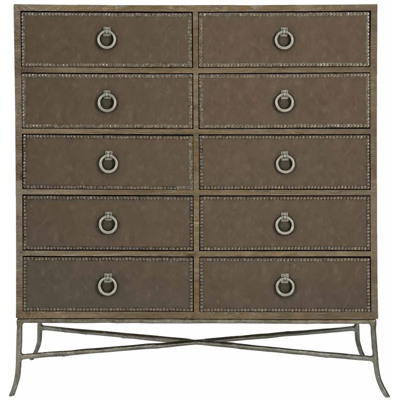 Ten drawers with performance fabric wrapped fronts with textured Black Nickel finish nail trim border Textured cast iron base and stretchers in Burnished Silver finish Adjustable glides Anti-tip kit
