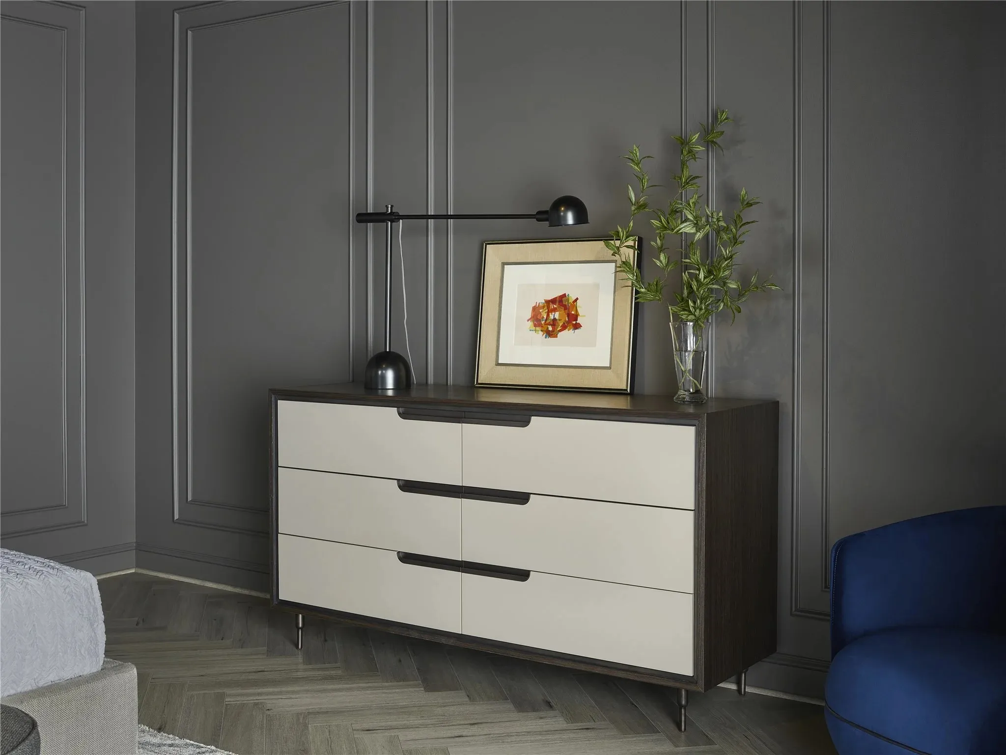 The Degas Dresser features six spacious drawers and a sand lacquer finish on the drawer fronts, creating a luxe storage piece.