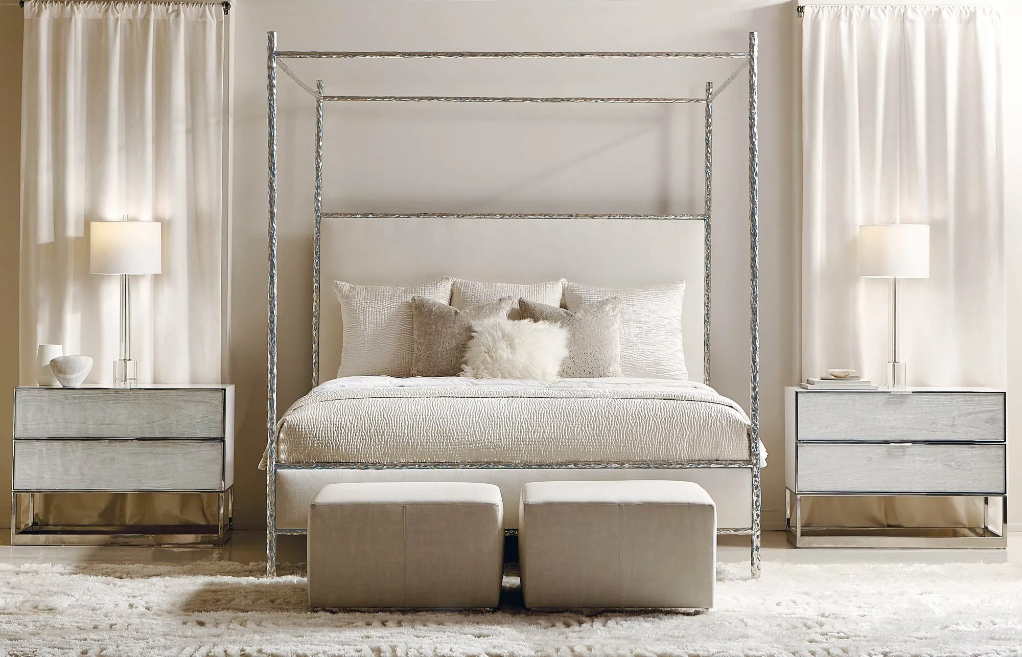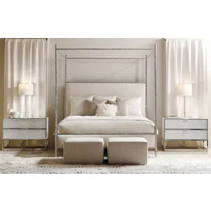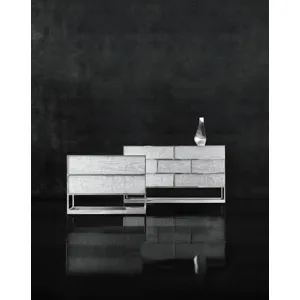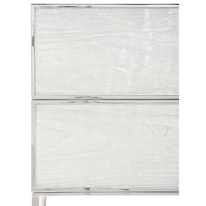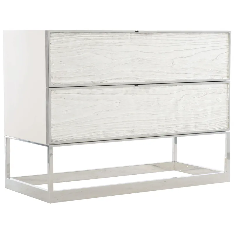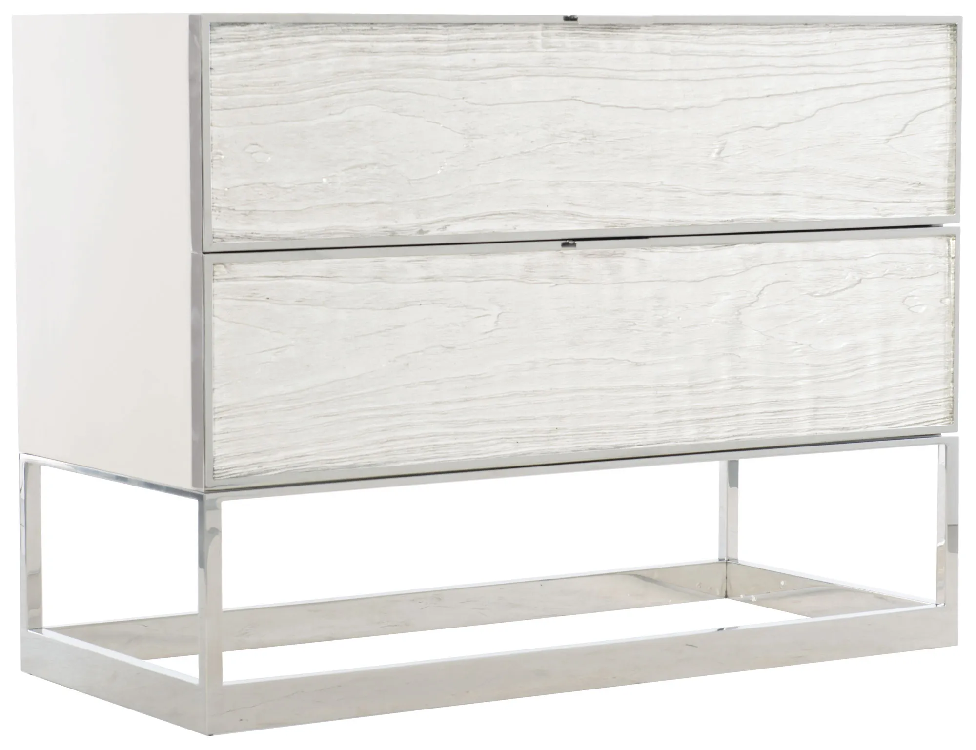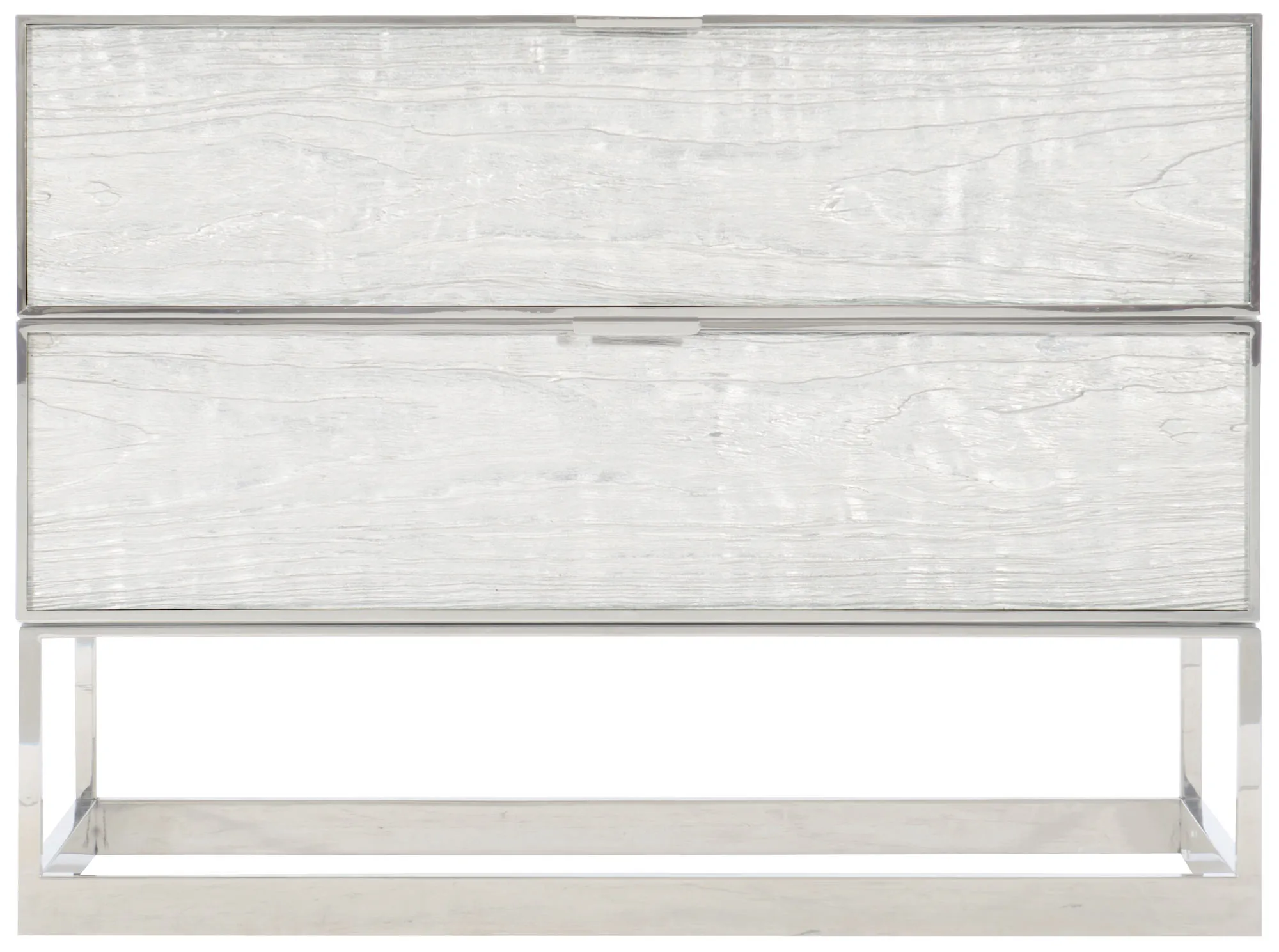Two drawers with metal finger pulls and inset faux wood-grained pattern acrylic fronts with Silver Leaf on back