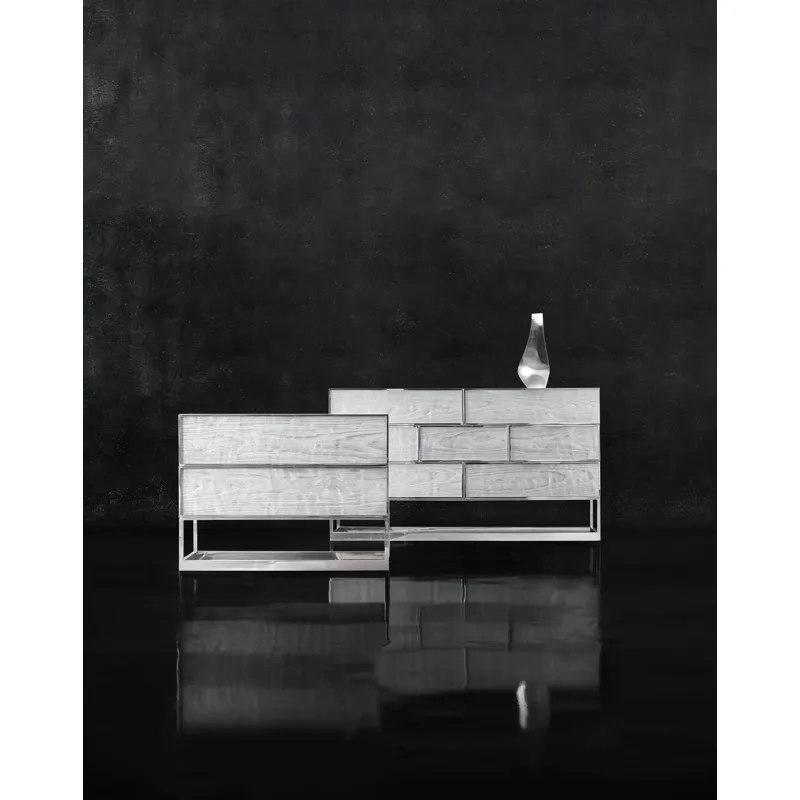 Polished stainless steel frame around drawers