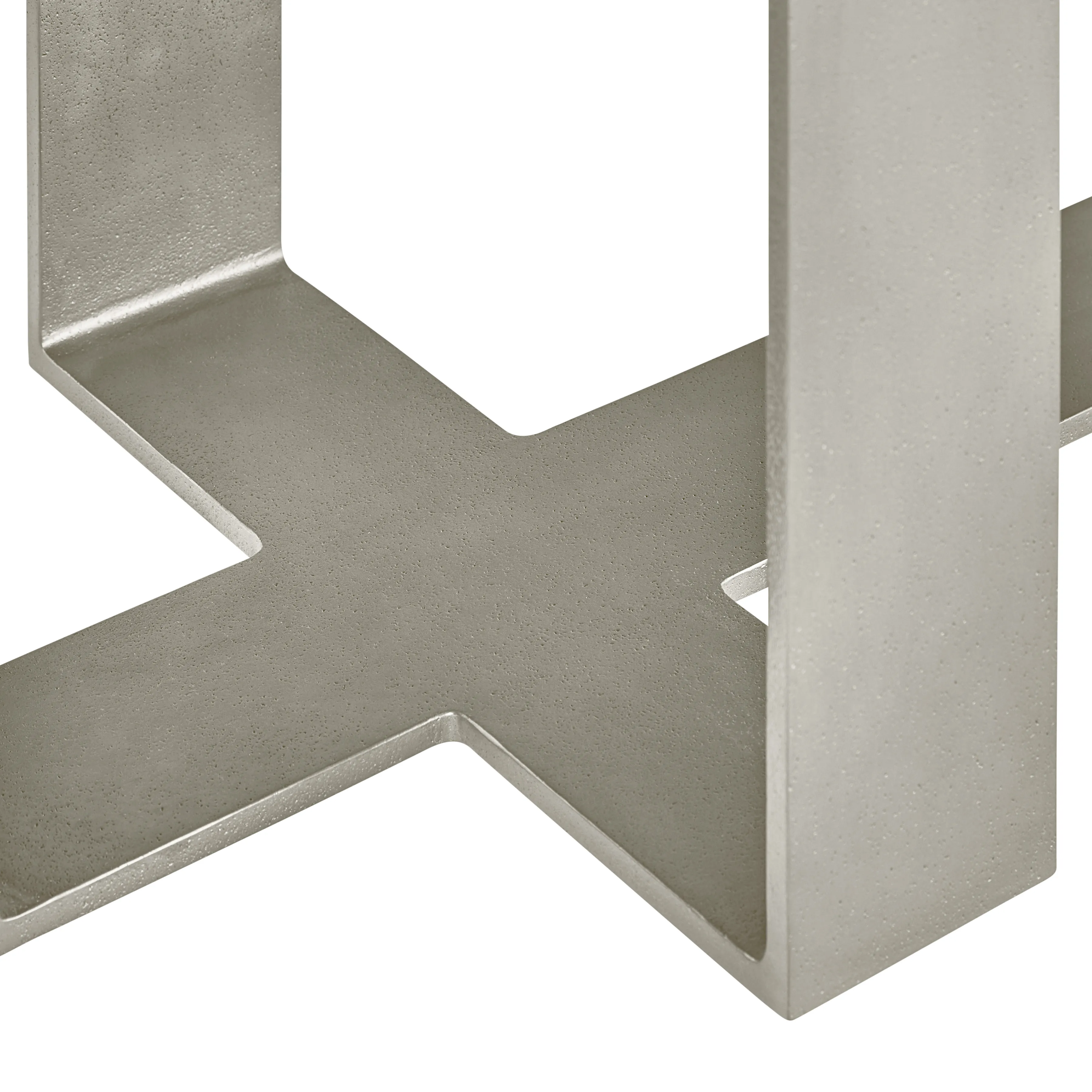 Bands of sandblasted aluminum intersect to form the base of the Tempo nightstand. One band extends over the nightstand's drawer front to give it an architectural look. The top adds a casual note in wirebrushed oak finished in Larza. High-tech details include a two-port A+C USB charging unit.