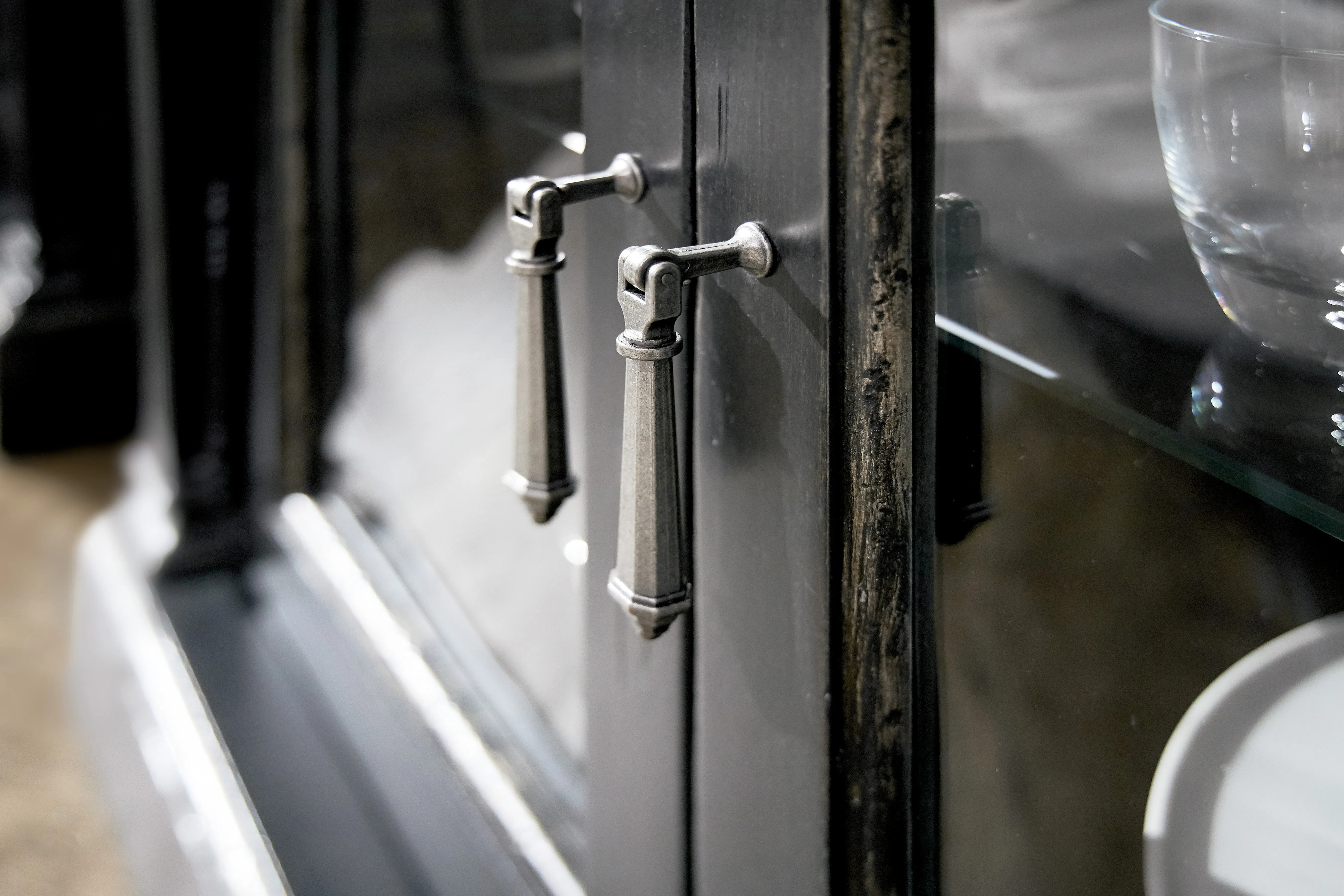 Opulent yet approachable, timeless yet fresh, the Sanctuary Display Cabinet is rooted in historical European design but updated with chic details such as a reversible back panel finished with the silvery Jewel finish on one side and Latte on the other. The main finish is Noir, a black paint with rich brown undertones, rubbed to a medium sheen. The four doors have lightly seeded glass. Inside are four glass shelves and one light with a 3-intensity touch switch. In a compact 38-inch width and 18-inch depth, use this piece alone or in pairs or triplets.