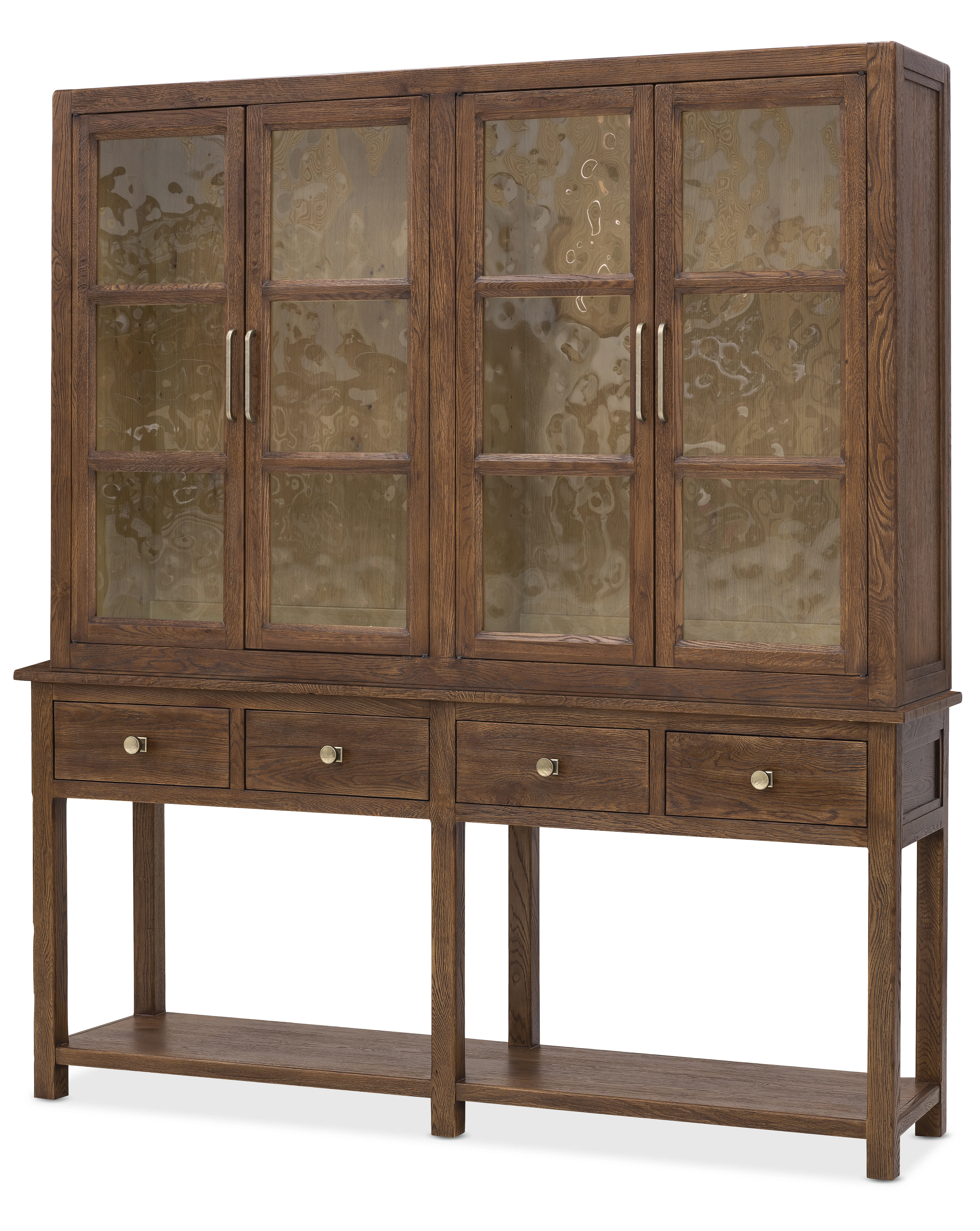 The Driftwood Display Sideboard blends display-ready elegance with functional storage, making it a versatile addition to the dining space. Crafted from oak solids and veneers with seeded glass, it offers a warm, inviting presence with layered texture and depth. Behind each pair of doors, adjustable wood shelves with plate grooves provide ideal display for dinnerware and collectibles, while four self-closing drawers, including a removable silverware tray in the left drawer offer organized storage. A fixed bottom shelf adds additional space for serving pieces or decor. Finished in Worn Saddle, a deep, burnished tone inspired by the supple leather of well-loved armchairs and hand-tooled heirlooms, the piece is enhanced by a dry, distressed finish that highlights natural wood knots and worm holes. Custom round casted knobs and pulls complete the look with artisanal detail. Striking a balance between heritage craftsmanship and contemporary versatility, the Driftwood collection reveals a rich depth of texture and a timeworn patina, celebrating the beauty of naturally aged materials.