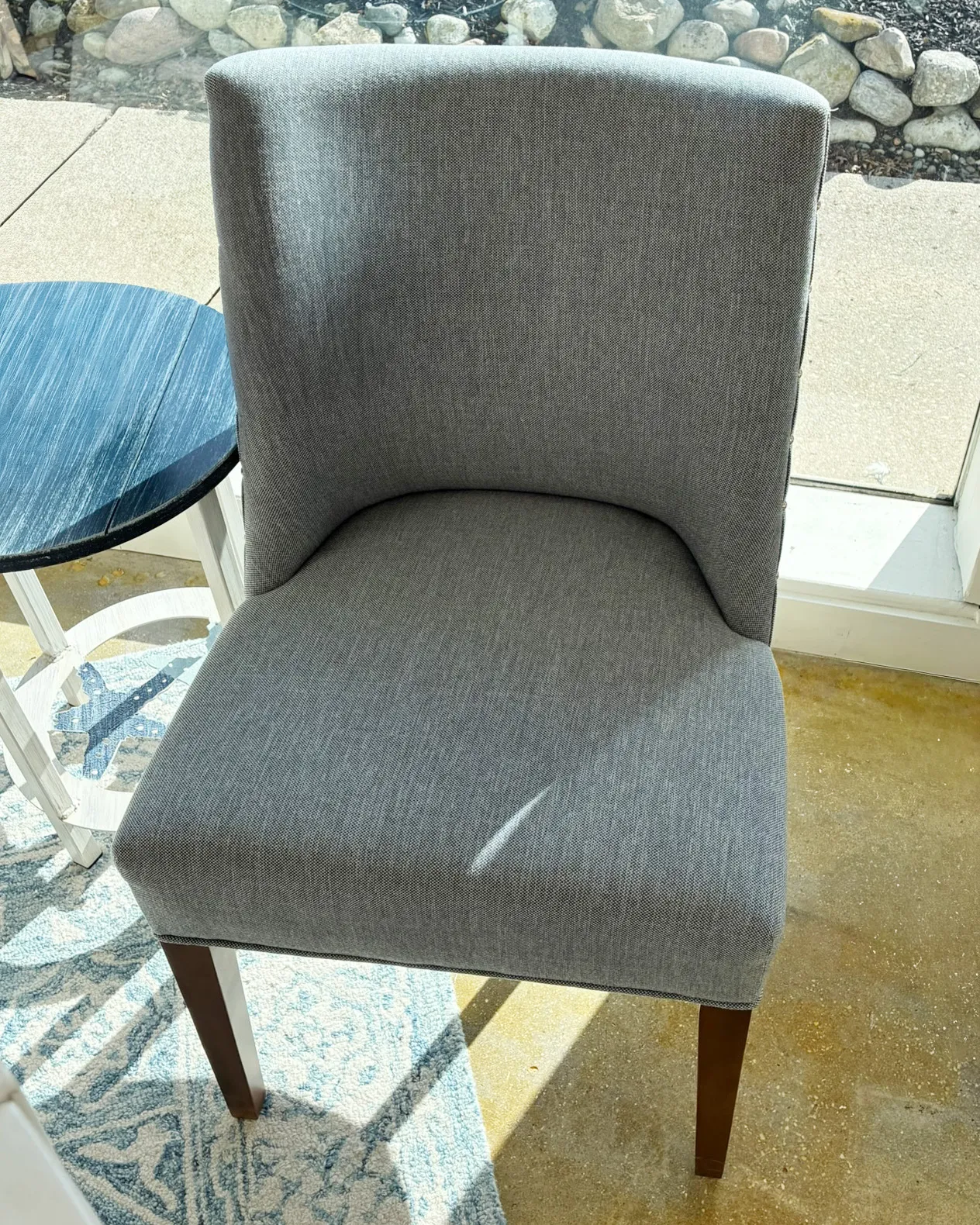 The highly versatile Grace Chair speaks to many décor styles. Dependent upon fabric and stain, it can easily go from modern rustic to contemporary chic. Features include a gently curved back, nail head trim and square tapered legs. The Grace Chair is paired beautifully with the industrial style Round Zinc Top set atop the dramatic Single Barley Pedestal.