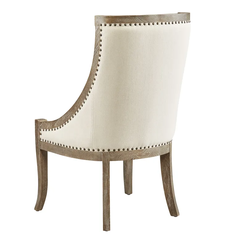 Sleekly elegant, the sweeping lines of this oak chair with a soft driftwood finish have been enhanced by the application of a simple linen fabric. Hand applied brass nail heads add visual interest to the outside back of this handsome chair. Perfect for dining and equally at home as an accent chair.
