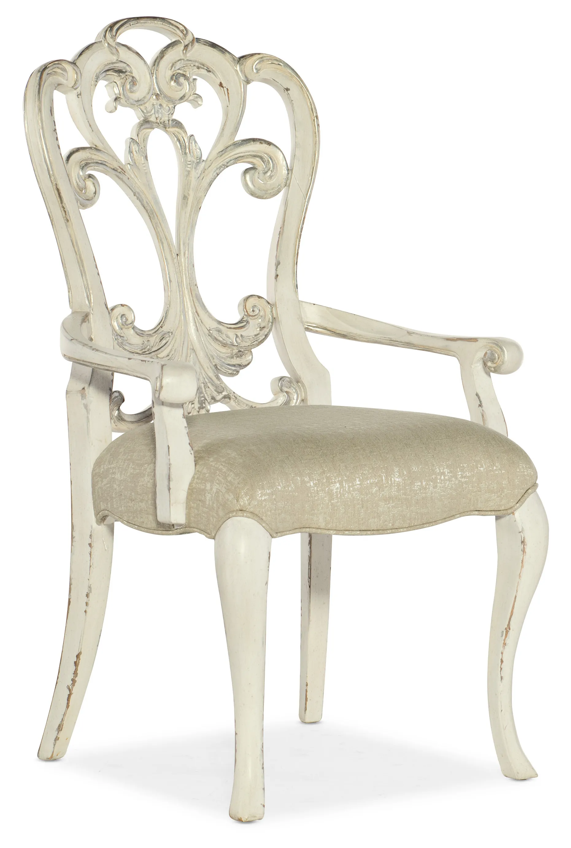 Ready for a candlelit dinner, these romantic, elegant arm chairs are enticing with shaped fretwork backs and cabriole legs. The Blanc creamy white finish is accented with champagne and silver tipping. The Glitter Pearl upholstered seat is a performance fabric for stain resistance and easy cleanability.