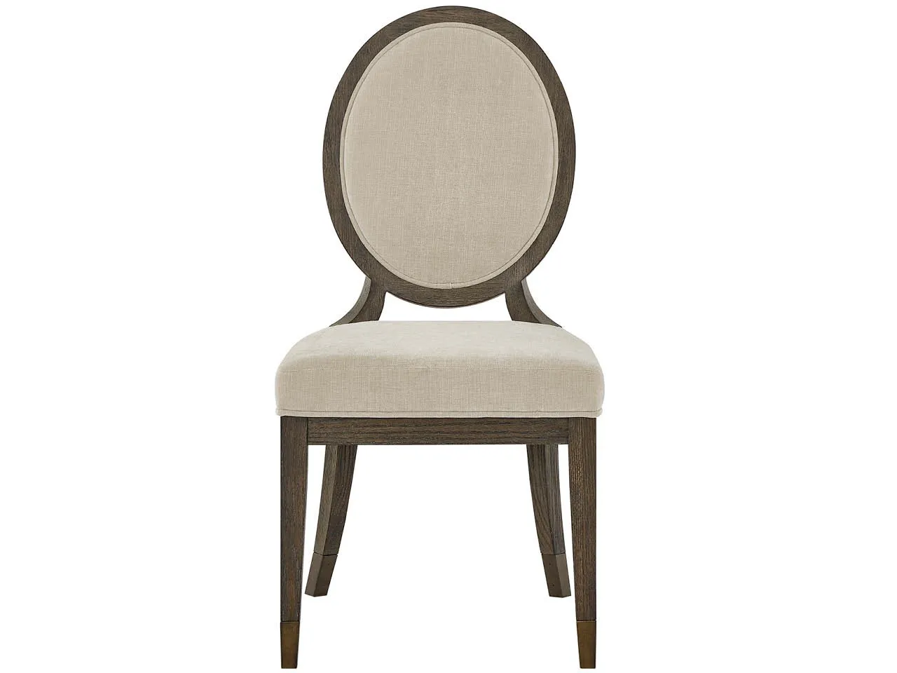 The Cocoa Oval Side Chair offers a graceful nod to Louis XVI styling with an elegant oval-framed back and upholstered insert. Embossed Cocoa back finish provides textural interest while Smoked Gold ferrules add sophisticated metallic accents to dining spaces.
