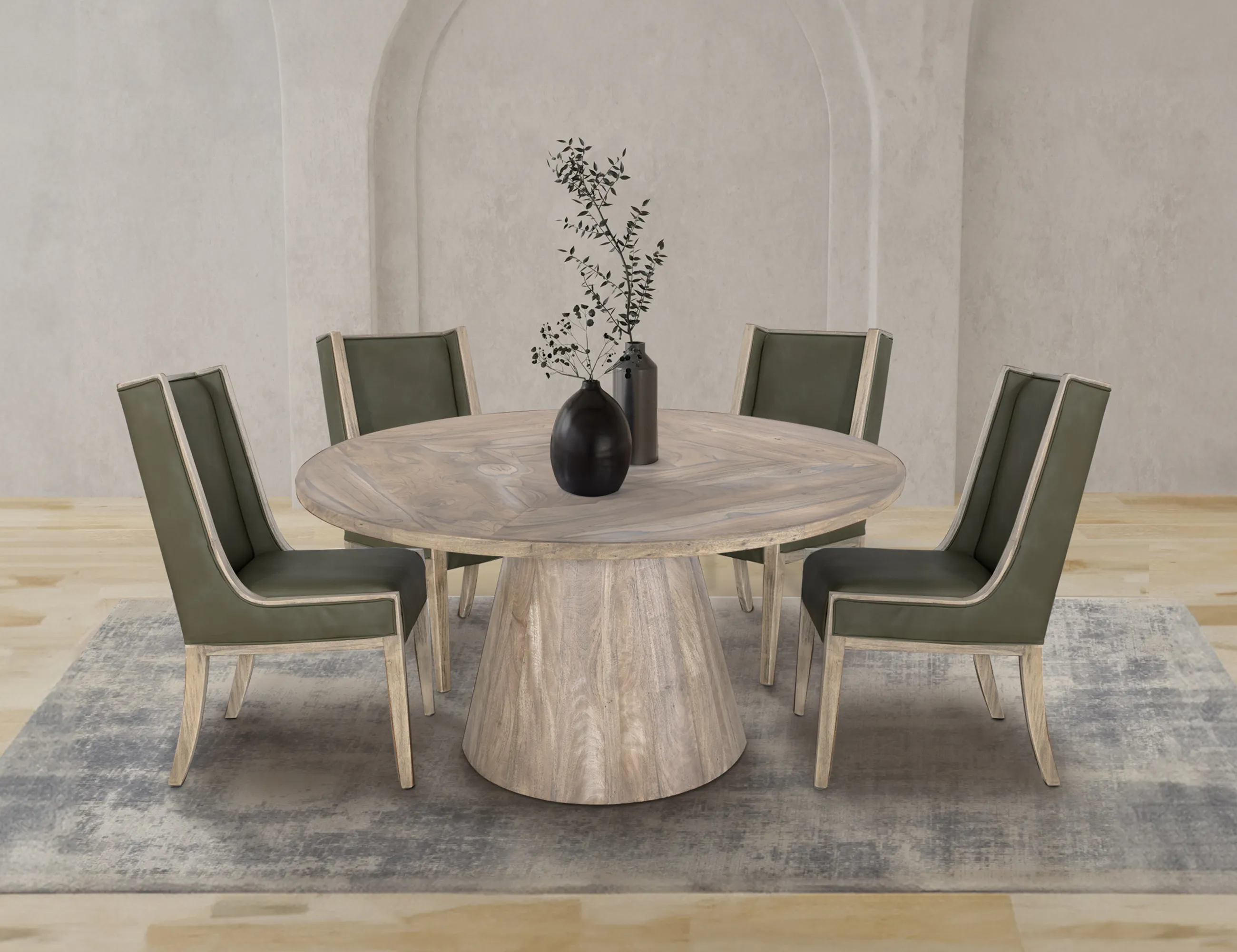 White Balam, Round Dining Table (IFD4321DINTBLRD): 59.75 x 59.75 x 31.5 - Our Balam collection is handcrafted from mango and teak wood, offering a simple yet stunning addition to your space with an organic, modern touch. The Balam table features a sturdy, conical wooden base that showcases the beautiful, natural grain of the wood, providing a solid foundation for the smooth, round tabletop. Elevate your dining experience by pairing this table with the stylish chairs available in the collection, creating an inviting atmosphere in your home. Crafted of sustainable mango and teak wood. Translucent, multi-step lacquer with a white finish. Mortise and tenon construction offers stability and durability. Round Table: 1.5" H x 59.75" W x 59.75" D Round Table: 29" H x 30.75" W x 30.75" D