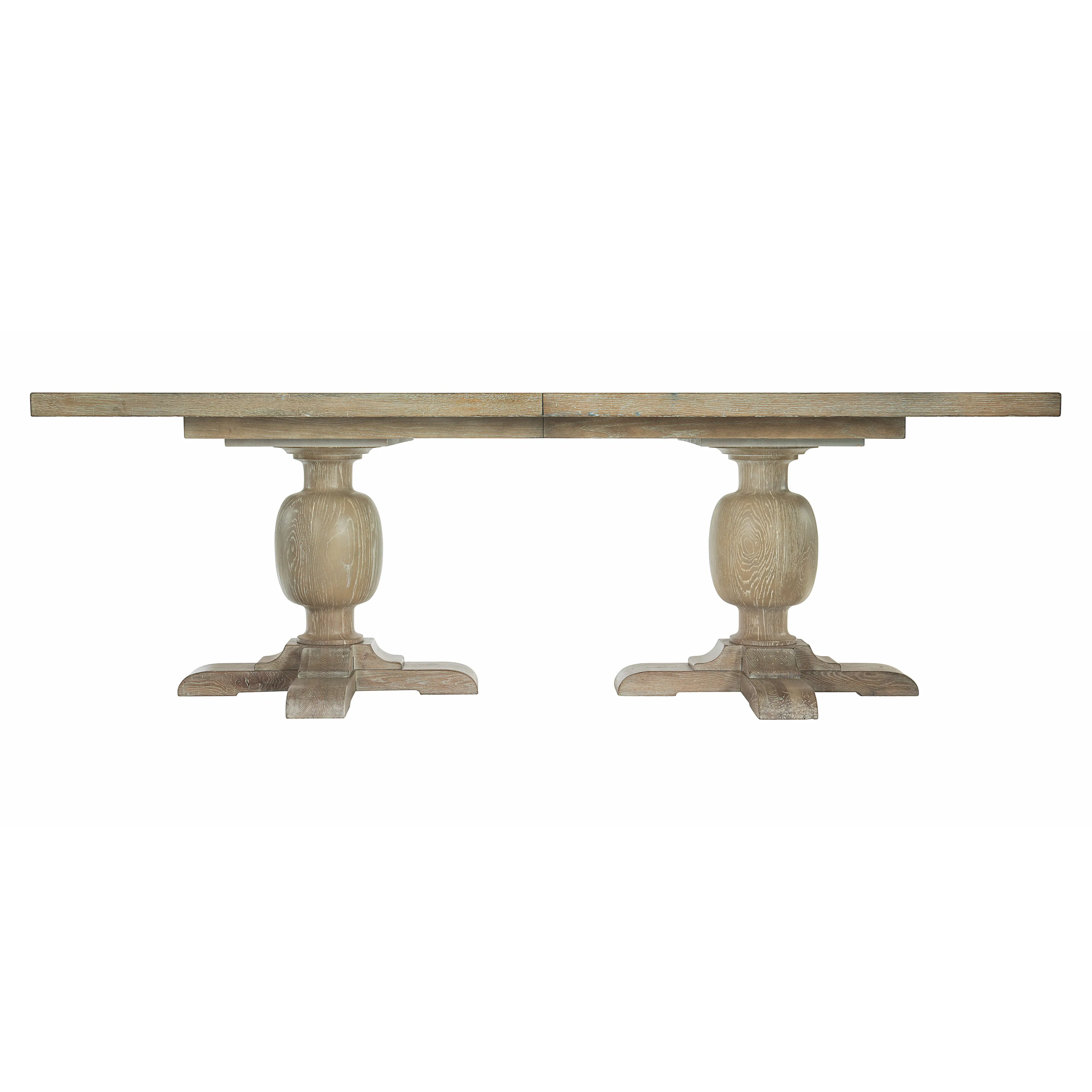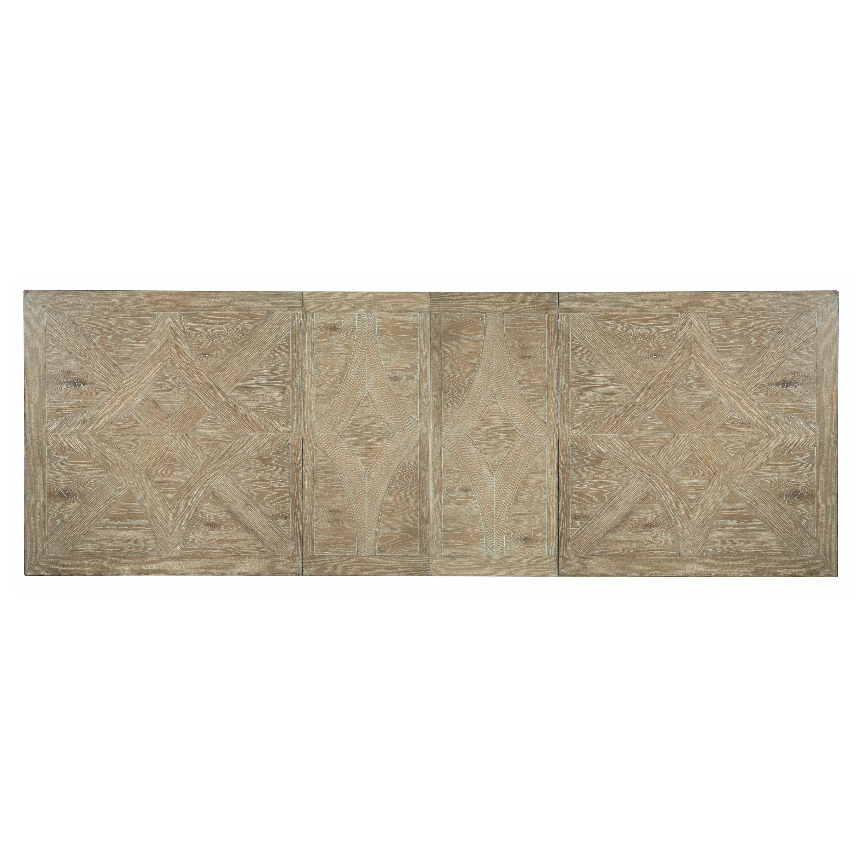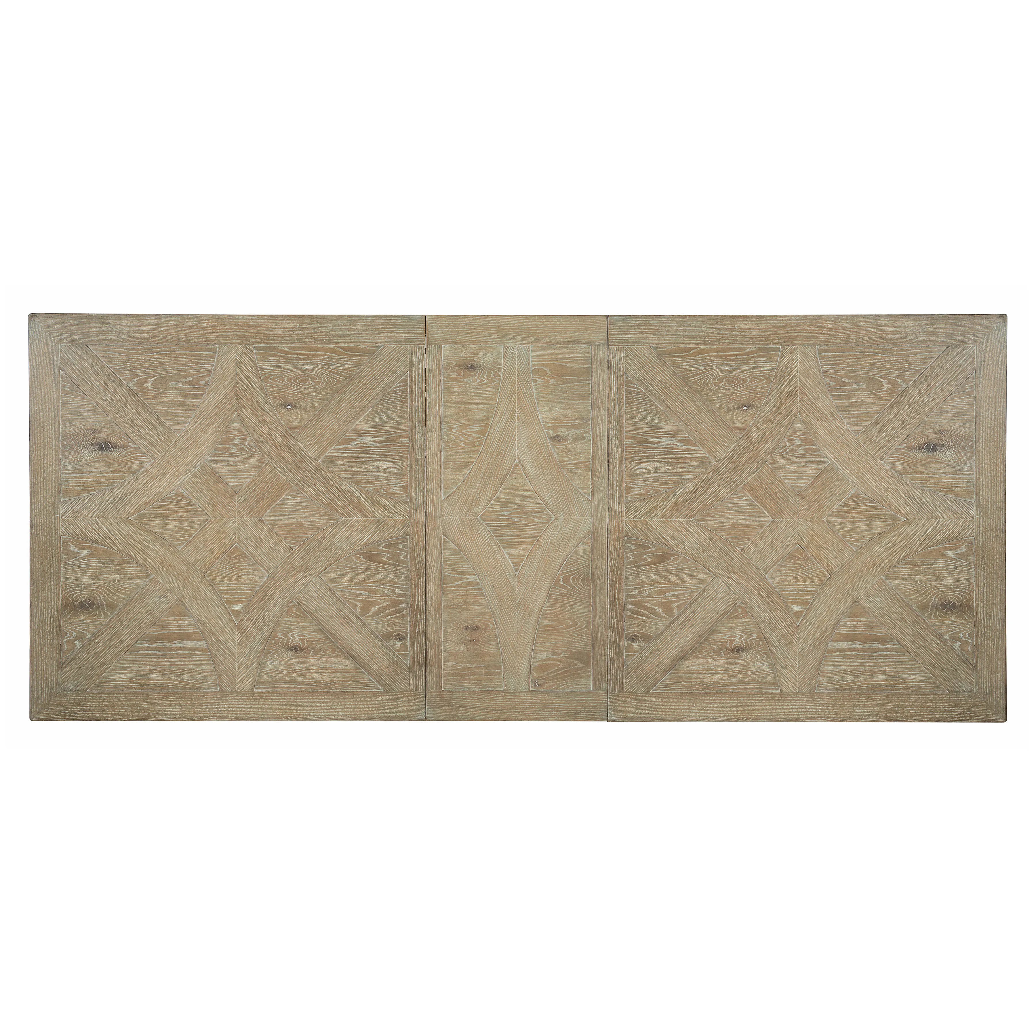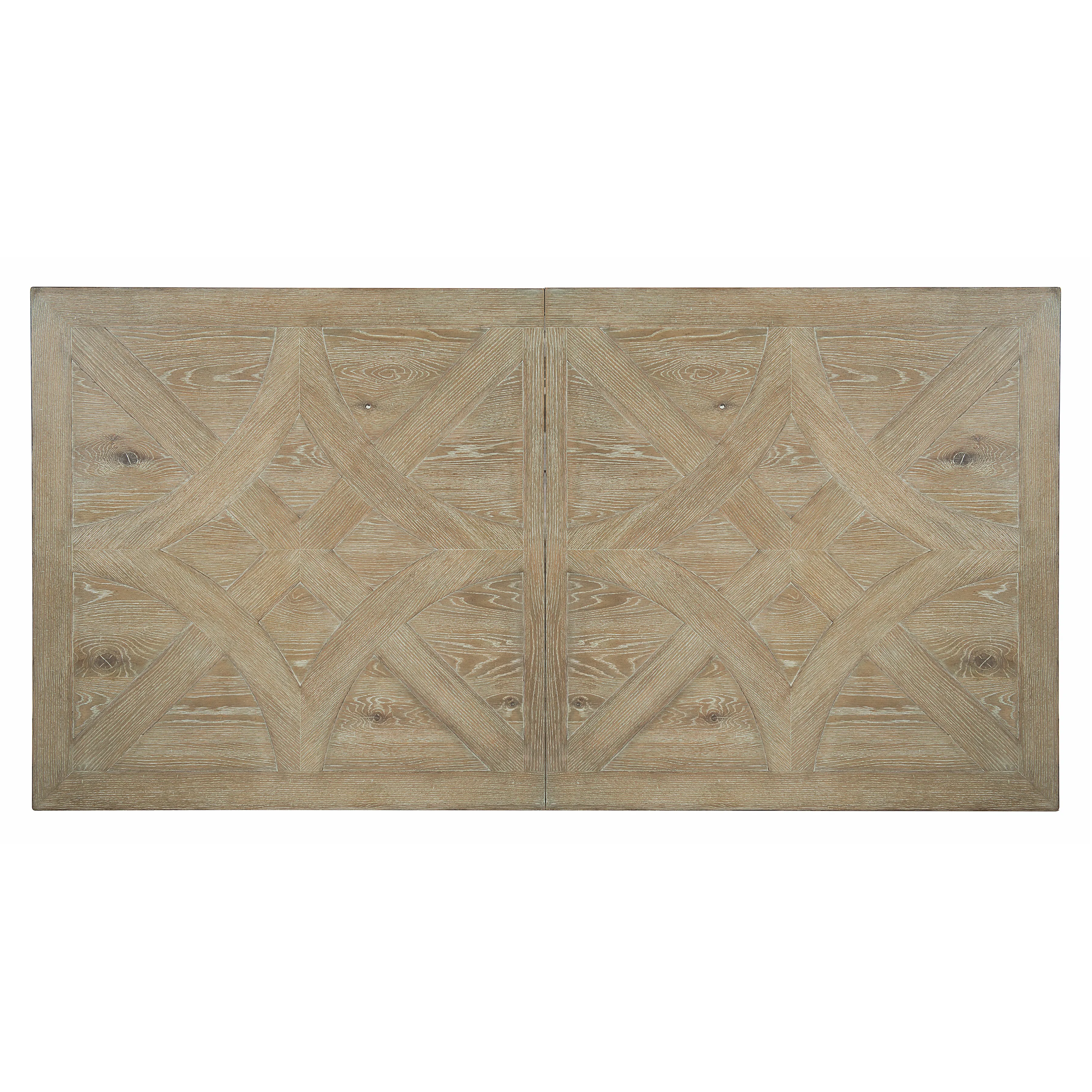 Rustic Patina offers traditional design with memorable touches of artistry and a relaxed sense of style. Influenced by English and French designs, this rectangular dining table features two urn-shaped pedestal columns, each with a four-prong wood base. The fancy face top joins knotty white oak and quartered white oak in a marquetry veneer pattern enhanced by a light Sand finish. A classic look and a warm, rustic finish make this piece a welcoming centerpiece for any dining room.