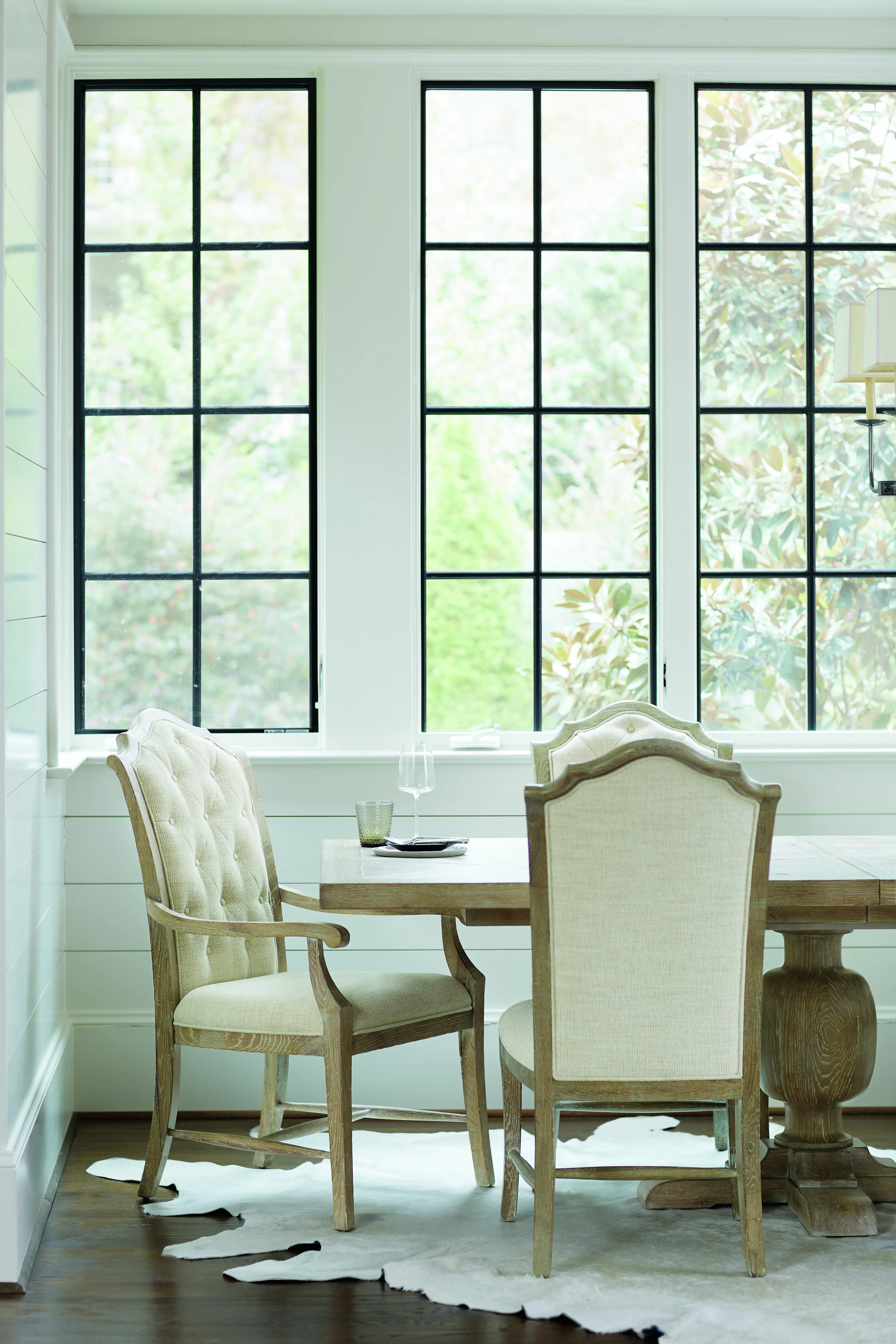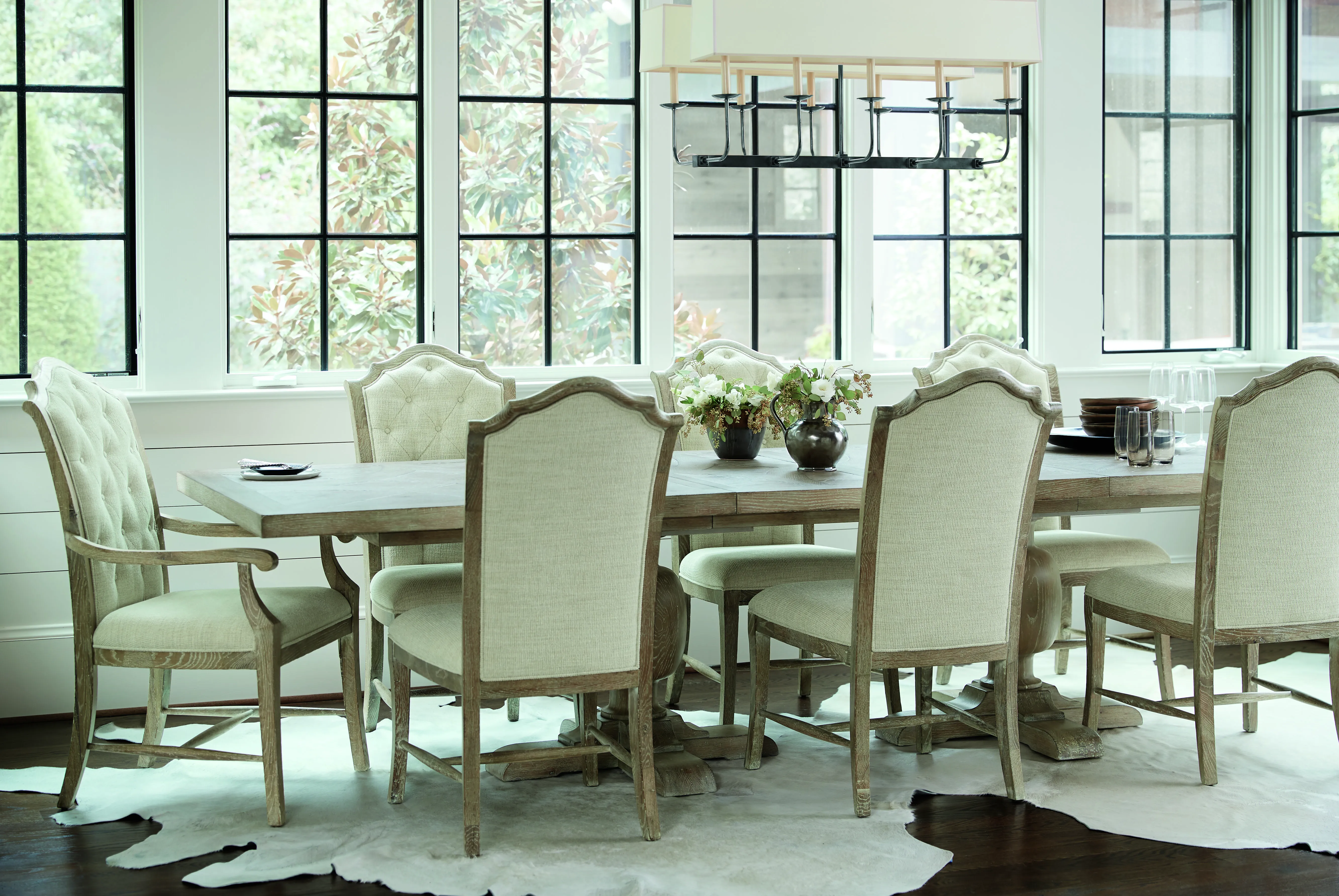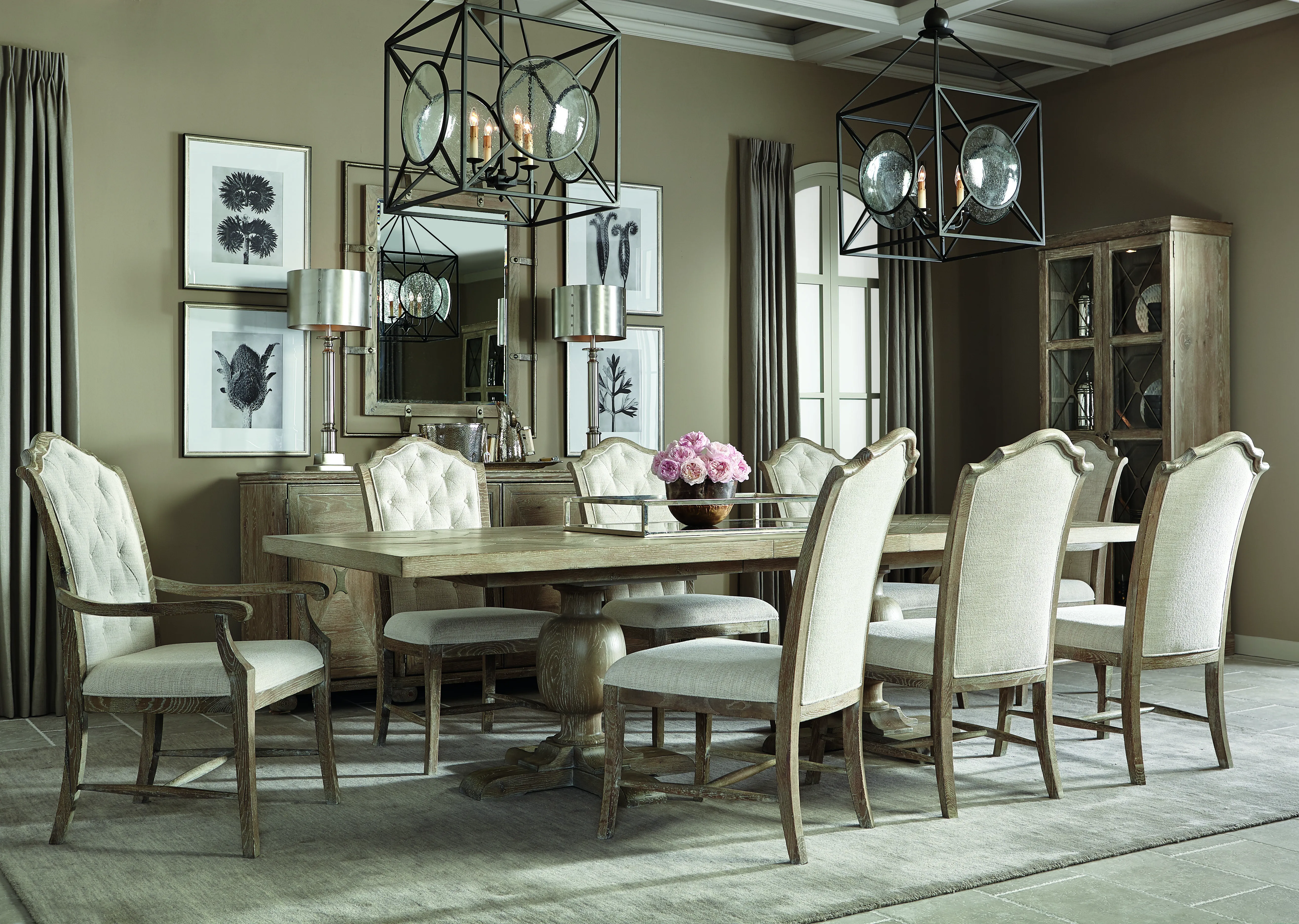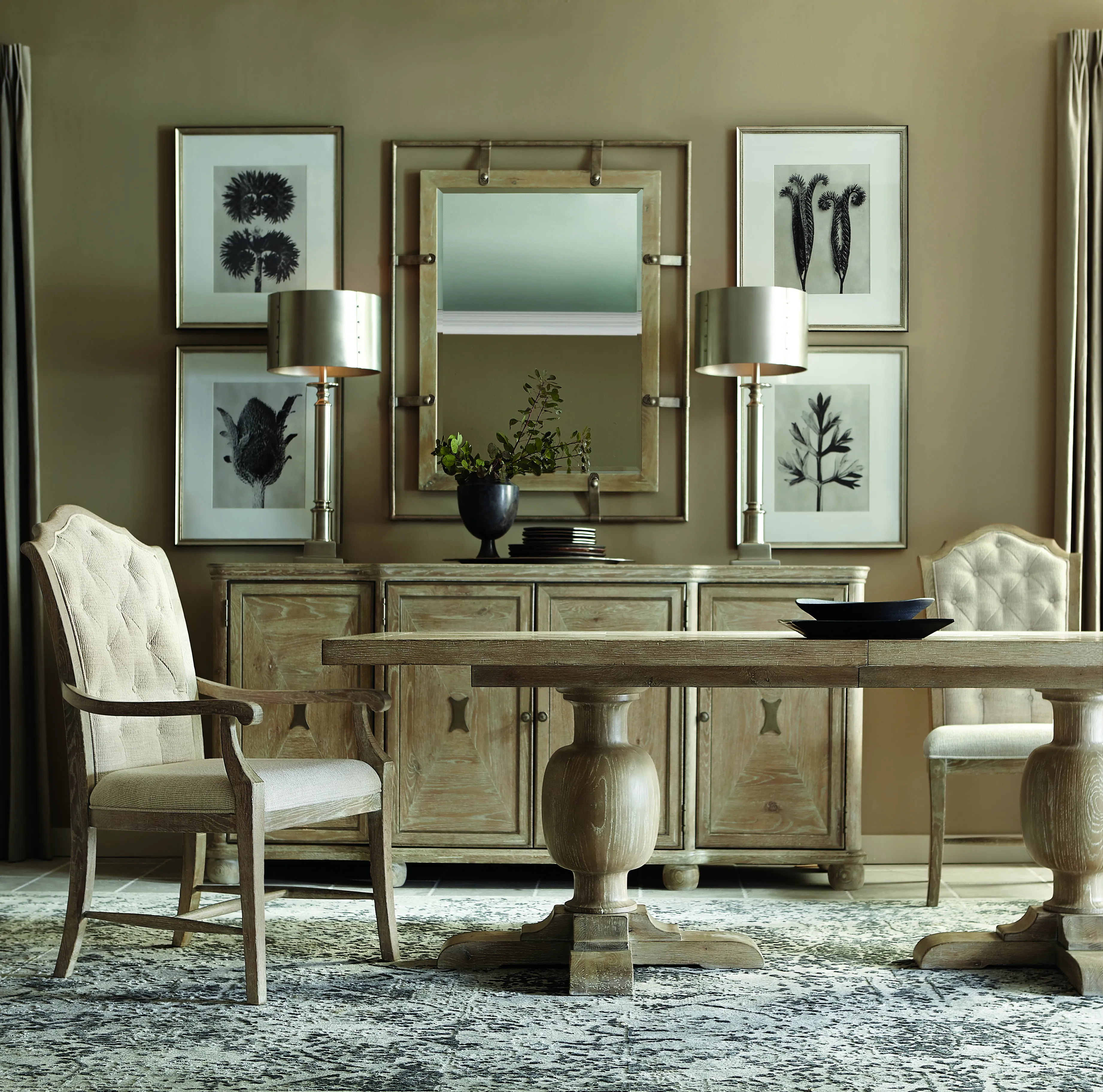 Rustic Patina offers traditional design with memorable touches of artistry and a relaxed sense of style. Influenced by English and French designs, this rectangular dining table features two urn-shaped pedestal columns, each with a four-prong wood base. The fancy face top joins knotty white oak and quartered white oak in a marquetry veneer pattern enhanced by a light Sand finish. A classic look and a warm, rustic finish make this piece a welcoming centerpiece for any dining room.