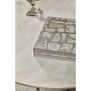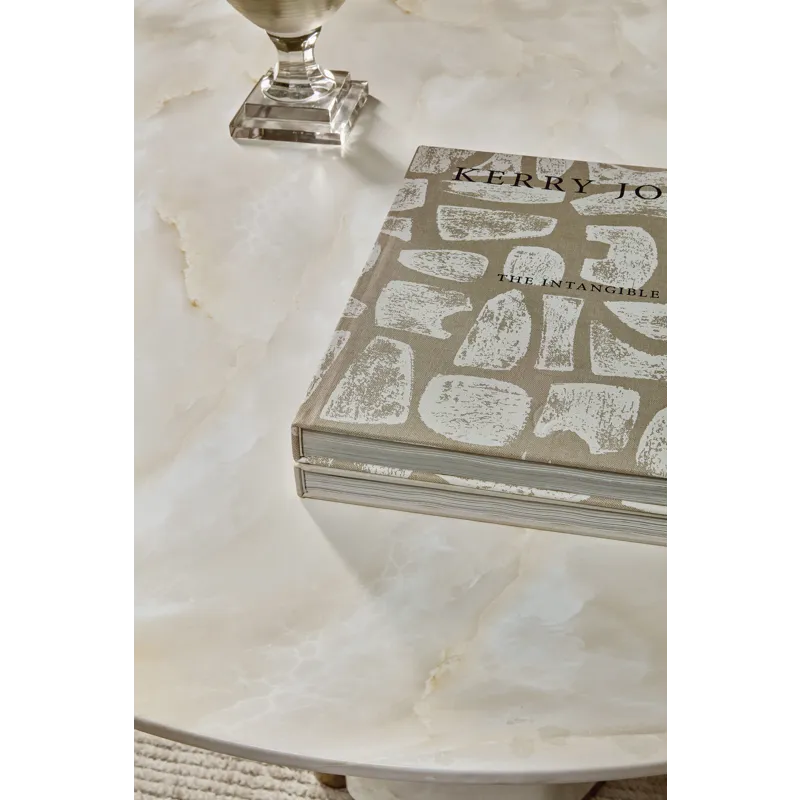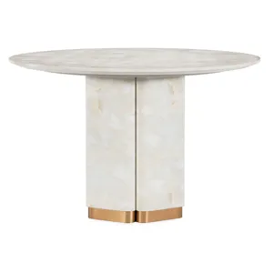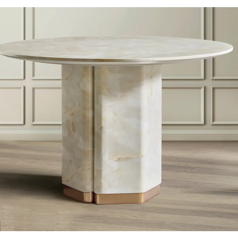 Bring modern artistry to your dining area with the Eleana Round Dining Table, featuring a faux onyx water-transfer finish paired with Sunlit Bronze metal accents. Its single pedestal design and 48-inch diameter make it a striking yet space-friendly centerpiece. Perfect for contemporary interiors, this table exudes an effortlessly chic vibe while delivering durability with its concrete, resin, and metal construction.