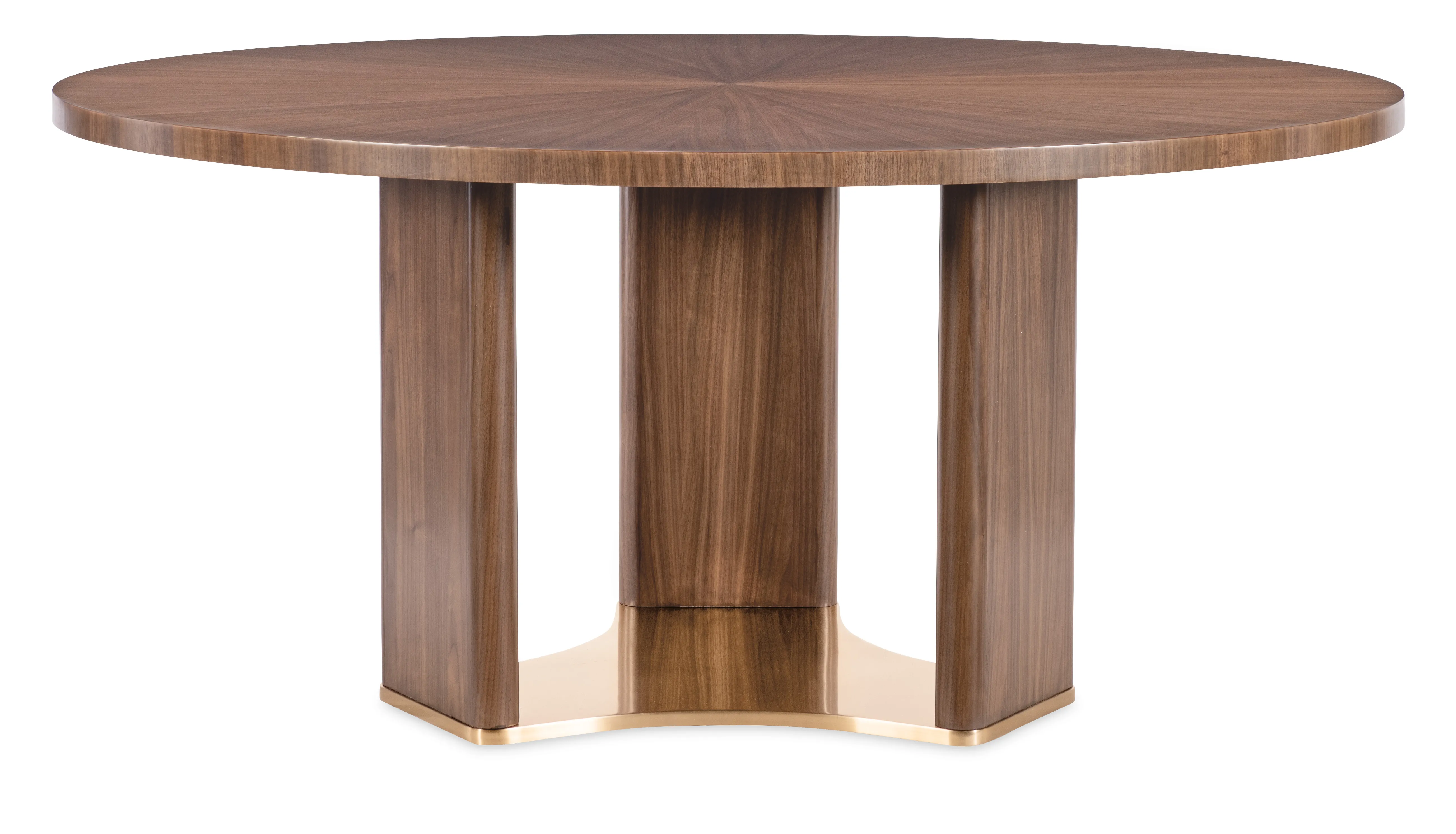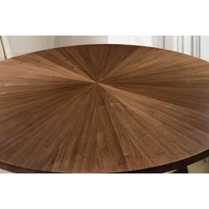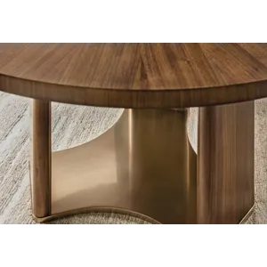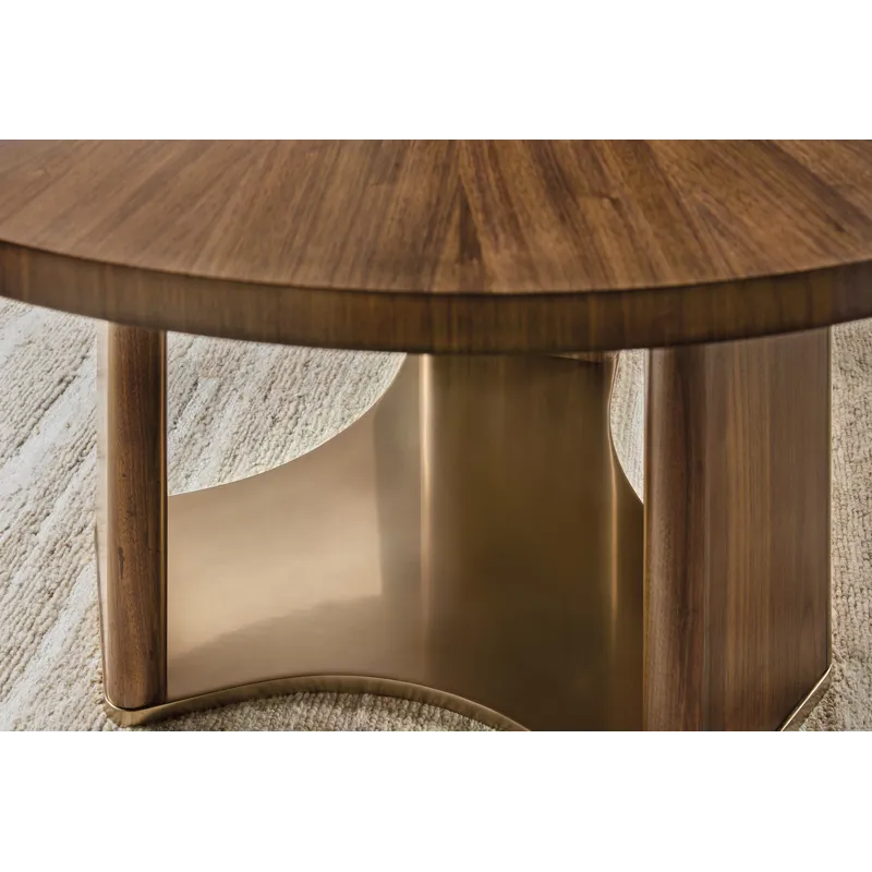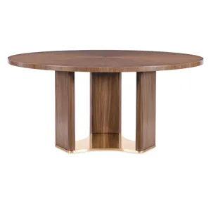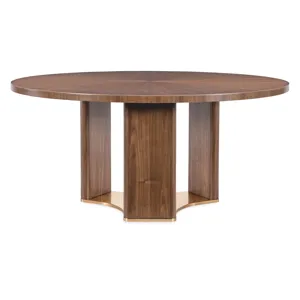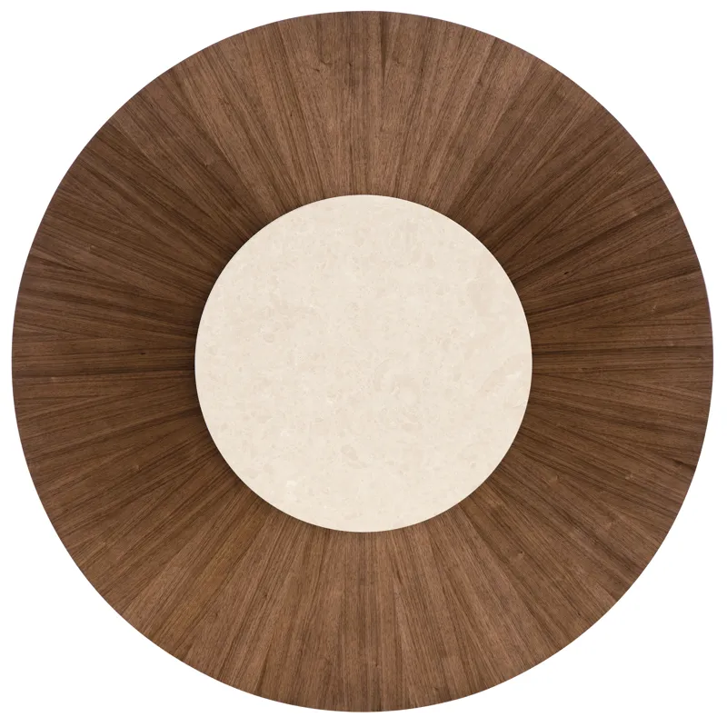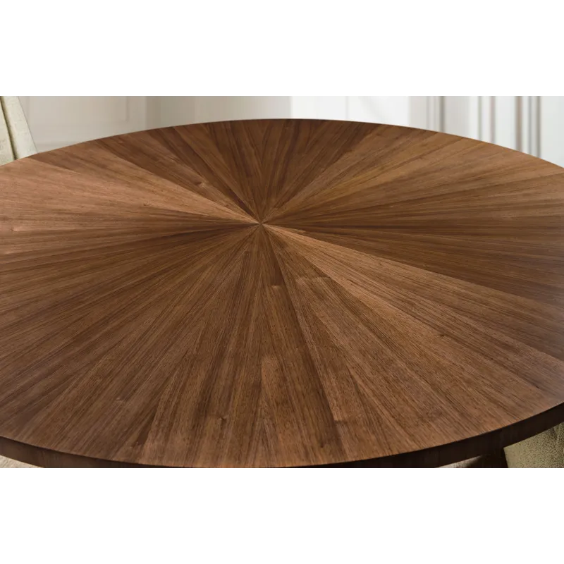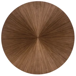 Make every meal a moment to remember with the Eleana Round Dining Table. Its starburst veneer pattern in a Light Caramel walnut finish radiates sophistication, while the plated Sunlit Bronze pedestal base adds a touch of sculptural elegance. With a 66-inch diameter, this table is ideal for both intimate dinners and stylish entertaining, offering a harmonious blend of luxury and modern design.