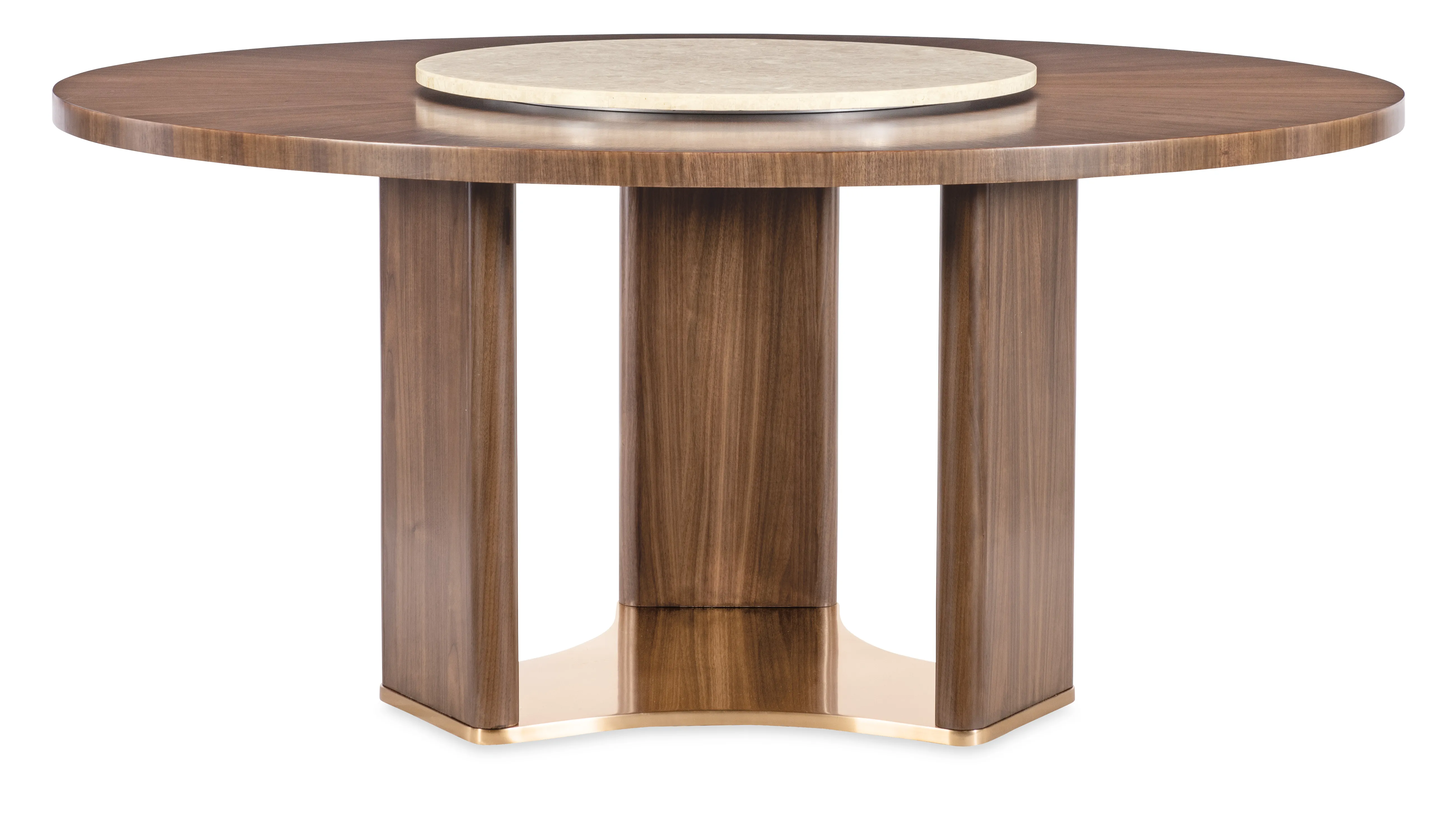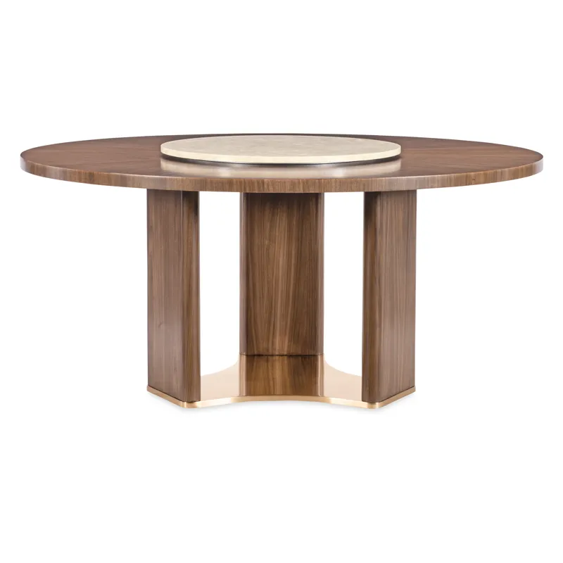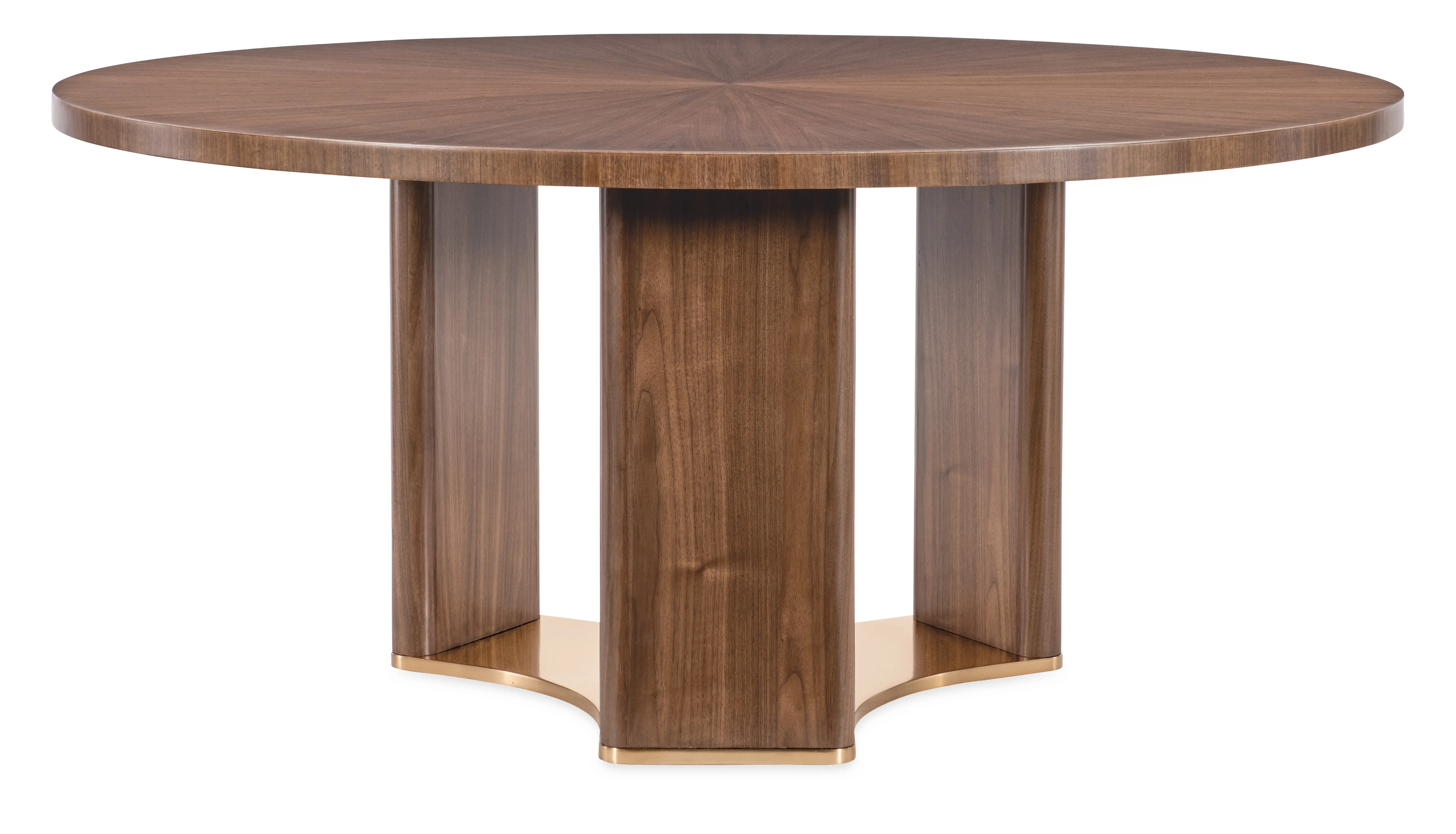 Make every meal a moment to remember with the Eleana Round Dining Table. Its starburst veneer pattern in a Light Caramel walnut finish radiates sophistication, while the plated Sunlit Bronze pedestal base adds a touch of sculptural elegance. With a 66-inch diameter, this table is ideal for both intimate dinners and stylish entertaining, offering a harmonious blend of luxury and modern design.