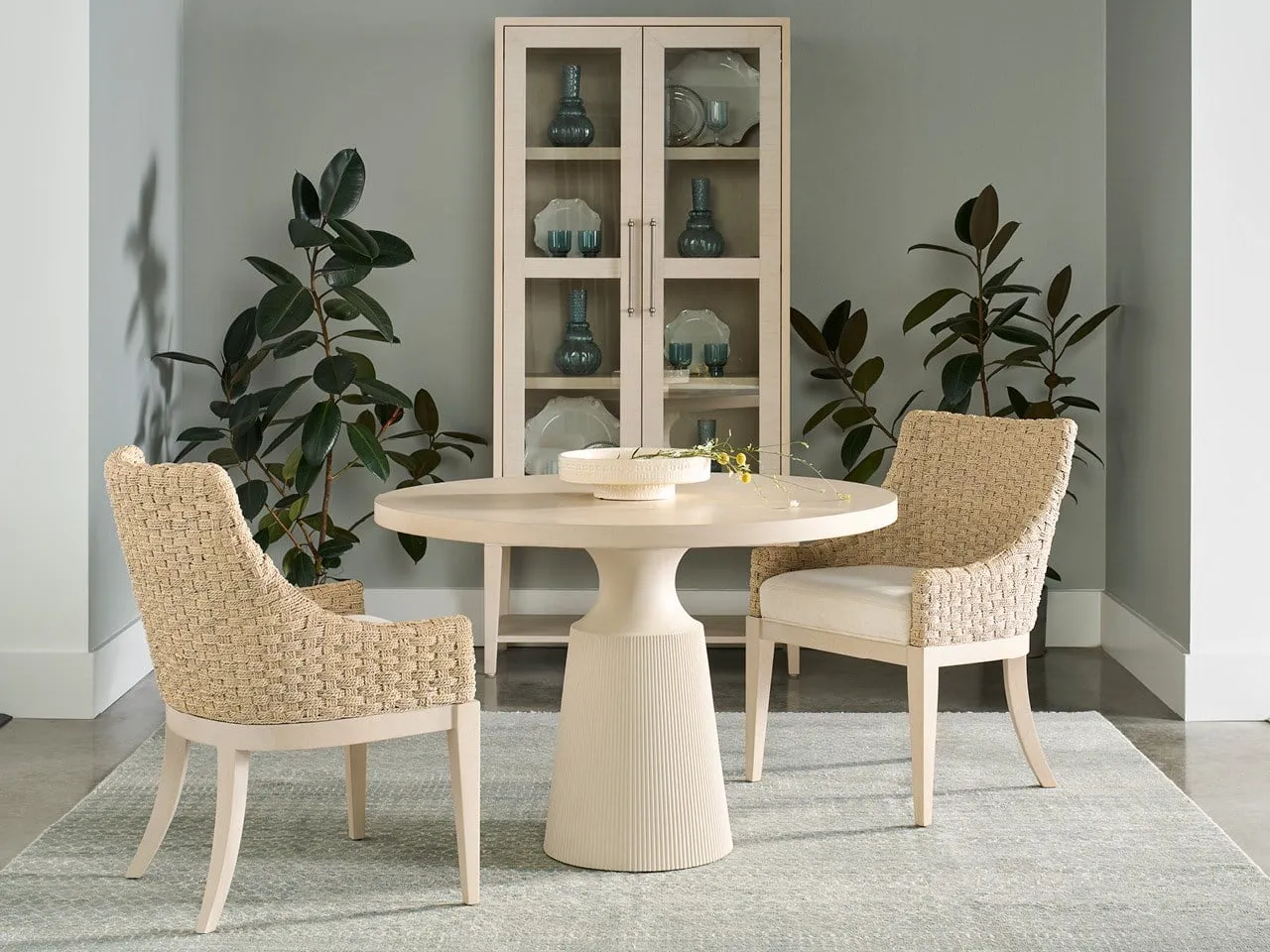 The Birchaven Pedestal Table is an elegant small-scale dining table, featuring a clean Willow top supported by a softly contrasting Taupe-finished pedestal base. The circular design is perfect for an intimate dining space or breakfast nook, embodying casual sophistication and transitional style.
