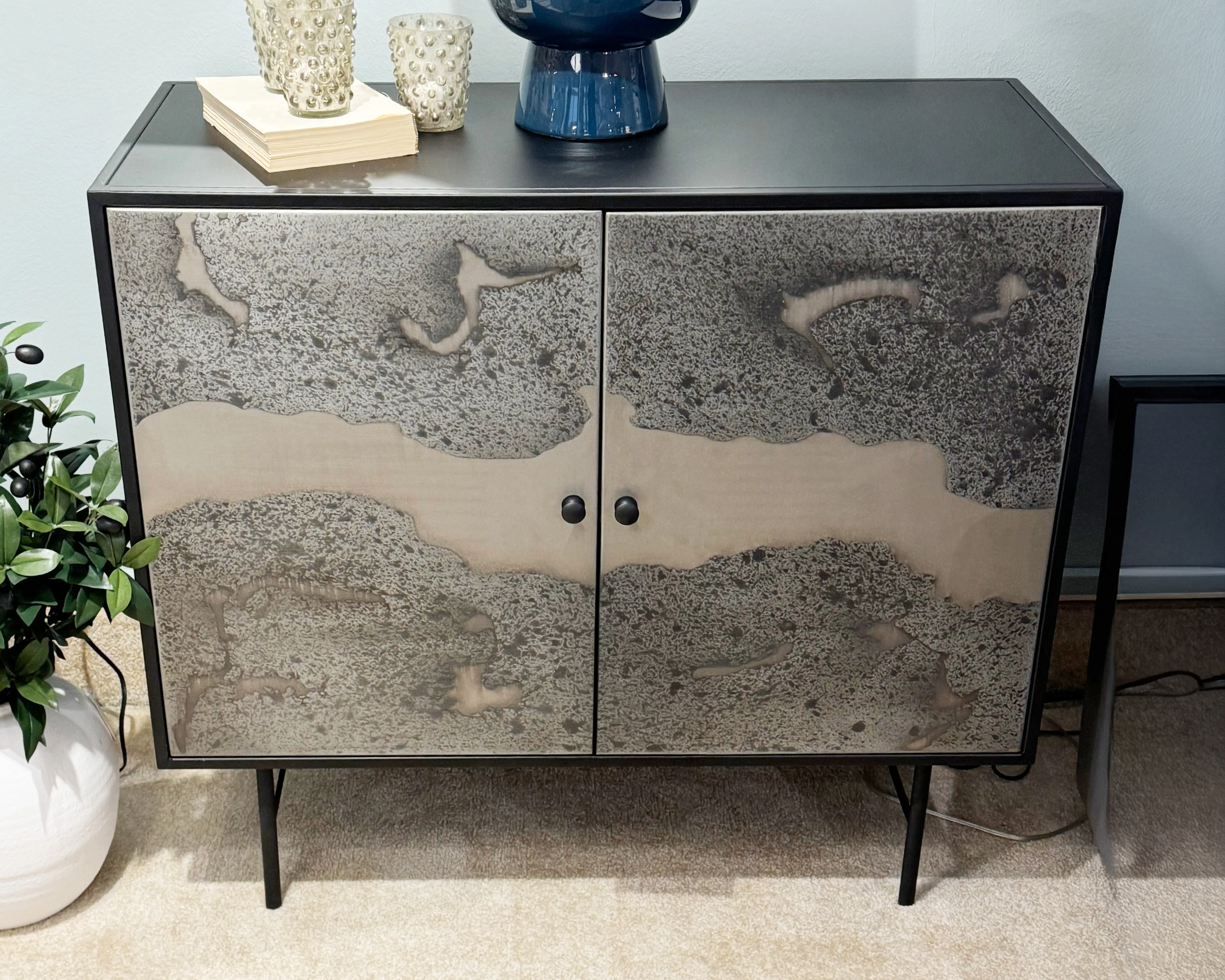 The Moab 39" Bar Cabinet in Oxidized Black blends modern design with industrial character. Finished in a deep oxidized black, this cabinet offers ample storage for barware and spirits, featuring a sleek yet functional design that enhances any entertaining space.