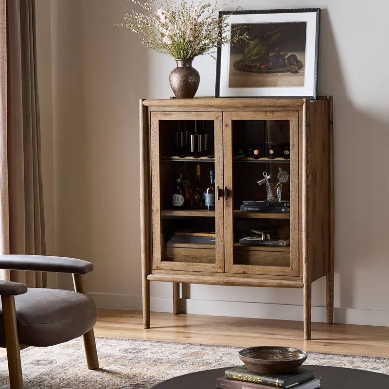 A rustic oak bar cabinet shapes subtly curved corners, bringing a handcrafted look to a minimalist form. Fixed center shelves, functional drawers and glass fronts for open display. Simple hardware is finished in an aged bronze.