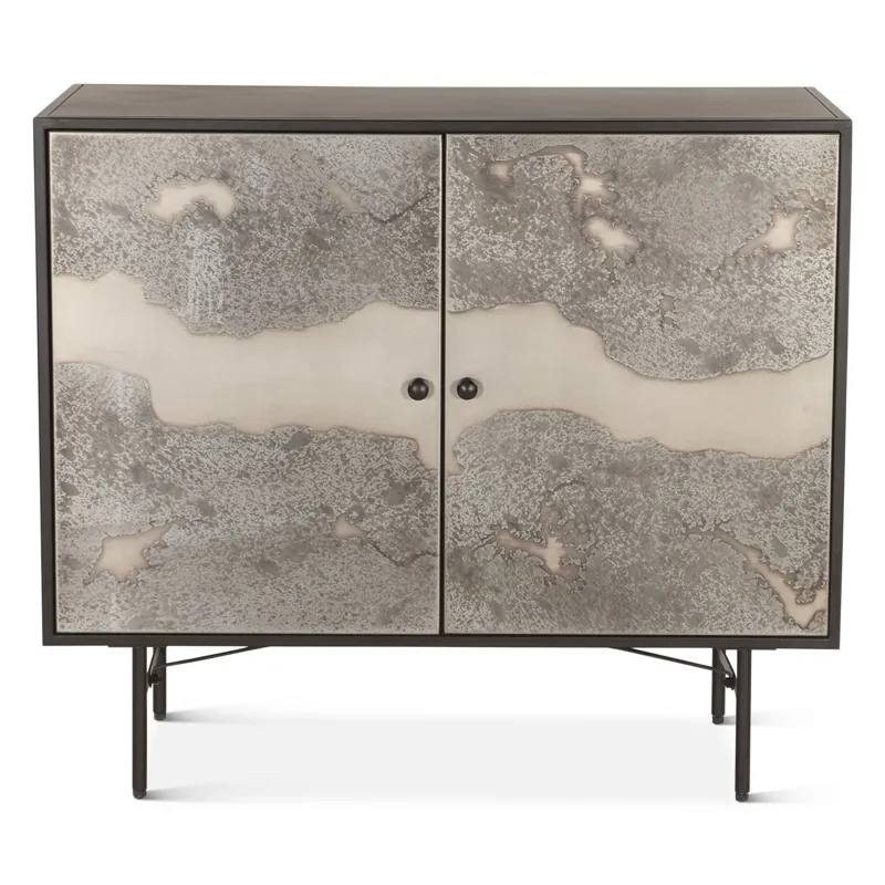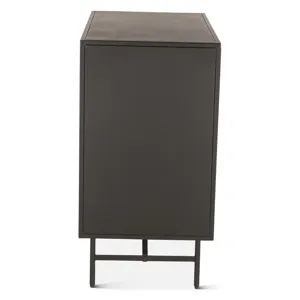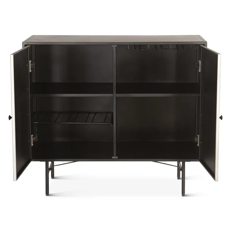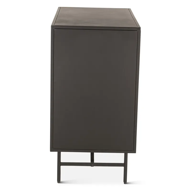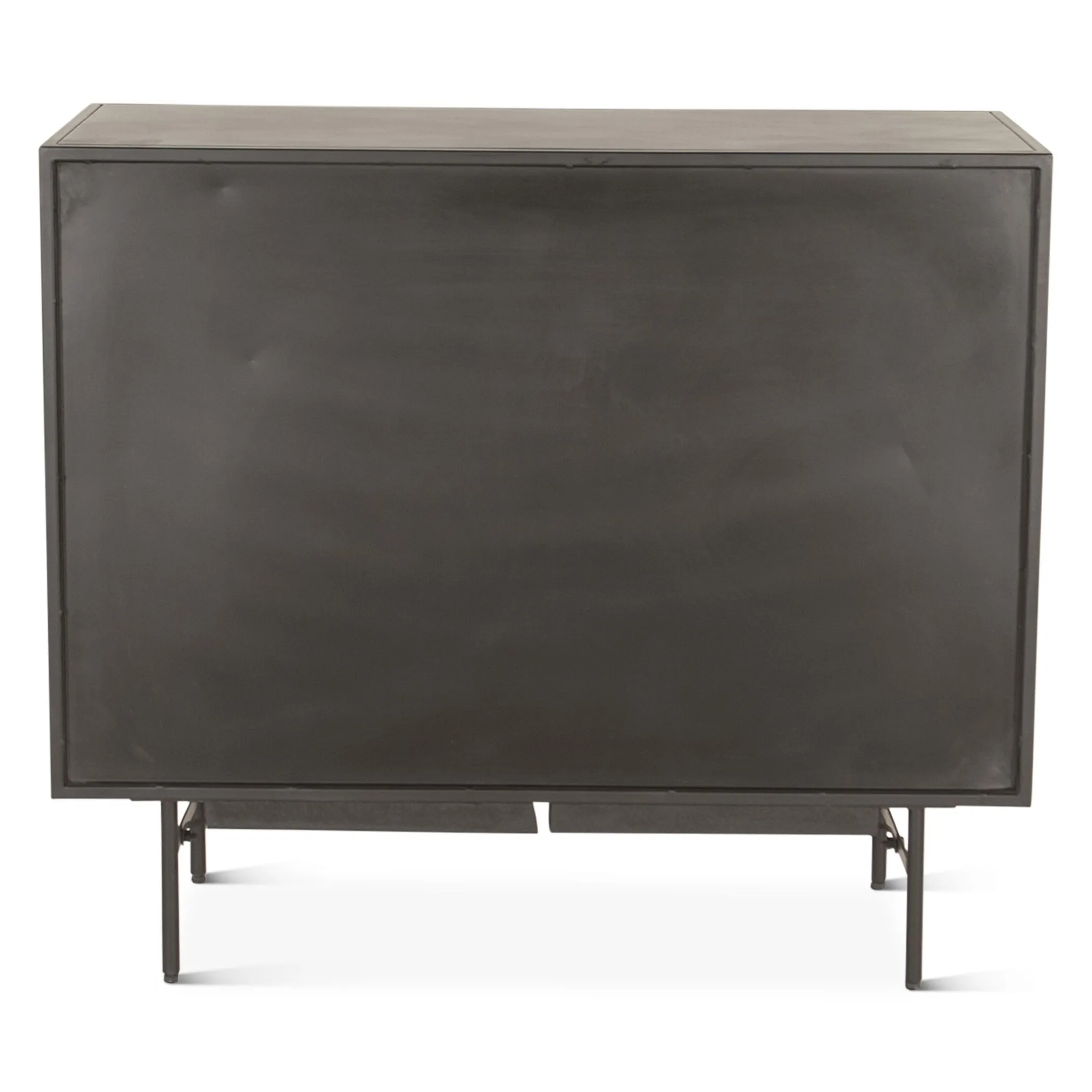 The Moab 39" Bar Cabinet in Oxidized Black blends modern design with industrial character. Finished in a deep oxidized black, this cabinet offers ample storage for barware and spirits, featuring a sleek yet functional design that enhances any entertaining space.