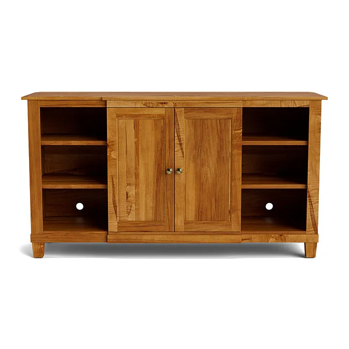 In yet another innovative feat of “hideaway” engineering, the HideAway Austin Buffet features pivoting doors that conceal either the side or the center shelves. Whether you choose to use the Austin Buffet in service to your dining experience or for other storage or media needs, it provides true HideAway flexibility. All its shelves are adjustable, with those in the center able to reverse from smooth to grooved for wine bottle storage. Customize the Austin in any of the BenchMade silver maple finishes, and choose brass or pewter finish for the round doorknobs.