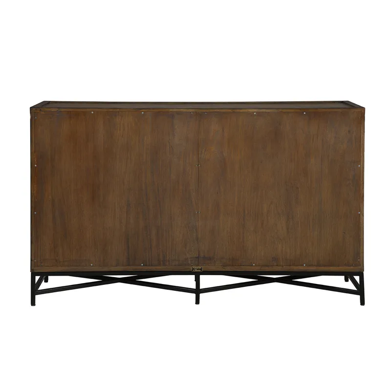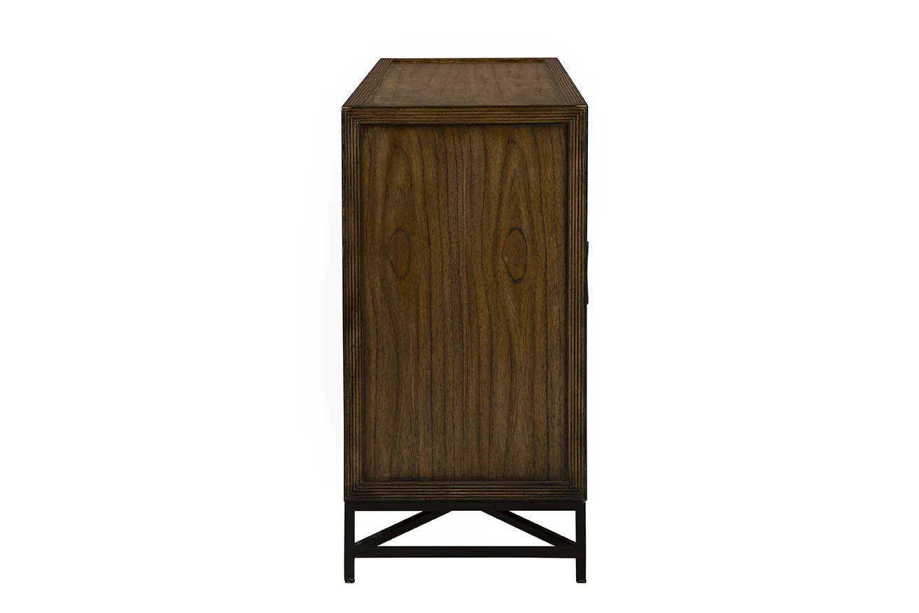 The Rouge Sideboard is a perfect blend of bold design and functionality. Featuring double cabinet doors, its front showcases unique geometric wood detailing that adds texture and visual interest. The light-toned cabinet doors create a striking contrast against the dark wood frame, while sleek metal hand pulls complete the look with a modern touch. Ideal for storage and style, the Rouge Sideboard enhances any contemporary space.