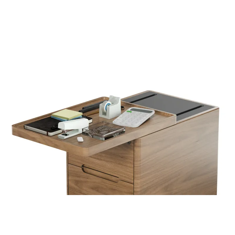 The solid wood top panel glides forward on hidden slides, providing easy access to staplers, notepads, and other desktop essentials—right where you need them.