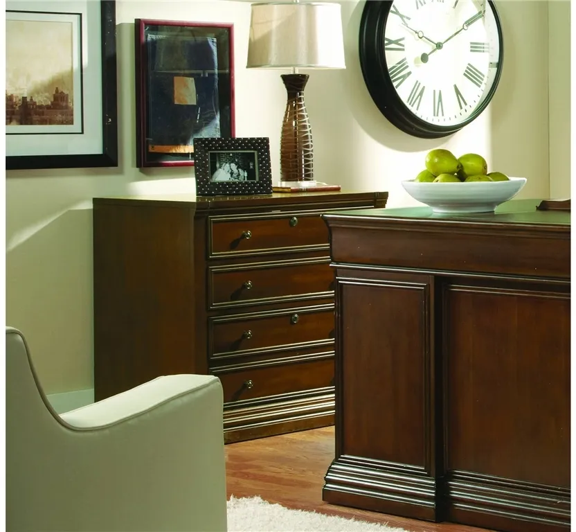 A stylish work-from-home storage solution, the Cherry Creek Lateral File has a warm Americana flavor with its lightly distressed medium brown clear cherry finish. Crafted of hardwood solids and cherry veneers, the cabinet has two locking file drawers with Pendaflex letter/legal file system on metal ball bearing slides. Anti-tilt mechanism.