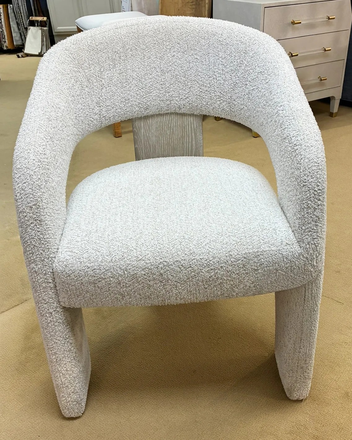 The Arcadia arm chair showcases relaxed, modern style, with an open back that curves around to form the front legs. The seat floats in the center, highlighted by a wood panel in Clay finish that crafts a third leg on the back. The wire-brushed wood complements the texture of the fabric.
