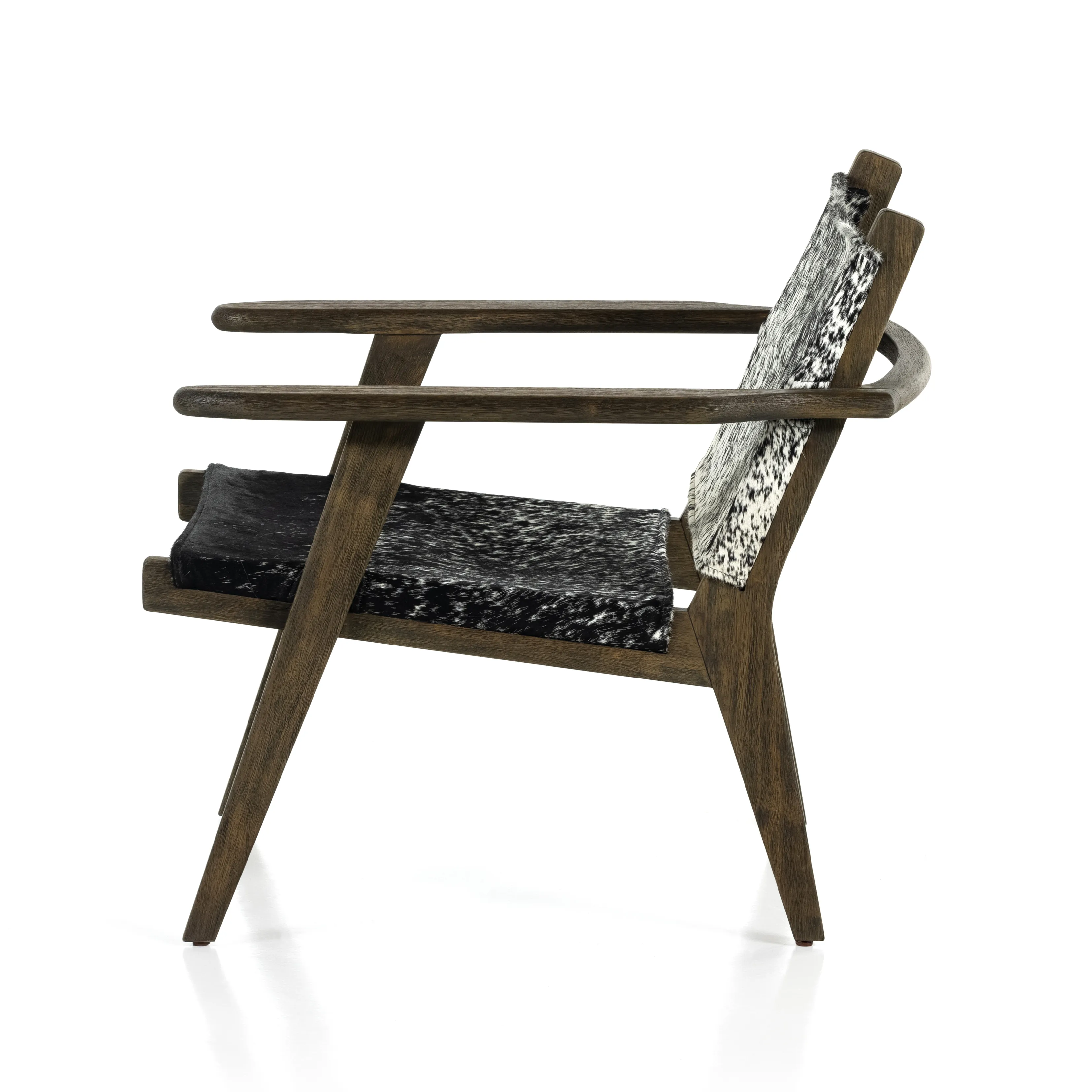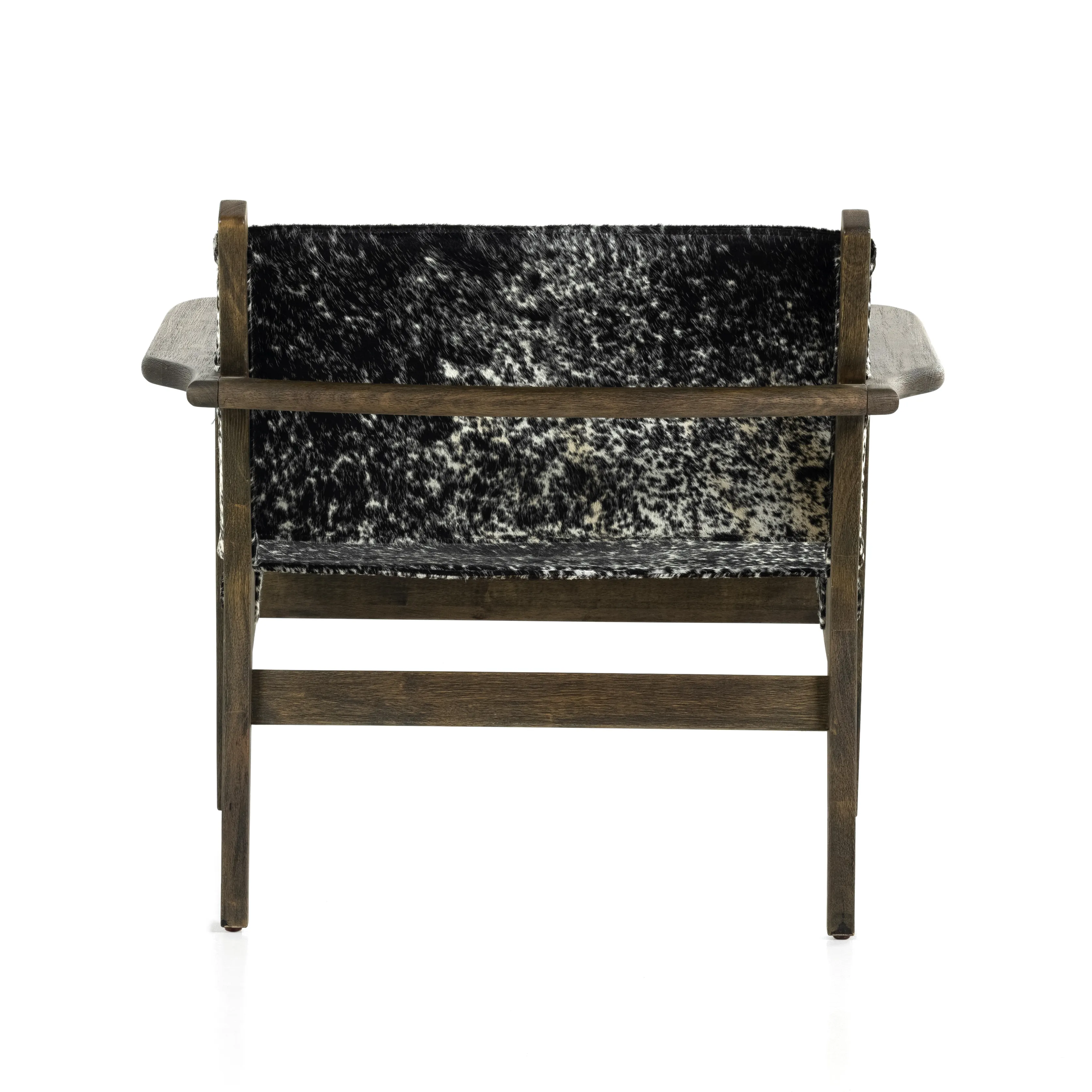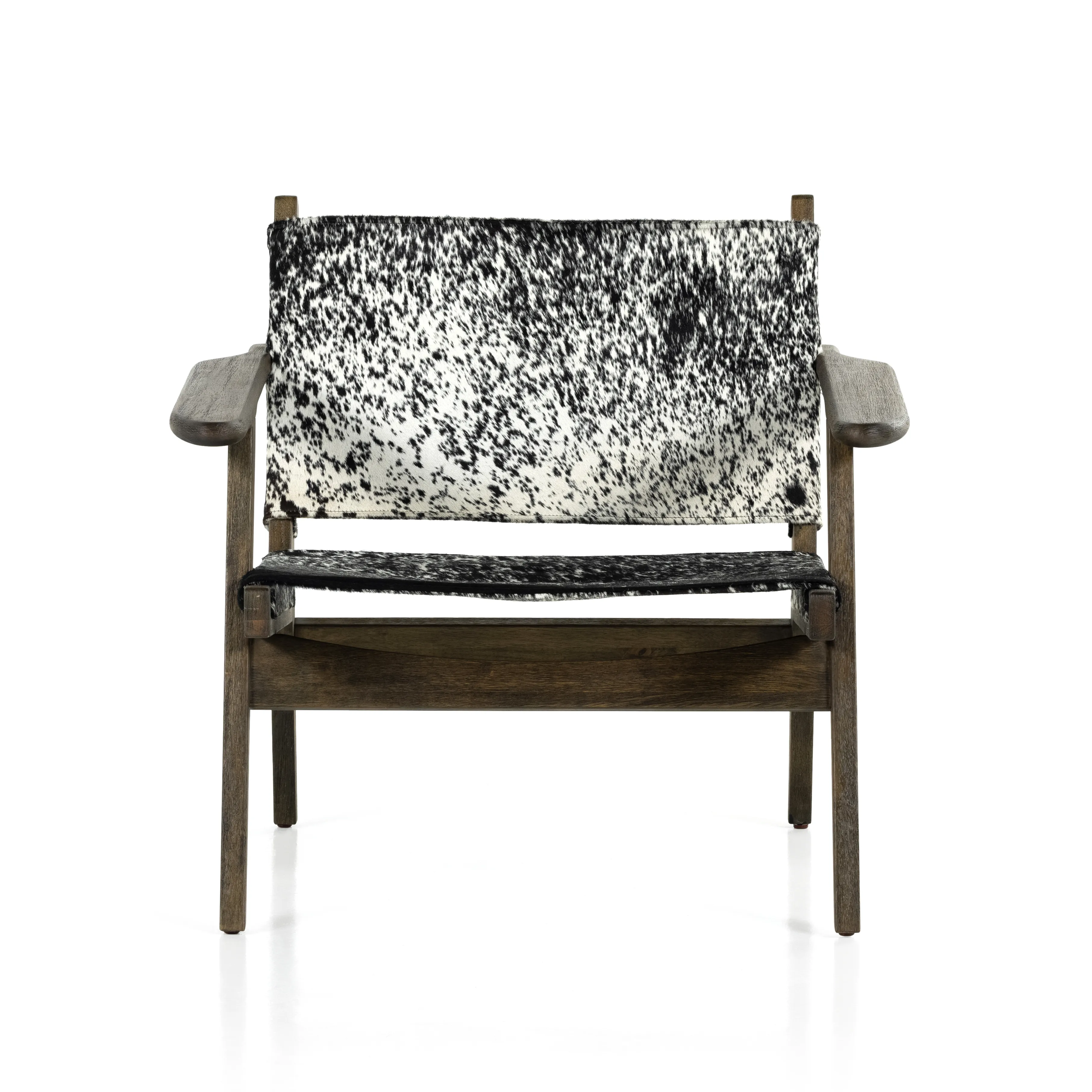 Vintage vibes, modernized. Sling seating shaped from a natural grey speckled hide is framed by solid oak. A variance in coloring and pattern is to be expected, and speaks to hides' one-of-a-kind nature.