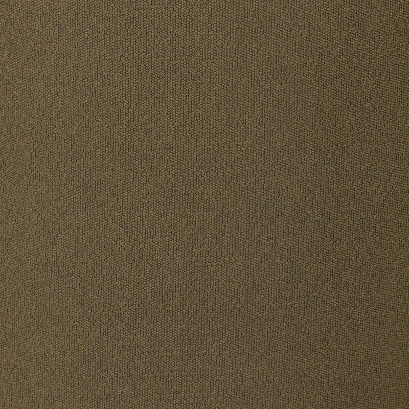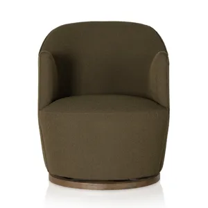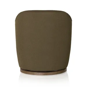 Intriguing while inviting. Drum-style seating is upholstered in a soothing and textural olive boucle. A swivel base of distressed natural parawood places a fresh spin on a feminine form. Easy to clean and made from fully recyclable materials, Fiqa fabrics are machine-washable, stain-resistant, water-repellent and antimicrobial.