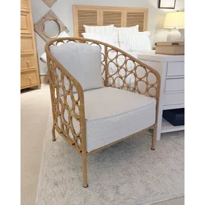 The Sullivan Arm Chair is truly a playful comfort piece, built with a scooped seat, a rattan body and cozy upholstered cushions, all atop a sleek x-shaped base.
