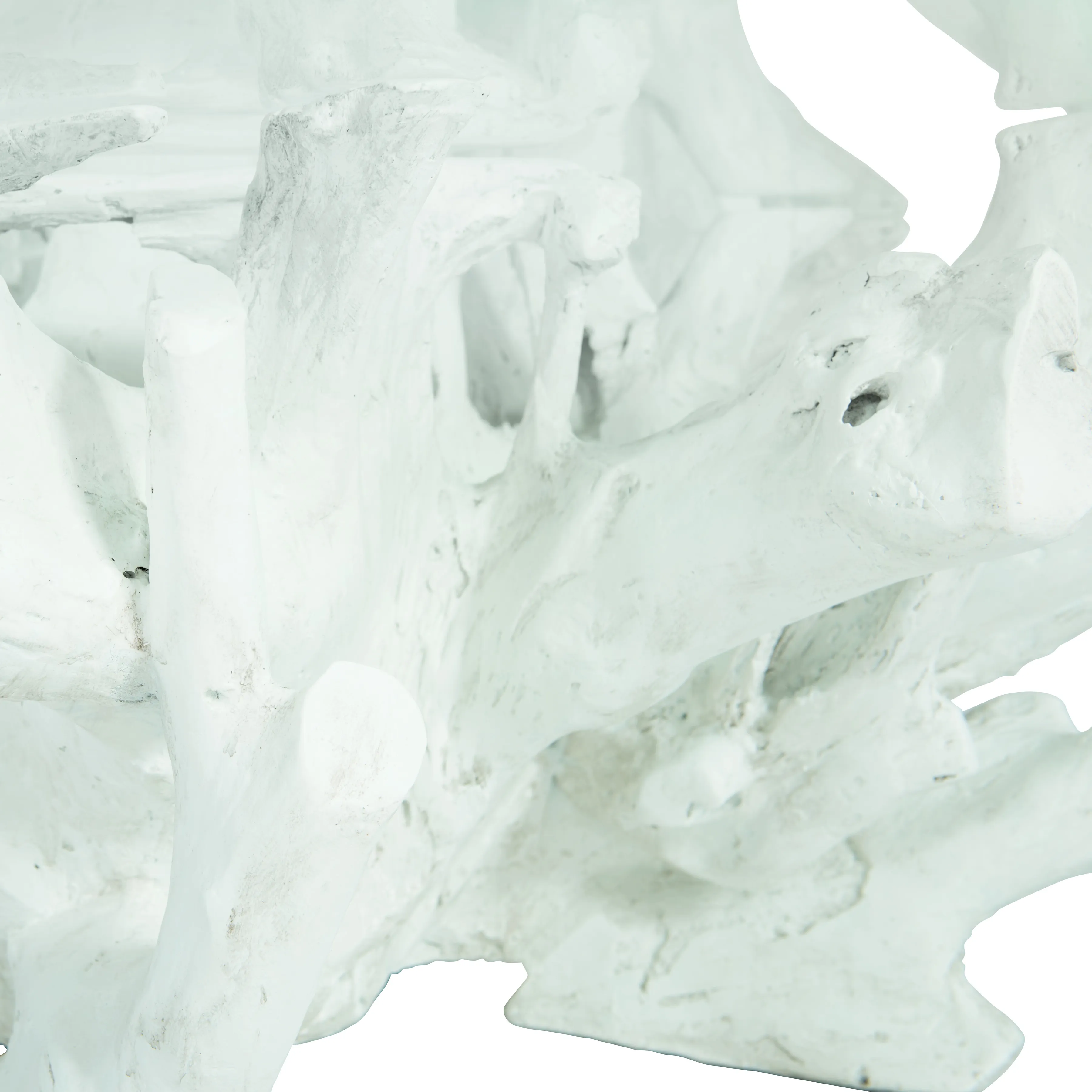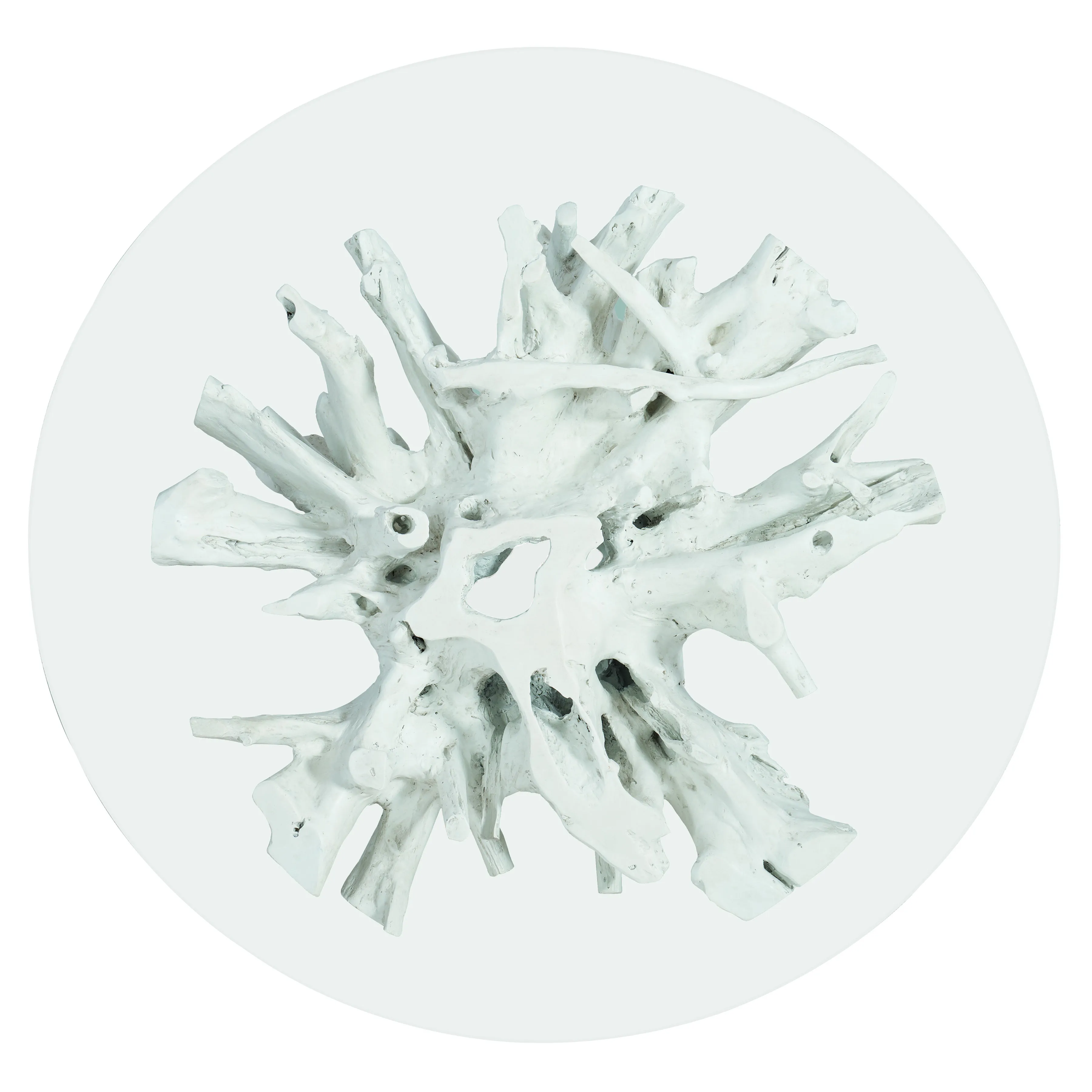 The Silvius cocktail table joins natural shapes with modern materials in an eye-catching design. A cast tree stump base supports a tempered glass top with an eased edge. A bright white finish reveals the character and beauty of the wood. The unique, organic design of this artistic table engages from every angle.