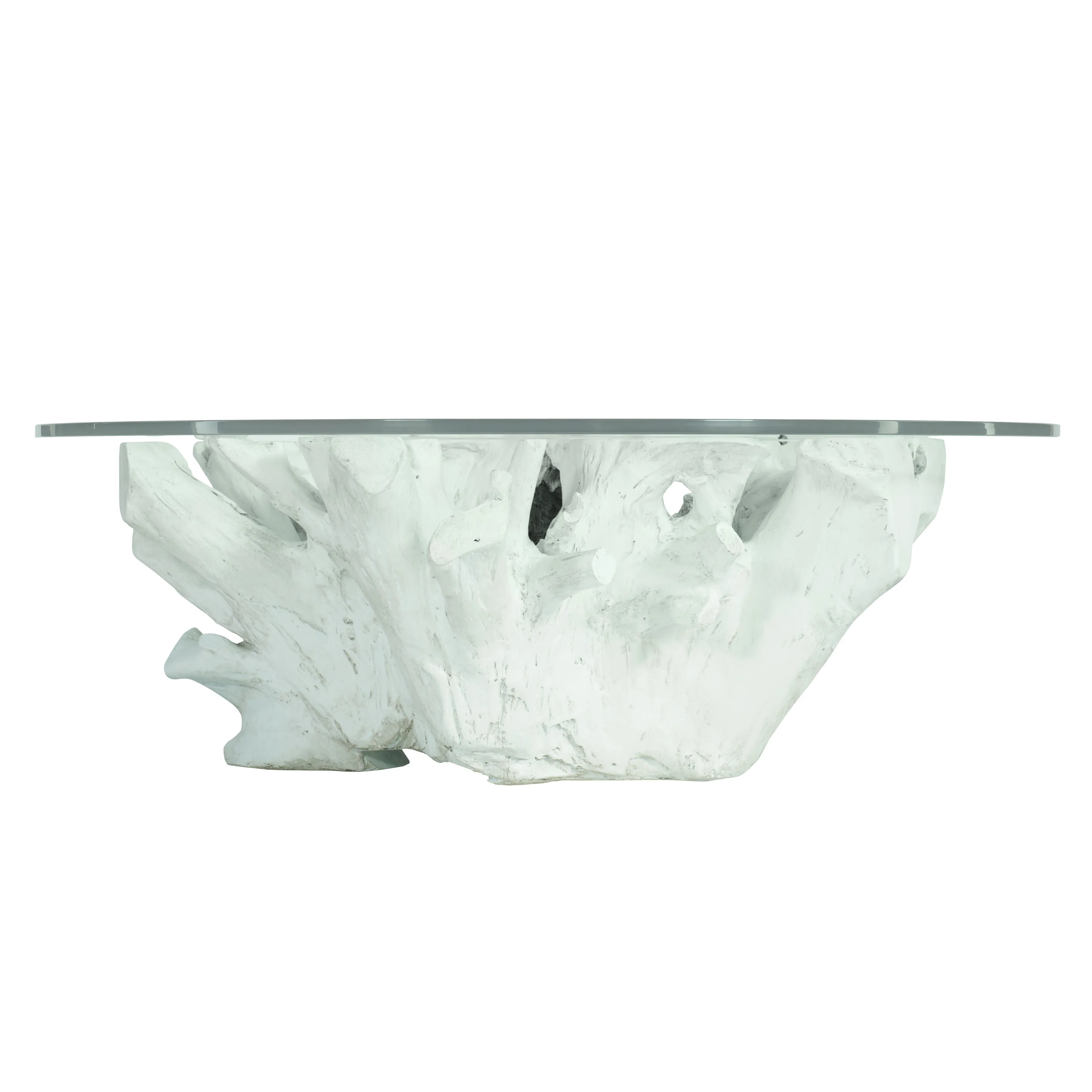 COCKTAIL TABLE TOP: Tempered Starfire round glass top with eased edge. COCKTAIL TABLE BASE: Cocktail table base in cast resin cast from a tree stump. Glazed Chalky White finish. Adjustable glides.
